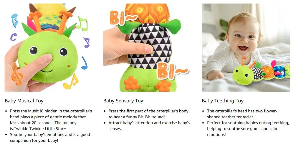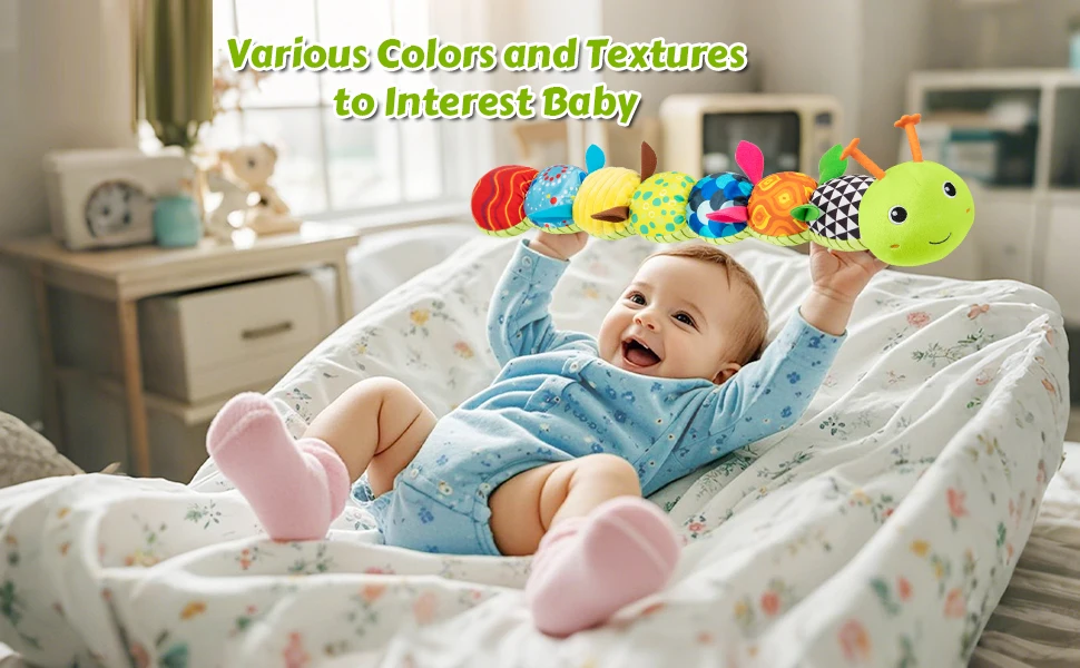 Juguetes sensoriales multifuncionales: el juguete para bebé emite 4 sonidos divertidos, incluido Music IC (con una canción), chirridos, papeles arrugados y sonajero.La cabeza del oruga tiene un IC de música incorporado que reproduce música durante unos 15 segundos cuando presiona la cabeza.Este juguete sensorial es imprescindible para la hora boca abajo y la exploración sensorial, y puede usarse para calmar a los recién nacidos.