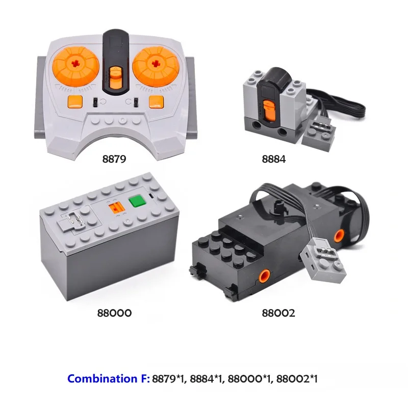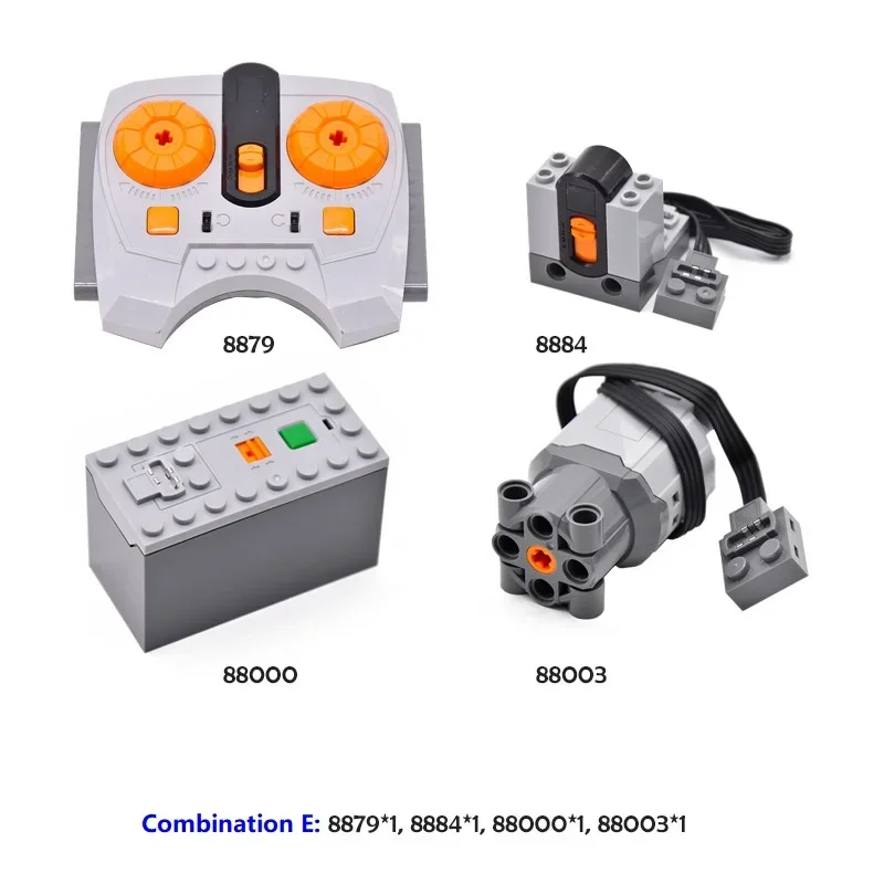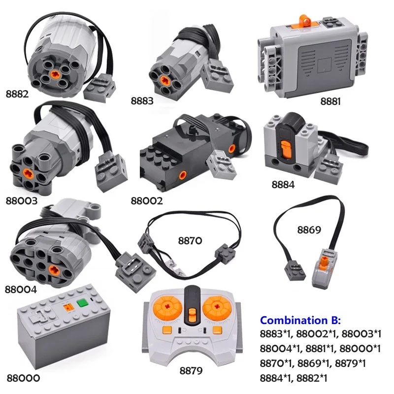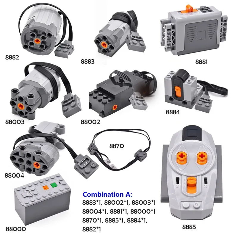 Número de modelo: M-Motor 8883, Caja de batería 8881, XL-Motor 8882, Servomotor 88004, L-Motor 88003, Luz 8870, Interruptor 8869, IR TX 8885, Control remoto de velocidad IR 8879, Motor de tren 88002, Caja de batería AAA 88000