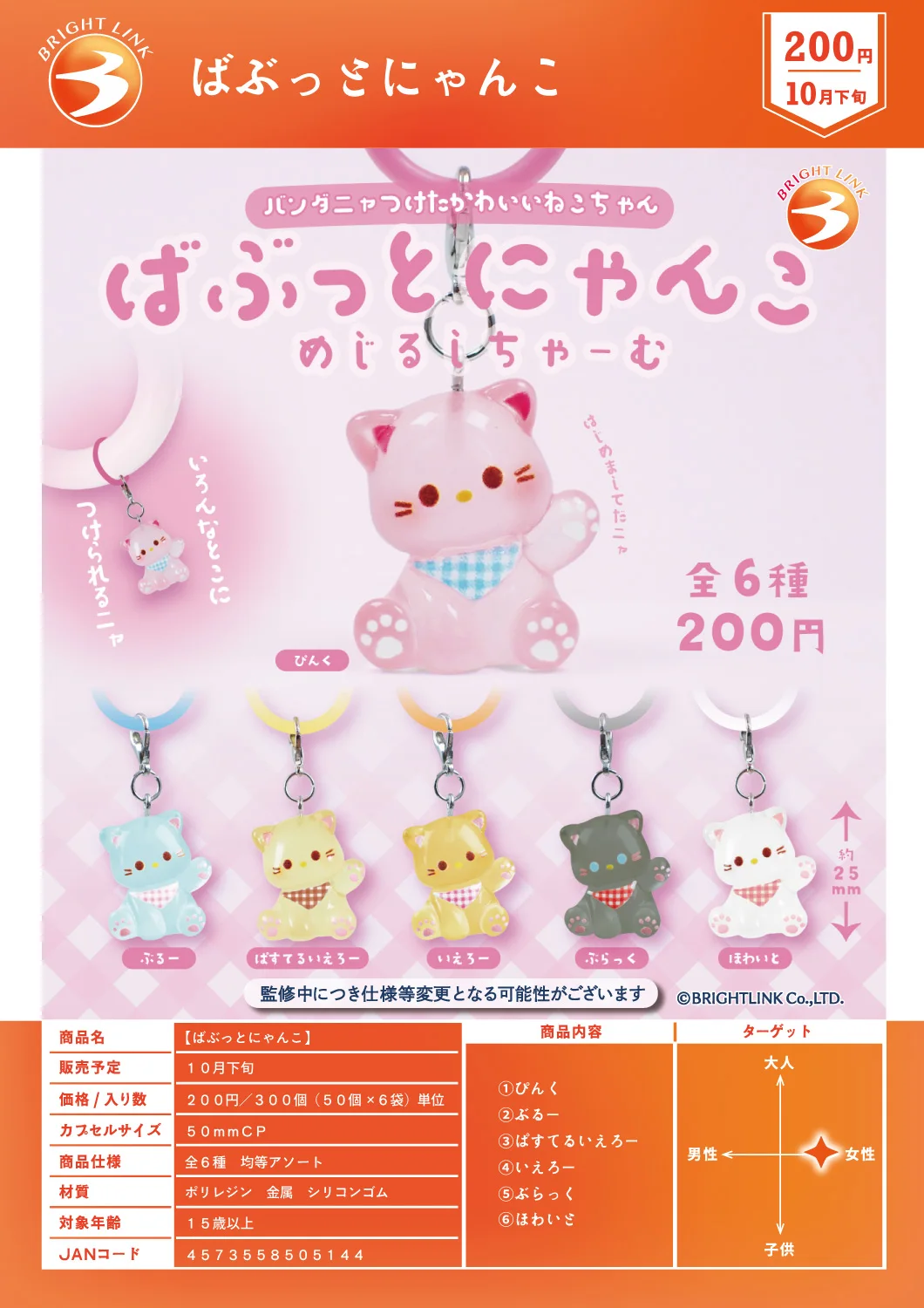 ¡Un lindo gato que lleva una bandana!♪¡La postura que inclina la cabeza es demasiado adorable!La forma redonda y los ojos redondos.Una vez que los veas, ¡querrás coleccionarlos todos!Nombre en inglés: Babutto Nyanko Mejirushi Charm Bright Link Cápsula ToyEsta serie incluye seis colores diferentes: rosa, azul, amarillo pastel, amarillo, negro y blanco.Personaje: AnimalTamaño: Aproximadamente 25 mm de longitud totalMaterial: poliresina, metal, caucho de siliconaCondición: Nuevo, incluye mini libro.*Cápsula incluida.La bolsa interior no está abierta.Categoría: GachaponJAN: 4573558505144