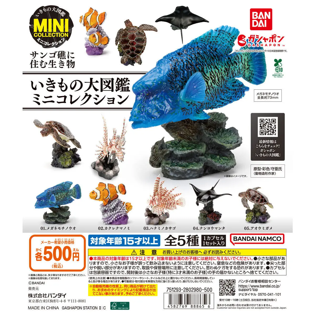 Contenido del conjunto: unidad principal Tamaño del producto: Longitud total: 40-73 mm Material del producto: Unidad principal: PVC Número de gafas: 5 1.Humphead Wrasse 2.Peces payaso 3.Lionfish Rojo 4.Alfred Manta Ray 5.Tortuga del Mar Verde Edades recomendadas: 15+