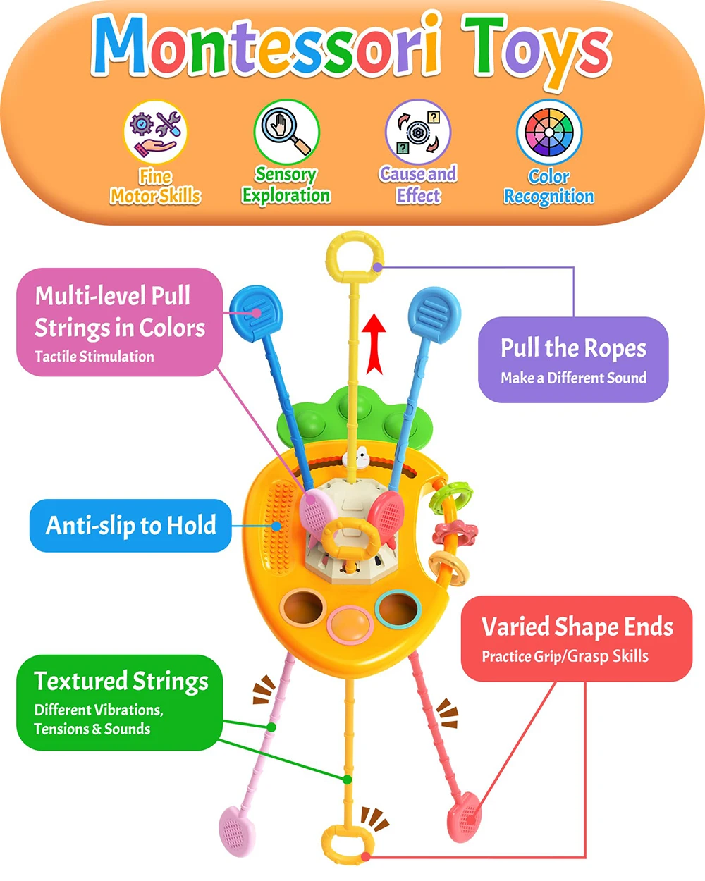Desarrolla habilidades motoras finas: hay 6 cuerdas de diferentes formas y colores, algunas son fáciles de tirar, mientras que otras son más estimulantes, que puede fortalecer mejor las habilidades motoras del bebé y mejorar su coordinación mano-ojo. Además, debido a que está configurado con diferentes niveles difíciles, los juguetes para bebés pueden mantener al bebé ocupado y entretenido durante más tiempo para explorar la causa y el efecto, que liberará a los padres del llanto del bebé y disfrutará de su tiempo en familia.
