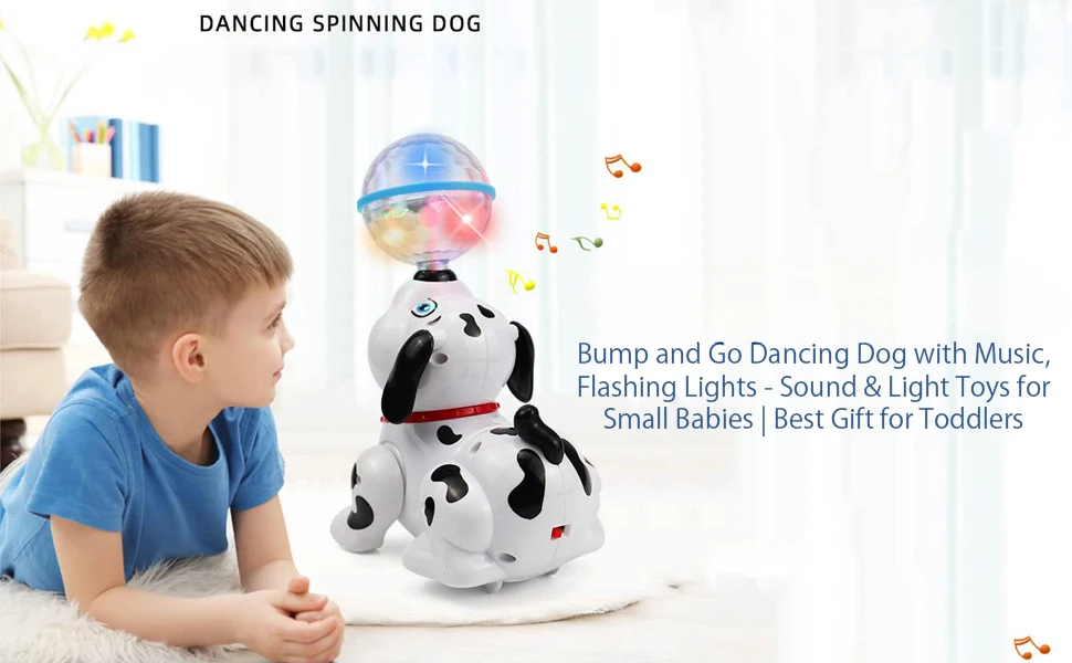 Una rueda giratoria en la base del perro le permite moverse.Cuenta con luces y música.Este lindo cachorro de juguete puede moverse con su rueda y cambiar la dirección si se encuentra con una barrera.Efecto aclarador vibrante y brillante.La altura del juguete es de unos 19 cm/7,5 pulgadas.Inserte 3 pilas AAA.Las pilas no están incluidas: este juguete es un enorme disfrute tanto para los niños como para los adultos.Acción giratoria, brazos y piernas se mueven con la canción (izquierda y derecha).La cabeza tiembla hacia adelante y hacia atrás, rotación.Cuenta con luces y música.El robot bailará al ritmo y creará un espectáculo de luces con luces intermitentes de colores que a los niños les encantará.Desde los ojos del perro hasta su pelota y su cuerpo, es altamente estimulante visualmente mostrando a su bebé un montón de colores y luces: aprenderá sobre los colores y se divertirá.Desarrolla la coordinación ojo-mano y las habilidades visuales.No tóxico: hecho de material no tóxico y 100% seguro.Este juguete es de enorme disfrute tanto para los niños como para los adultos.