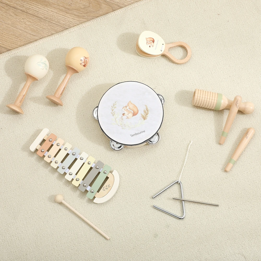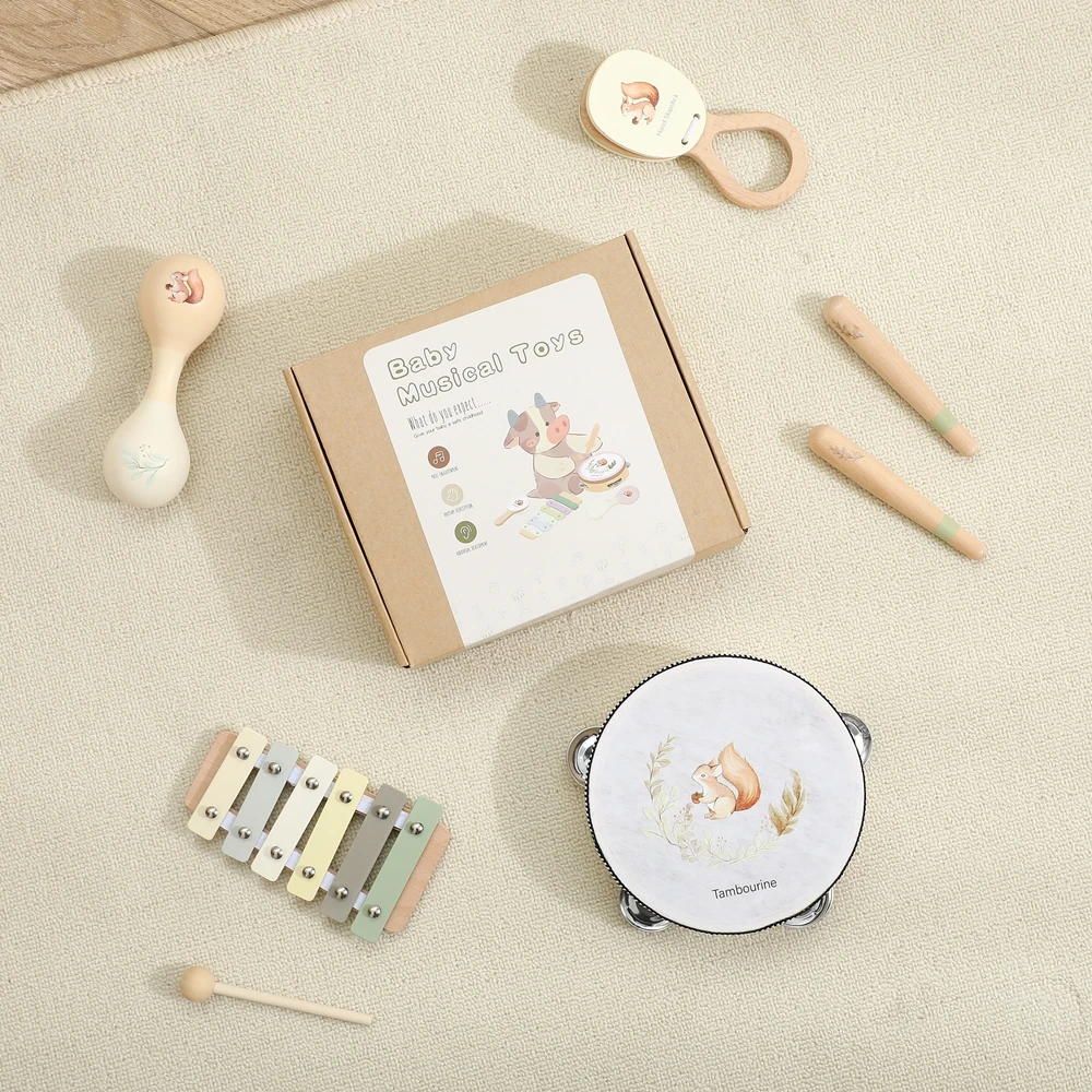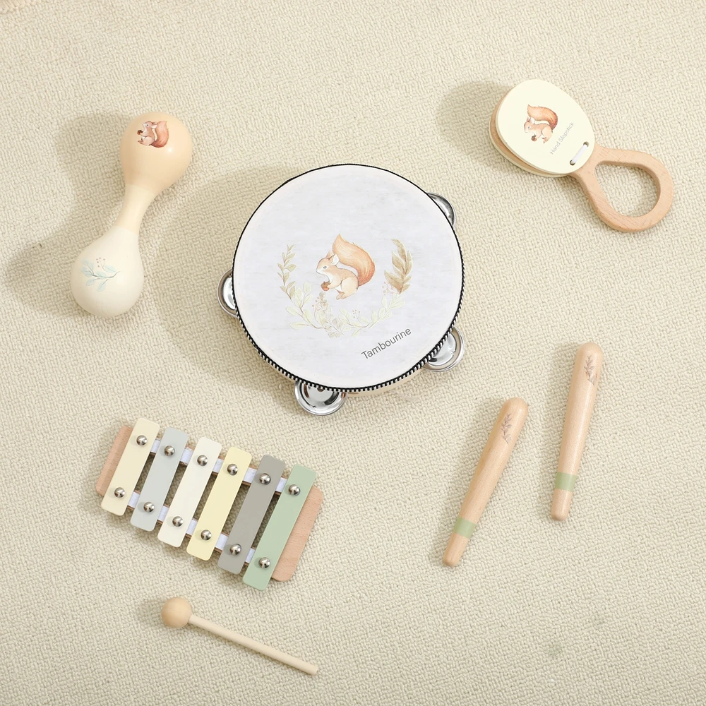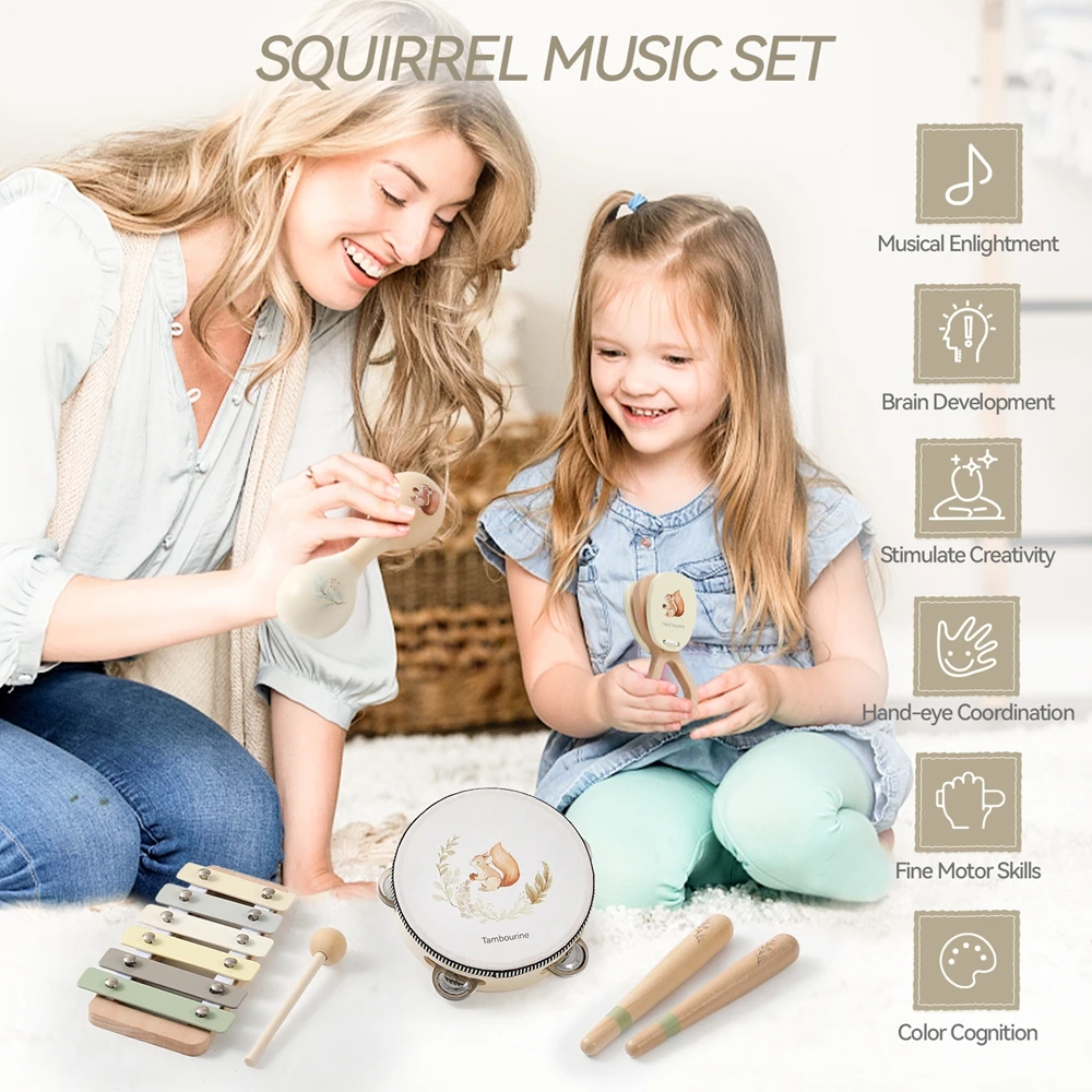 Juguetes musicales para bebés, juegos de instrumentos musicales de madera Montessori para niños, ardilla, Maracas, tambor, xilófono, Sensor de educación temprana, conjunto de juguetes