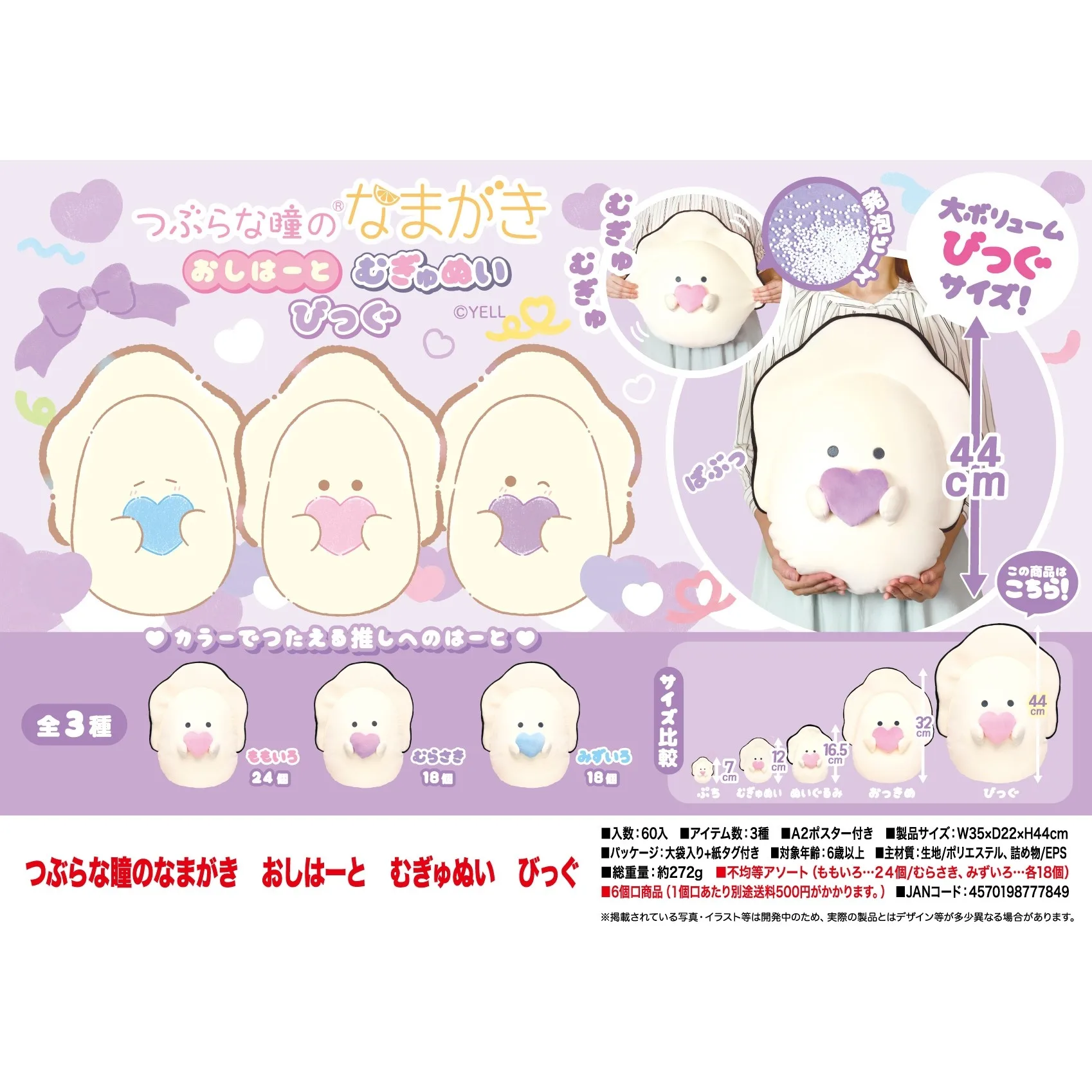 "Plushie"owie-ki con ojos redondos Oshi Heart Mugyunui Big ¡La popular serie "Nama-ki con ojos redondos Oshi Heart Mugyunui Big" está aquí! Estos son juguetes de peluche de Ita-ki sosteniendo lindos "corazones" en sus manos. Los corazones vienen en tres colores populares: "rosa", "púrpura" y "azul claro"! El diseño "mugyunui" contiene cuentas de espuma, lo que lo hace extremadamente suave al tacto. ¡El "talla grande" mide unos 44 cm! ¡Disfruta al máximo de la sensación de mugyumugyu! "Juguete de peluche" Oyster con ojos redondos Osmo Heart Mugyunyu Big