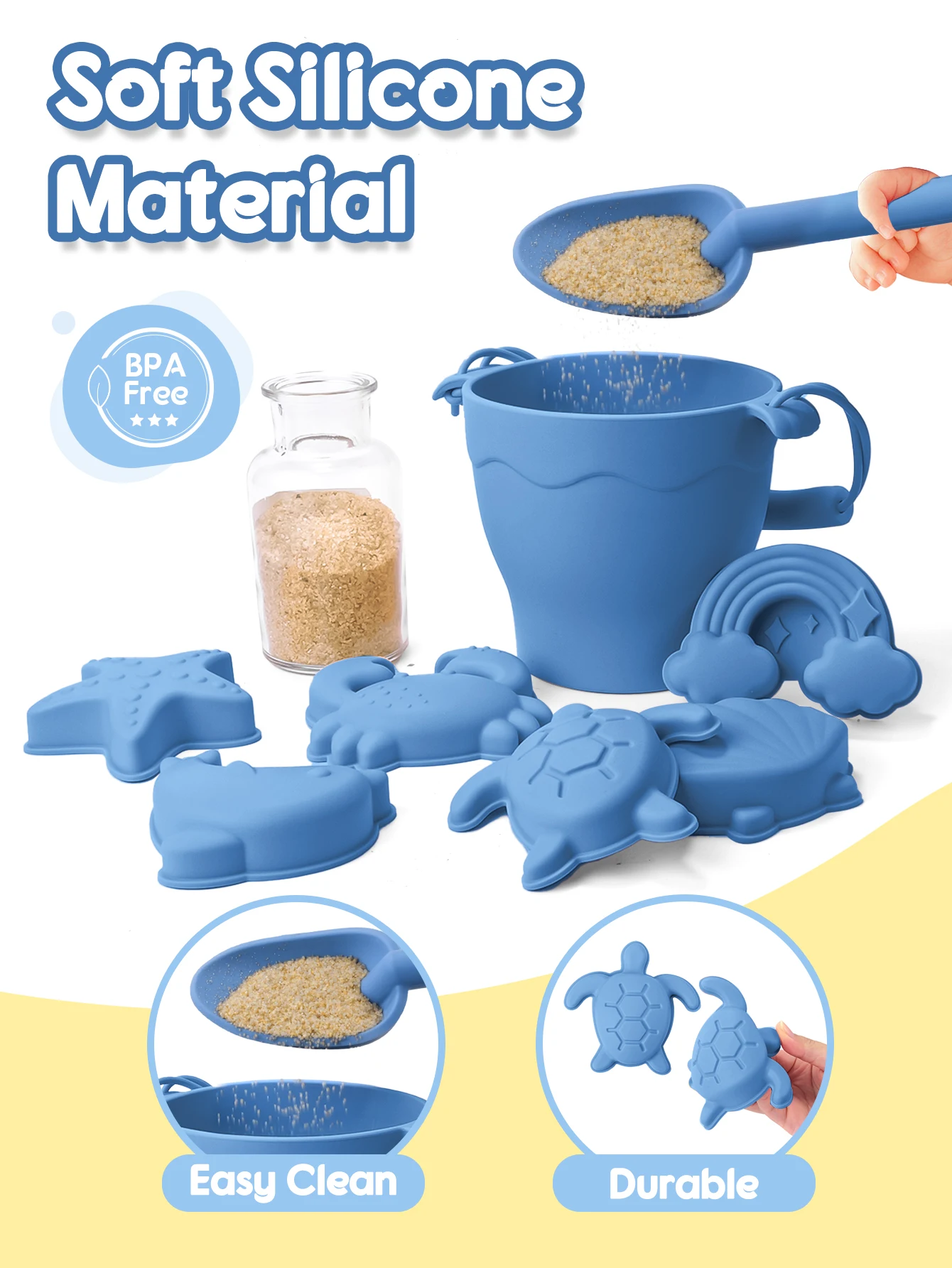 Juguetes de playa sin BPA para niños, 8 piezas de silicona de grado alimenticio, divertidos juguetes de verano para exteriores con cubo, juego de arena de 4 colores