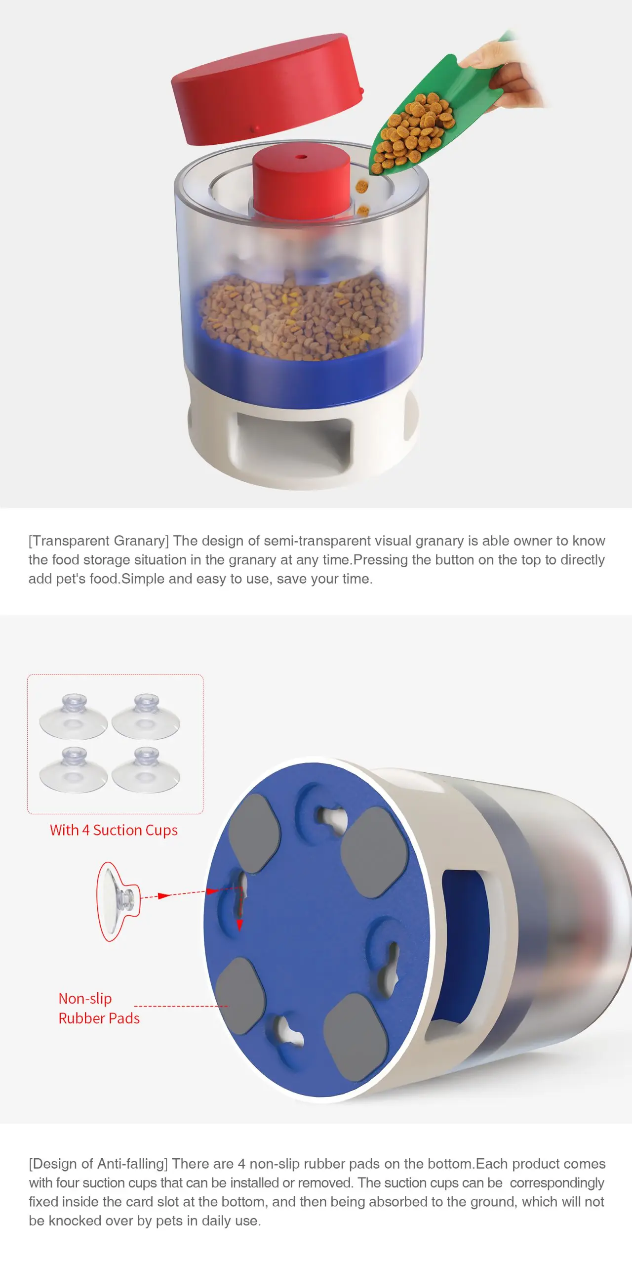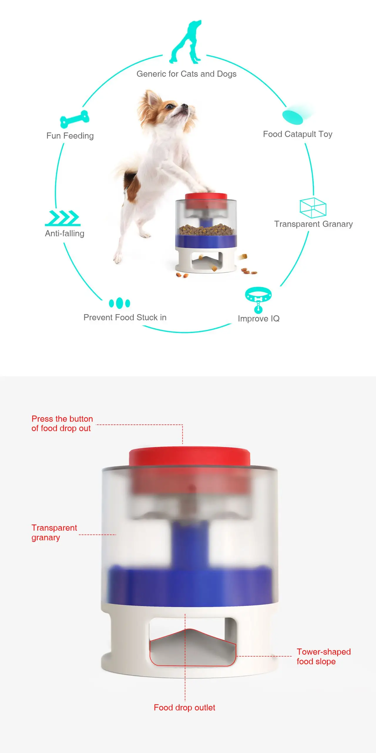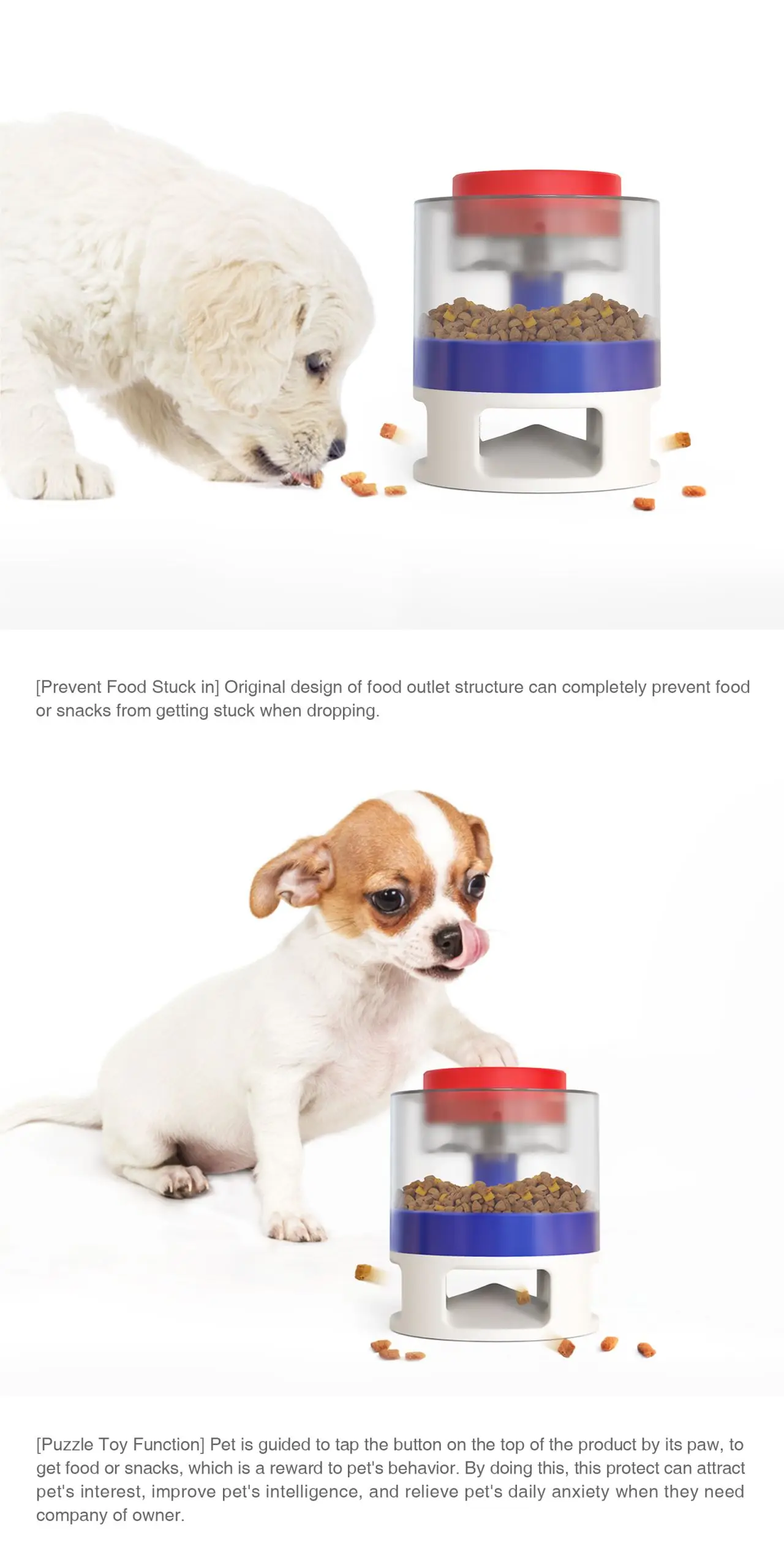 By tapping the top of the feeder, food gets dispensed & randomly drops to 4 direction via the leakage channels at the bottom. This performs as a behavior reward for your pet, attracts the dog's attention, improves dog's intelligence and in the mean time keeps your god moving all the time, reduces risk of obesity & mental decline.