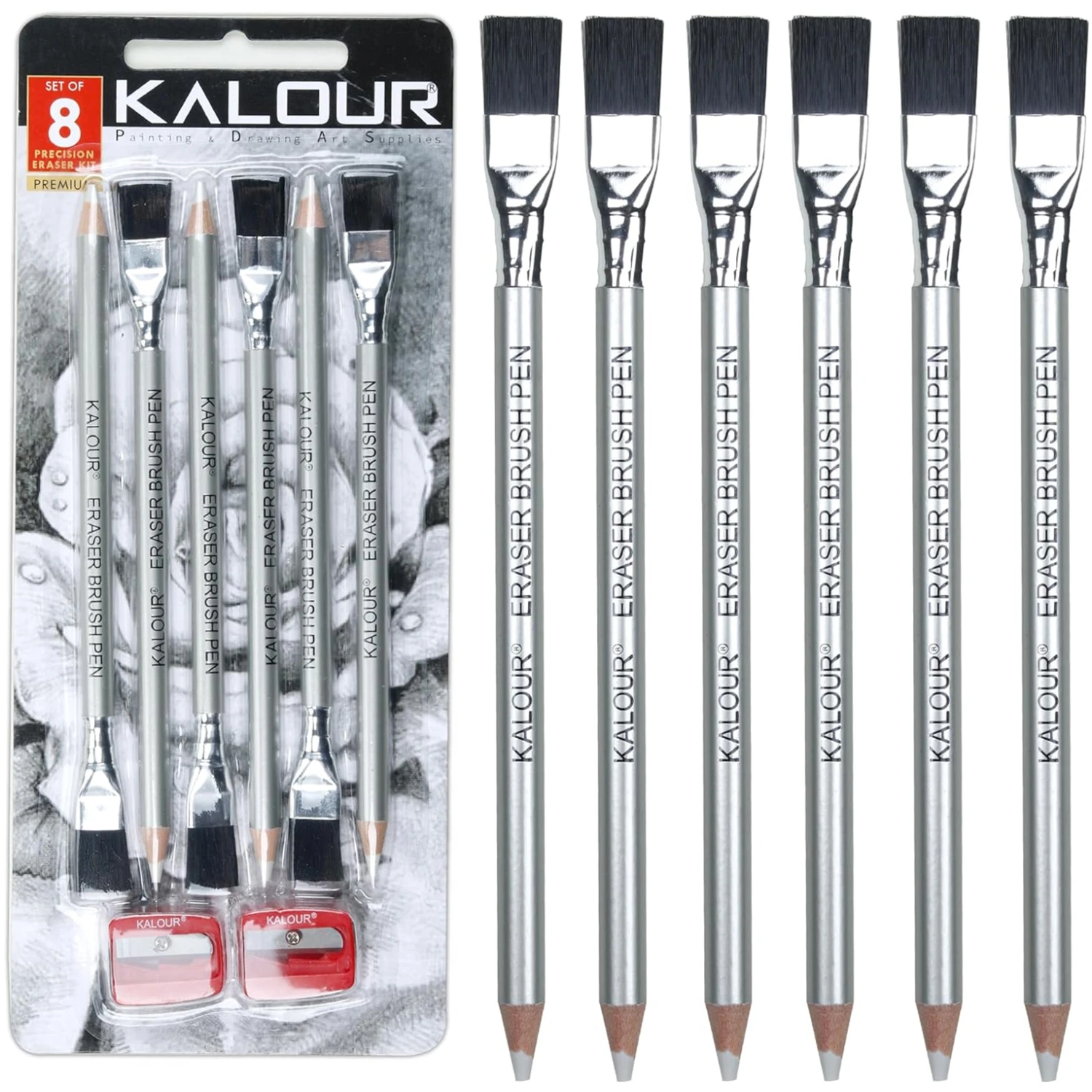 Lo que obtienes: 6 lápices borradores con pincel, 2 sacapuntas.