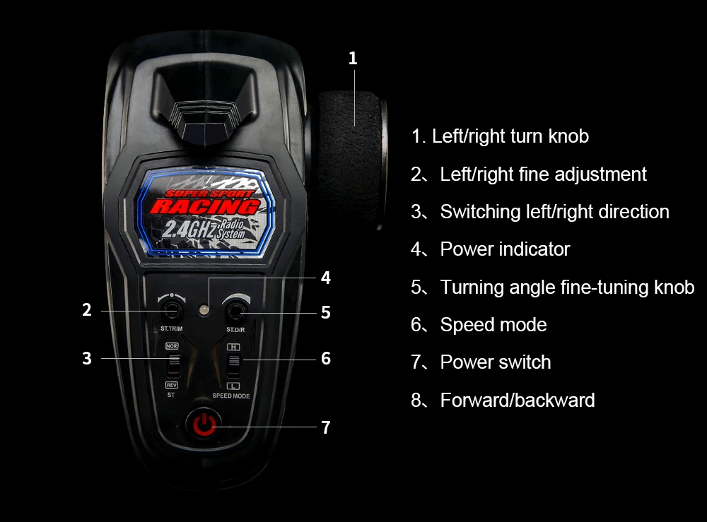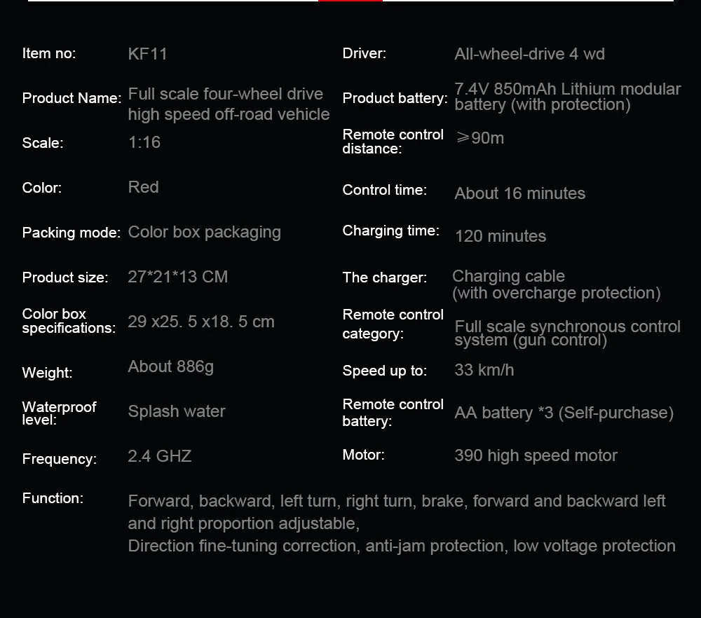 Función: avance, retroceso, giro a la izquierda, giro a la derecha, freno, avance y retroceso, relación izquierda y derecha ajustable, corrección de ajuste de dirección fina, protección anti-tarjeta, protección de bajo voltaje