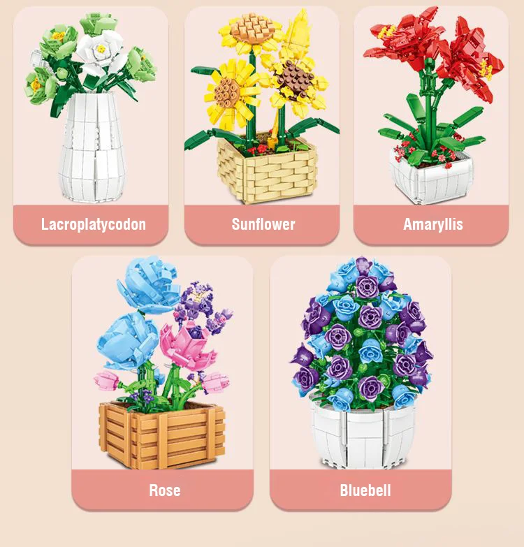 Mini ladrillos de colores vivicl inspirados en flores reales Lavencler, RoSe, Camellia y rasses.