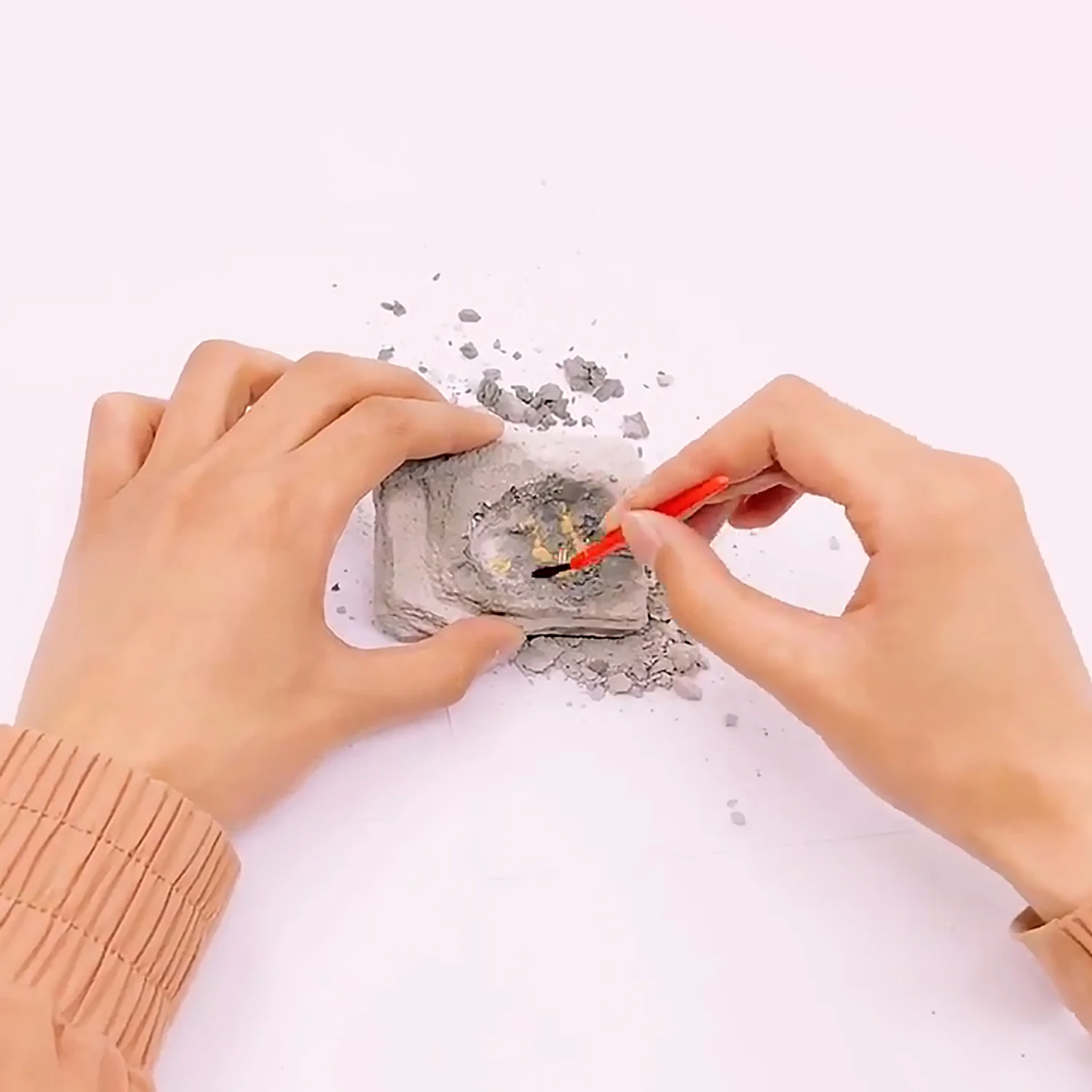 1. Antes de comenzar la excavación, prepare un pedazo de papel debajo del bloque de yeso para evitar que el polvo de yeso se disperse durante la excavación. Luego use un palo de bambú para cavar suavemente la superficie del yeso y comience a cavar.