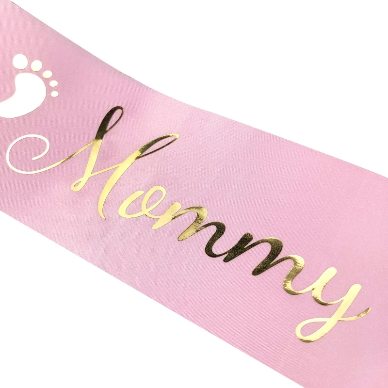 Faja de satén de primera calidad con letras 'Mommy to Be' y pies de bebé con estampado de lámina dorada.Talla única.Con 63 pulgadas de largo y 3,7 pulgadas de ancho, la faja tiene el largo perfecto y se adapta a la mayoría de las mamás.