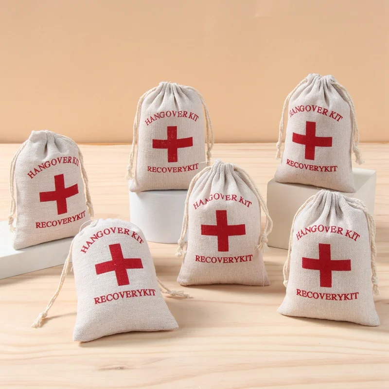 Comprar Kit de primeros auxilios para la resaca, bolsas de algodón para dulces, Kit de herramientas de Cruz Roja de emergencia, bolsa de lino con cordón para regalo de boda y fiesta, 6 unidades por lote