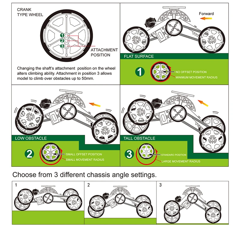 3. Este es un dispositivo modelo de tracción en las cuatro ruedas, que puede usar las ruedas que se mueven verticalmente en las cuatro esquinas para avanzar, y puede escalar fácilmente obstáculos de 50mm de altura.