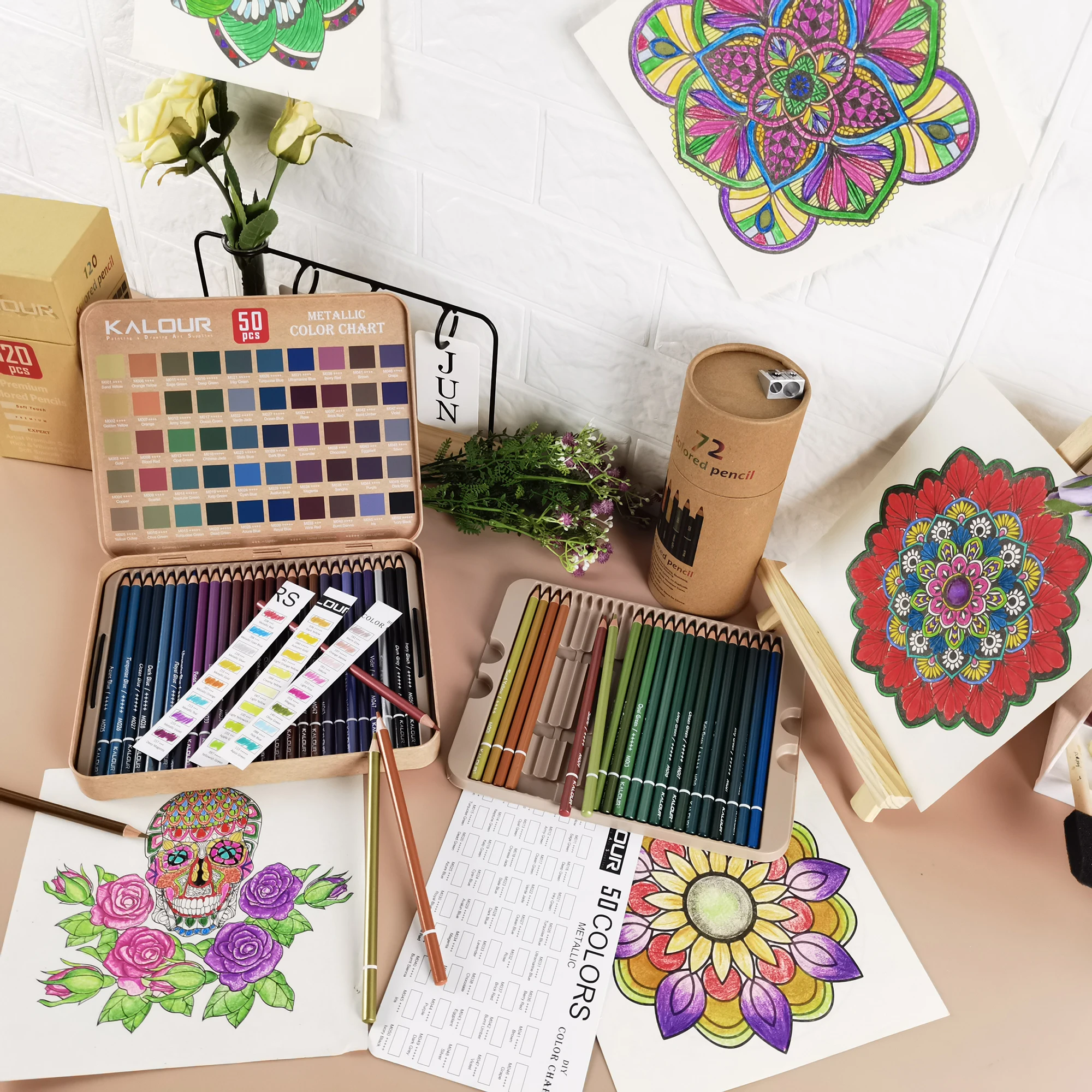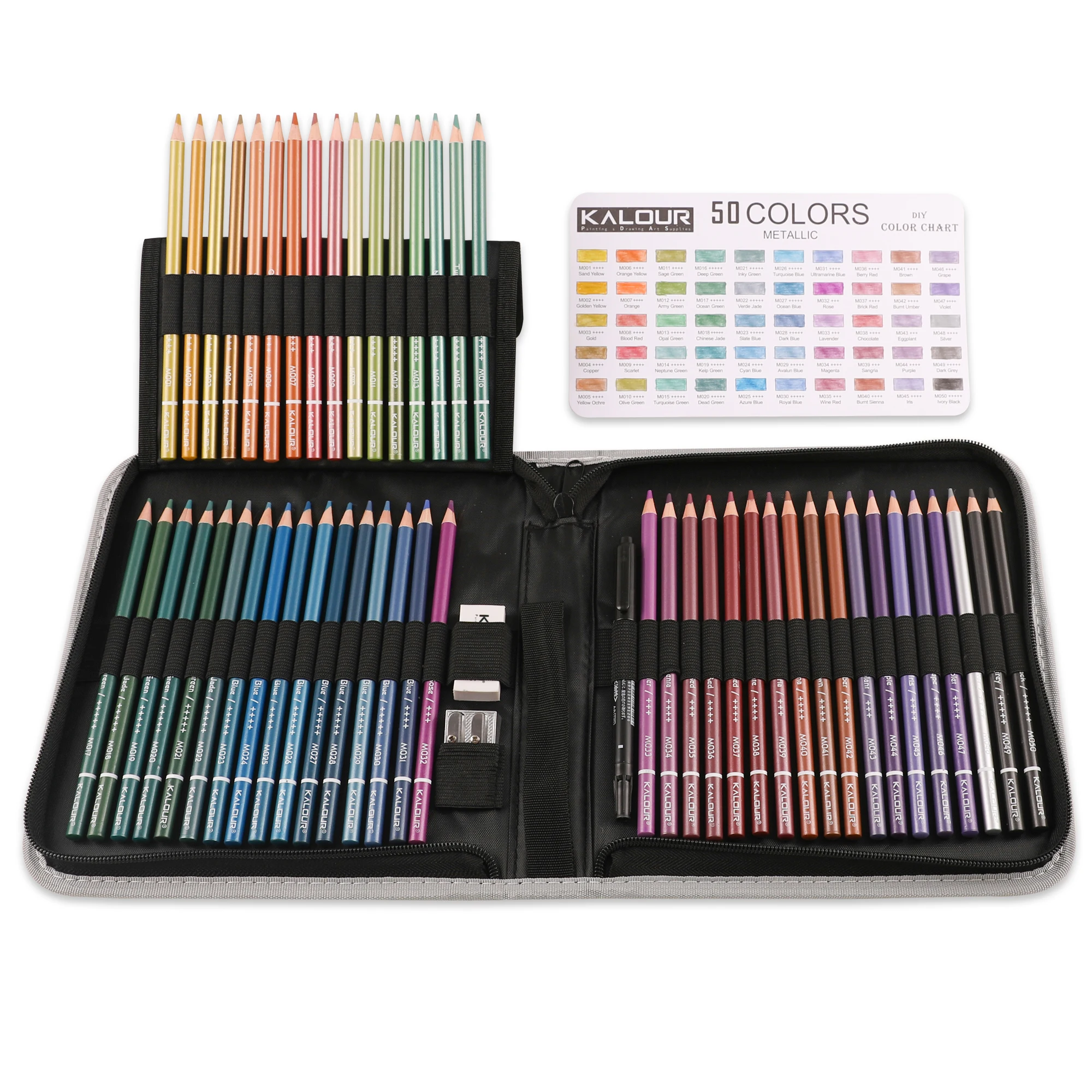 KALOUR Lápices de colores Suministros de arte para dibujar Colores vibrantes Núcleo suave 54 piezas 50 colores Lápiz de color metálico en estuche de nailon con cremallera