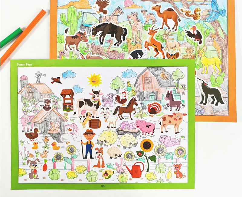 Libro 2 en 1 que combina juegos de pegatinas creativas y aventuras de coloración, con 10 escenas únicas y más de 200 pegatinas reutilizables.