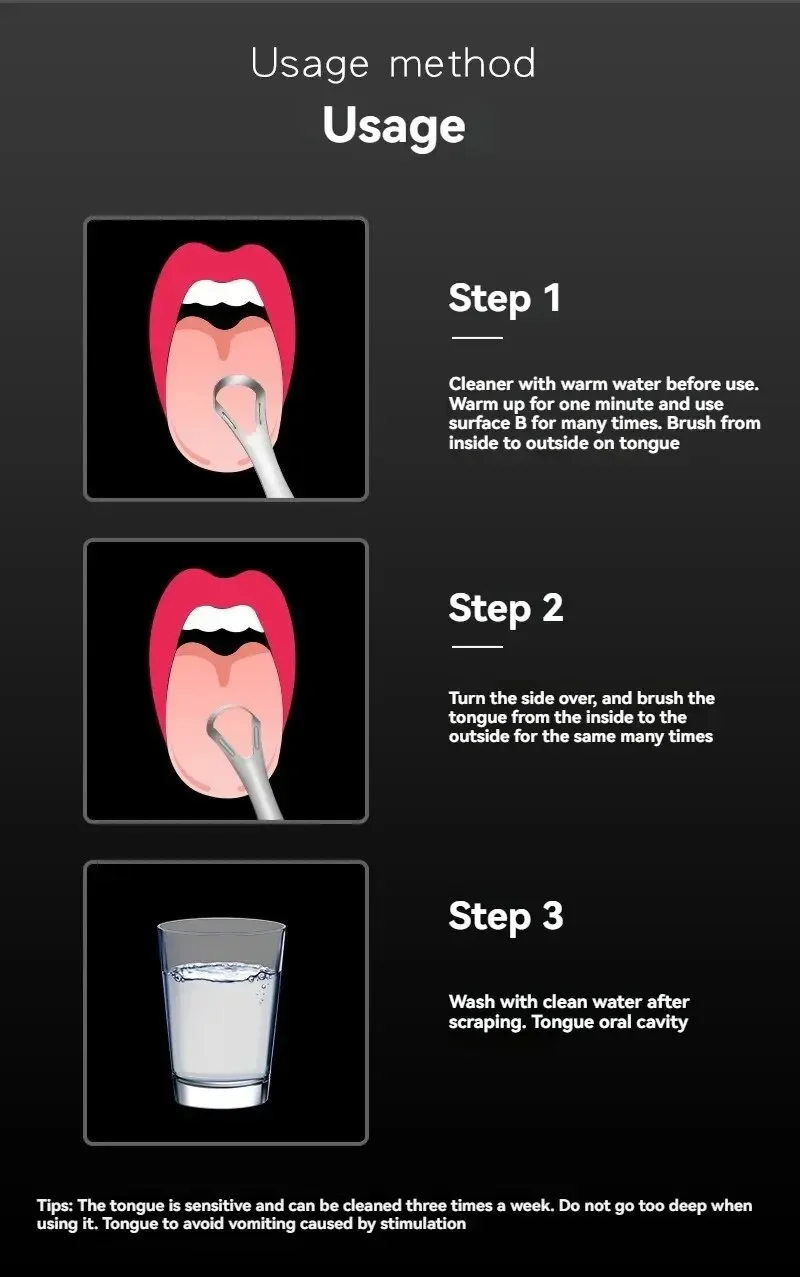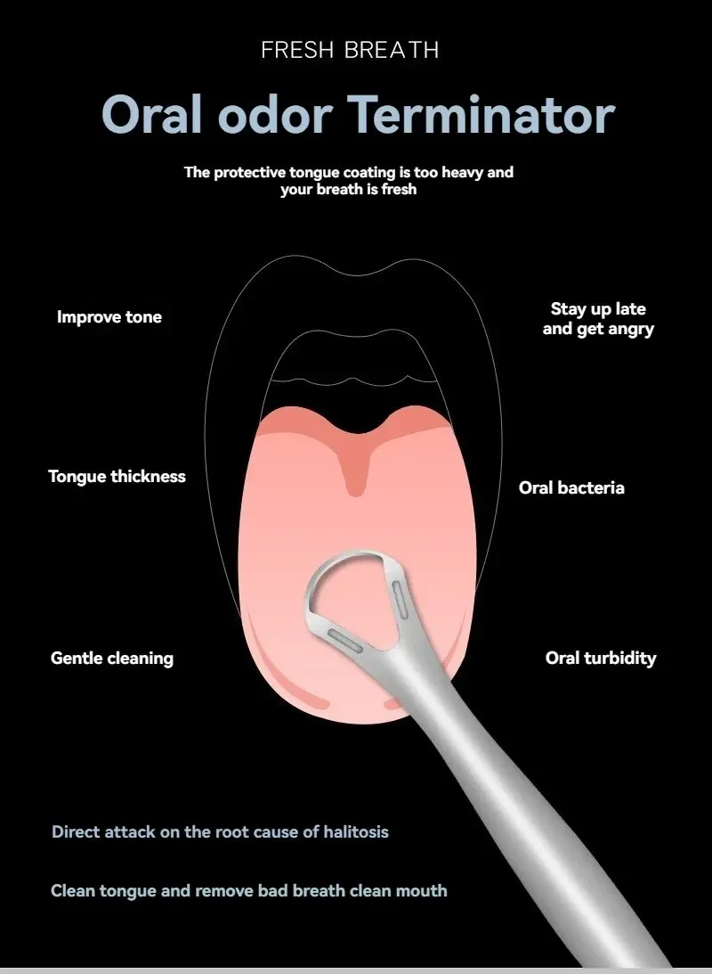 • Compacto y portátil:Su tamaño compacto hace que sea fácil de transportar, permitiéndole mantener la limpieza de su lengua dondequiera que vaya.