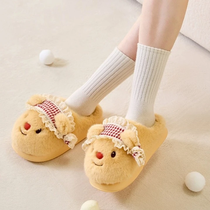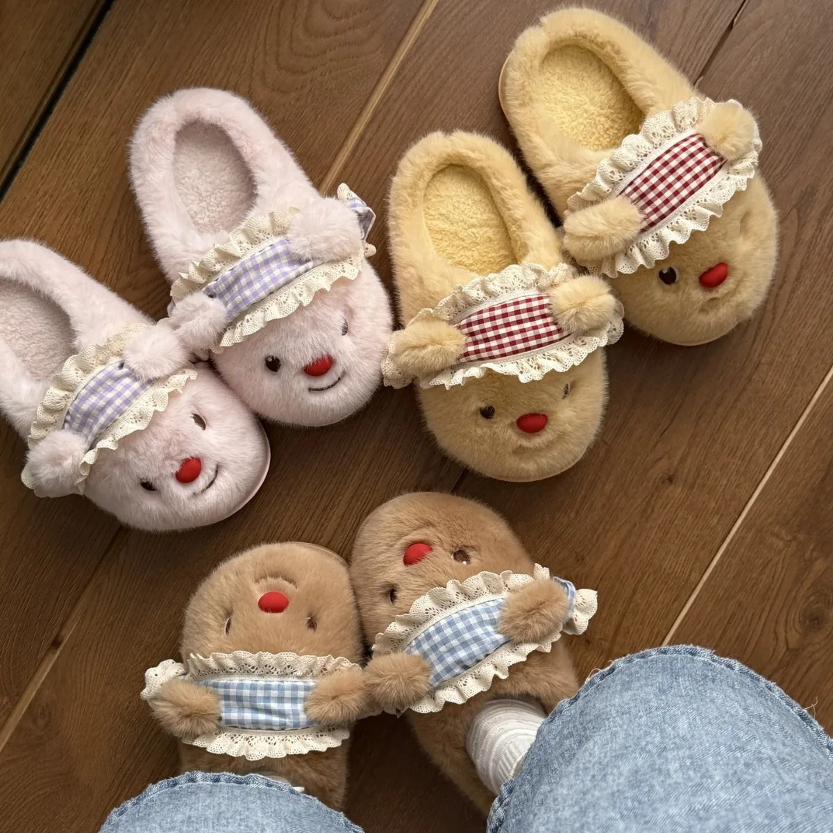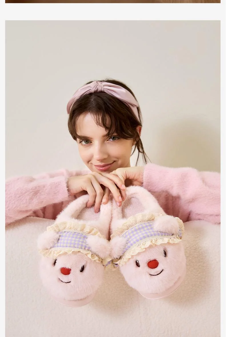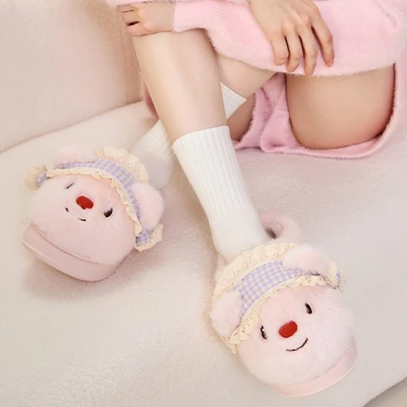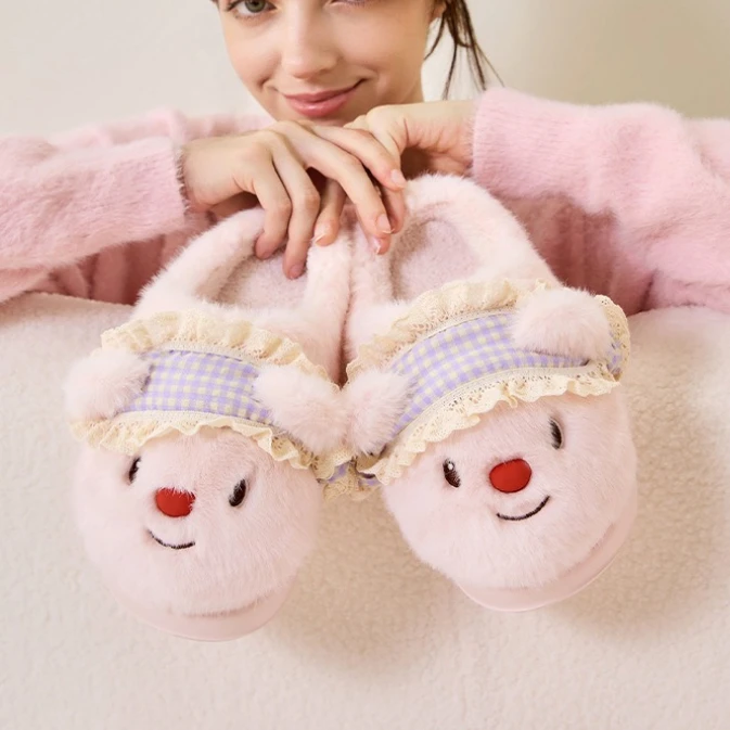 Lindas zapatillas de felpa de dibujos animados para mujer en otoño e invierno, nueva casa interior antideslizante, cálidas con zapatillas de felpa añadidas