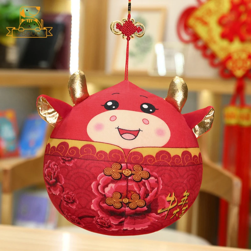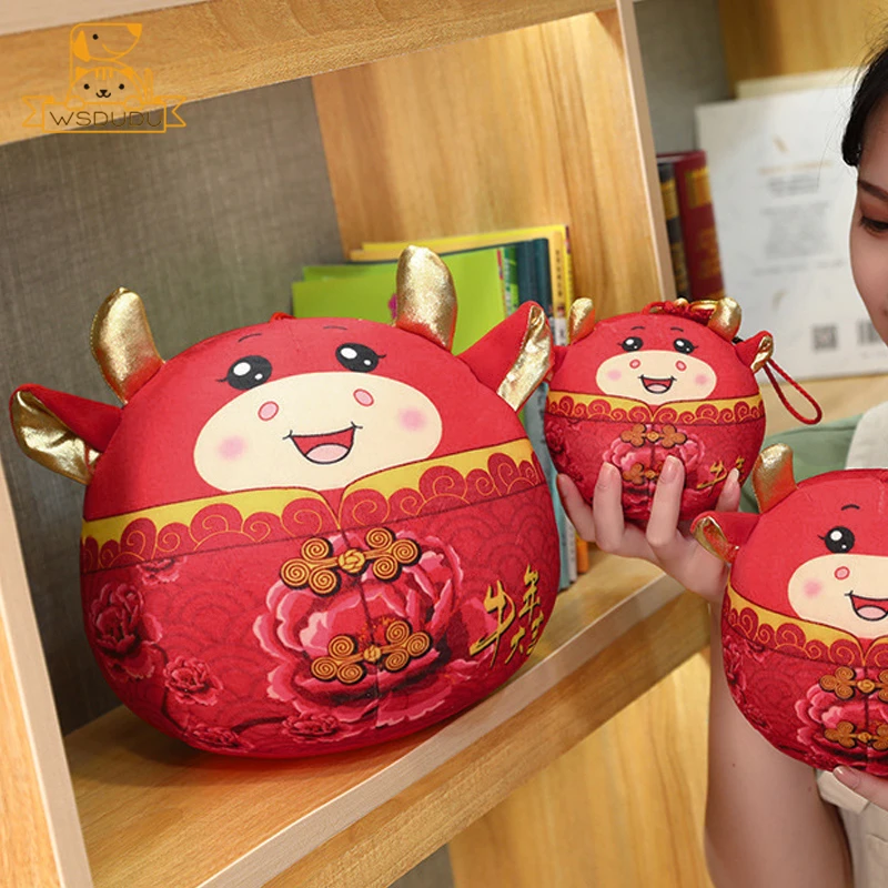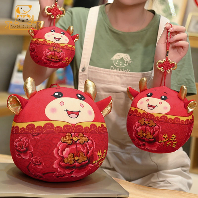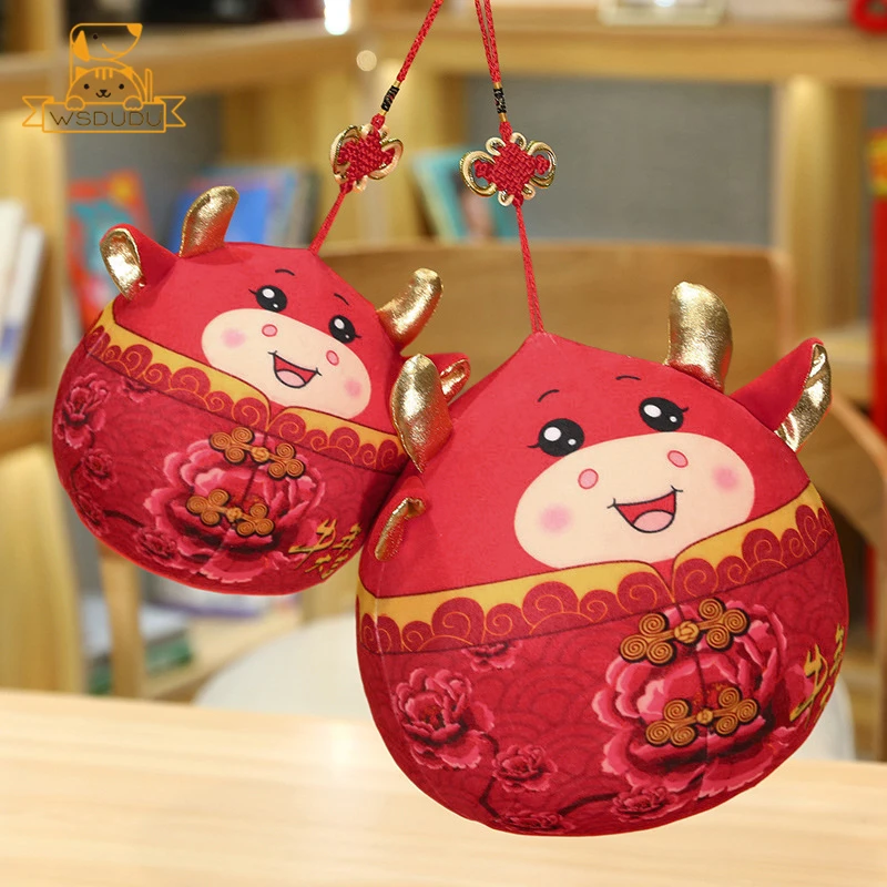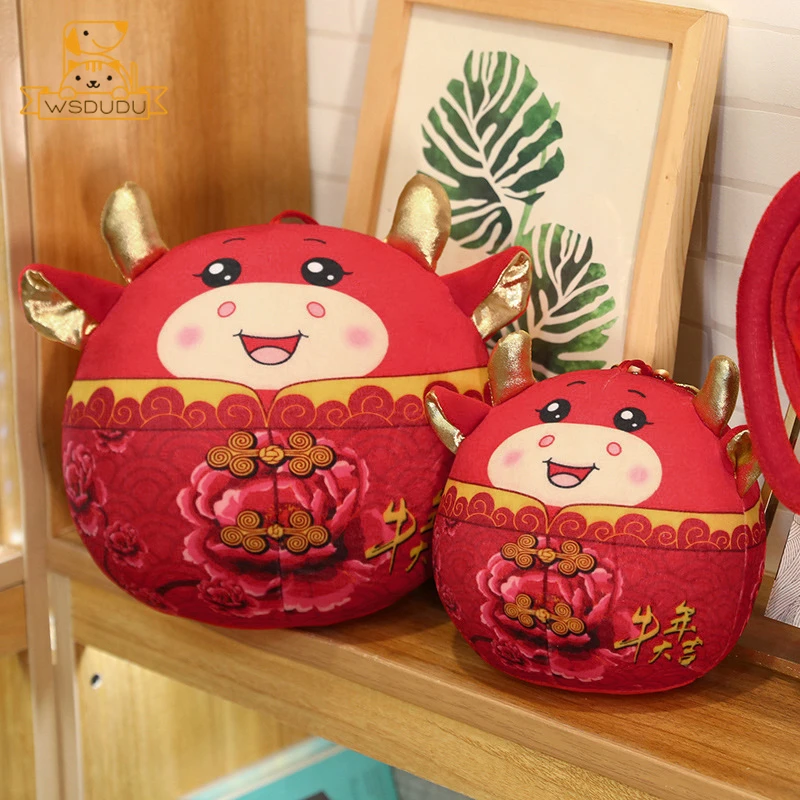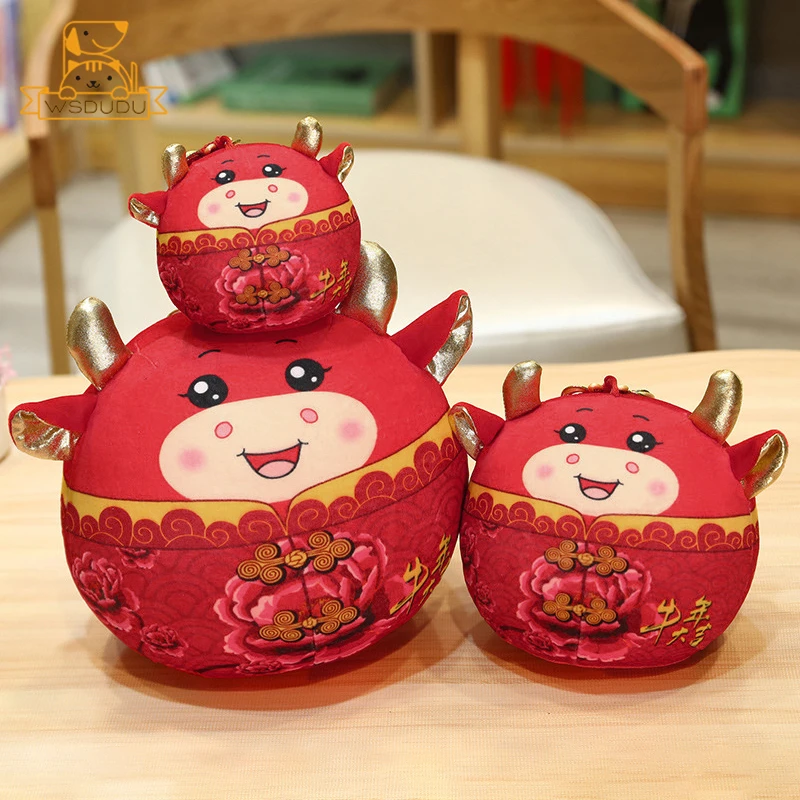 Comprar Lindo ganado de peluche de juguete rojo de dibujos animados redondo Animal buey muñeco de peluche con anudado chino Kawaii Toro decoración suave regalos para niños