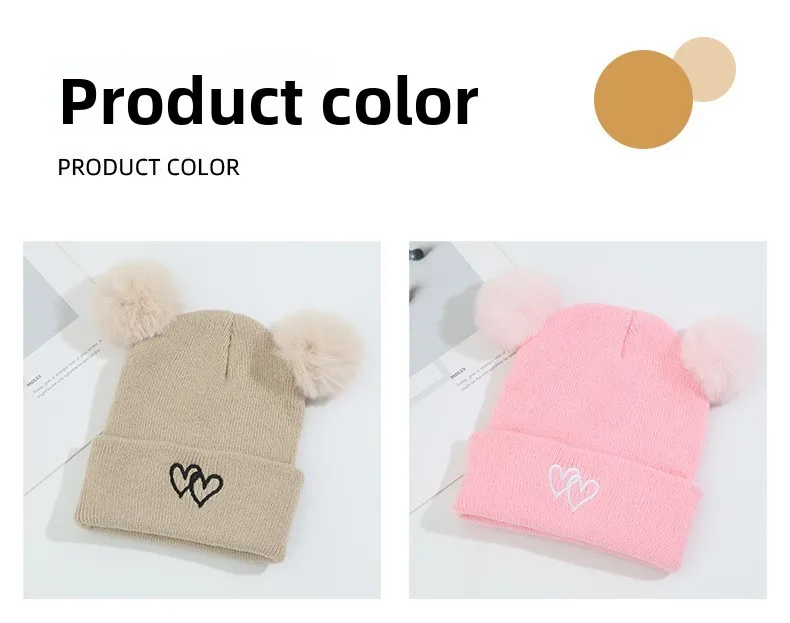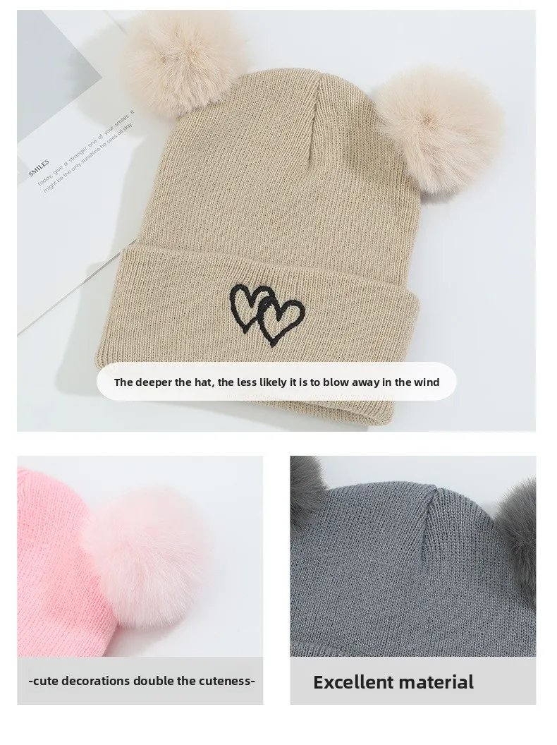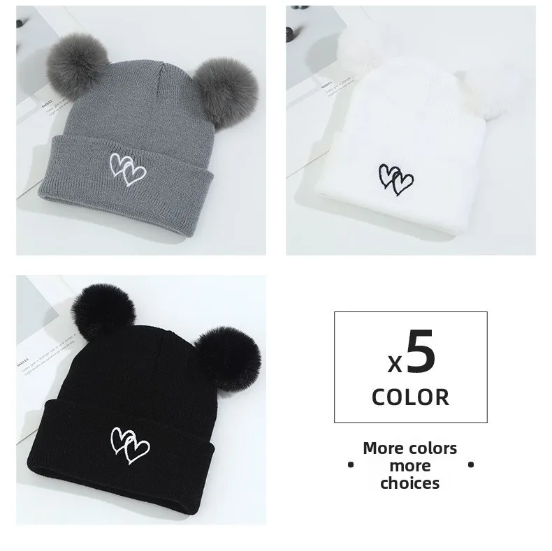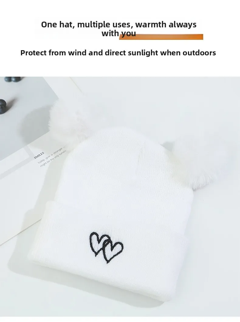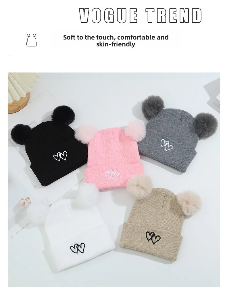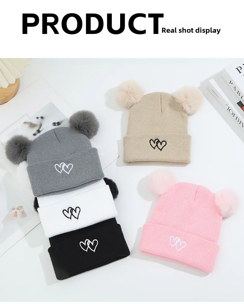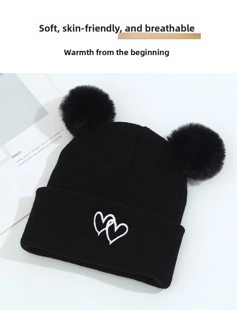 Lindo gorro de punto para bebé: bordado de doble corazón con pompones, gorro cálido suave y agradable para la piel, gorros unisex para clima frío.