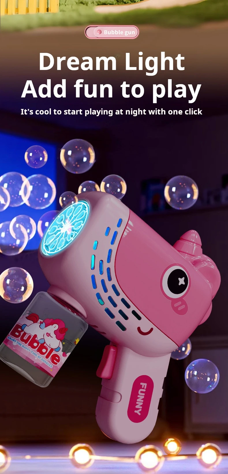 Lindo juguete de máquina de burbujas completamente automático para niños juego de soplado de burbujas al aire libre unicornio con juguete ligero para niños (sin agua de burbujas
