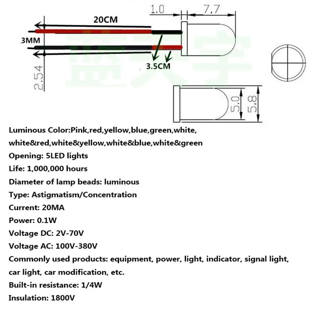 Nuevo con alta calidad Nombre del artículo: Luz LED Material: Plástico Color: rosa, rojo, amarillo, azul, verde. blanco, blanco y rojo, blanco y amarillo, blanco y azul, blanco y verde Tamaño: 3 mm * 210 mm Adecuado para automóviles RC 1/10 Apertura: 5 luces LED Vida útil: 1000.000 horas Diámetro de las cuentas de la lámpara: luminoso Tipo: Astigmatismo/Corriente de concentración: 20 mA Potencia: 0. 1W Voltaje CC: 2V-70V Voltaje CA: 100V-380V Productos de uso común: equipo, alimentación, luz, indicador, luz de señal, luz de automóvil, modificación de automóvil, etc. Resistencia incorporada: 1/4 W Aislamiento: 1800 V Cantidad: 10 piezas Plumas: Producción de LED de alta calidad Haga que su automóvil se vea más realista Adecuado para todo tipo de automóviles RC Fácil instalación El paquete incluye: 10 piezas Luz LED de juguete para automóvil Aviso: 1. Transición: 1 cm=10 mm=0, 39 pulgadas. 2. Permita un error de 1-2 mm debido a la medición manual y asegúrese de que no le importe antes de realizar el pedido. 3. Por favor, comprenda que los colores pueden existir aberraciones cromáticas debido a la diferente ubicación de las imágenes.