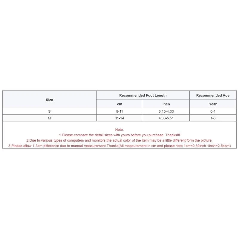 Tamaño: M Longitud del pie recomendada: 11-14 cm (4,33-5.51 pulgadas) Edad recomendada: 1-3 años