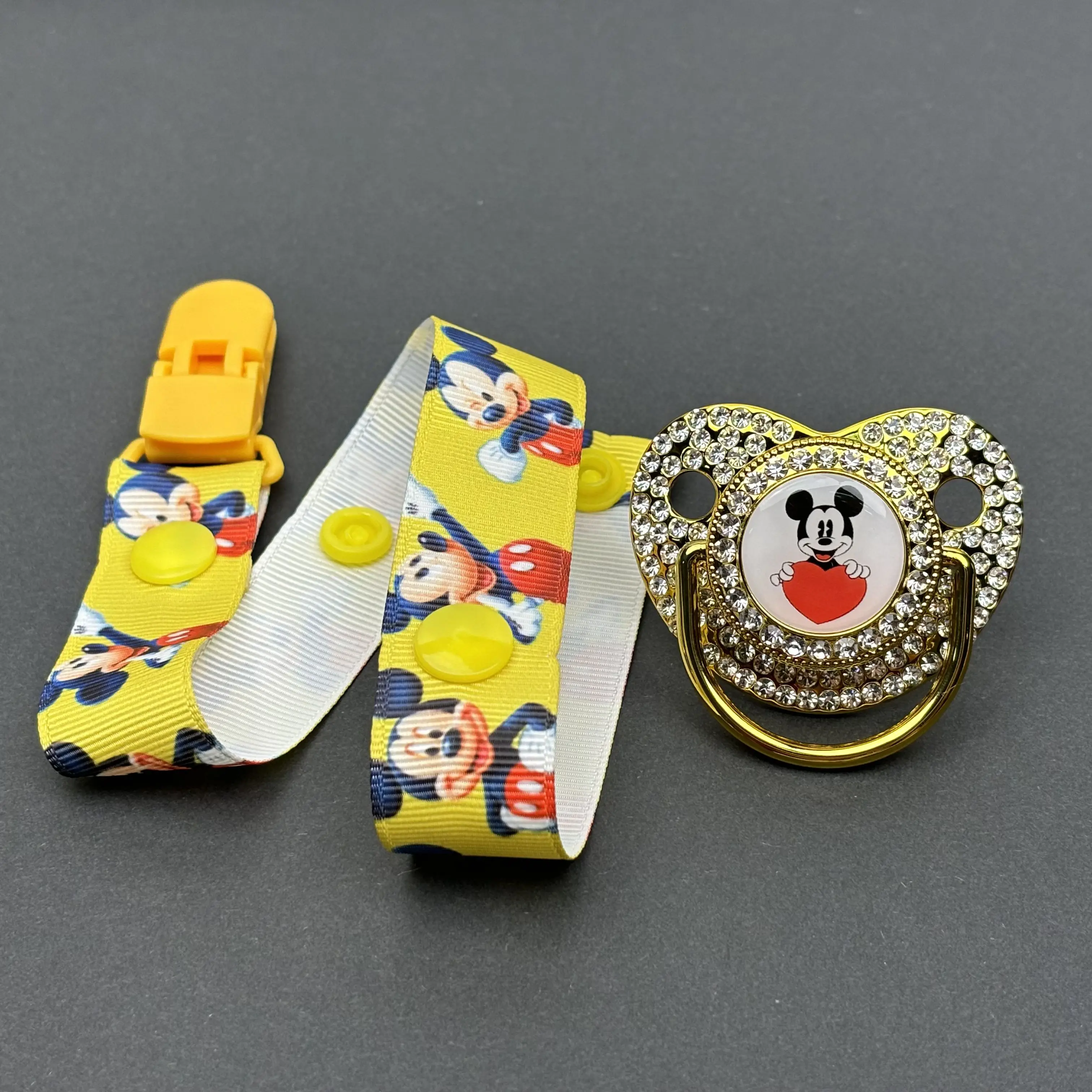 [madre y niño] Clip para chupete de ratón de mickey dorado para niña, 1 Juego de lujo bling binky, peso ligero, estampado de anime universal para chupetes