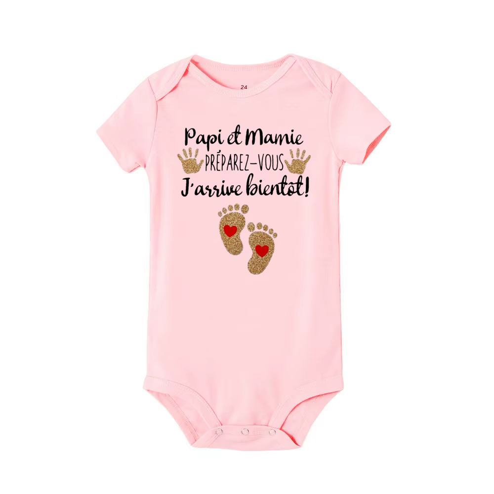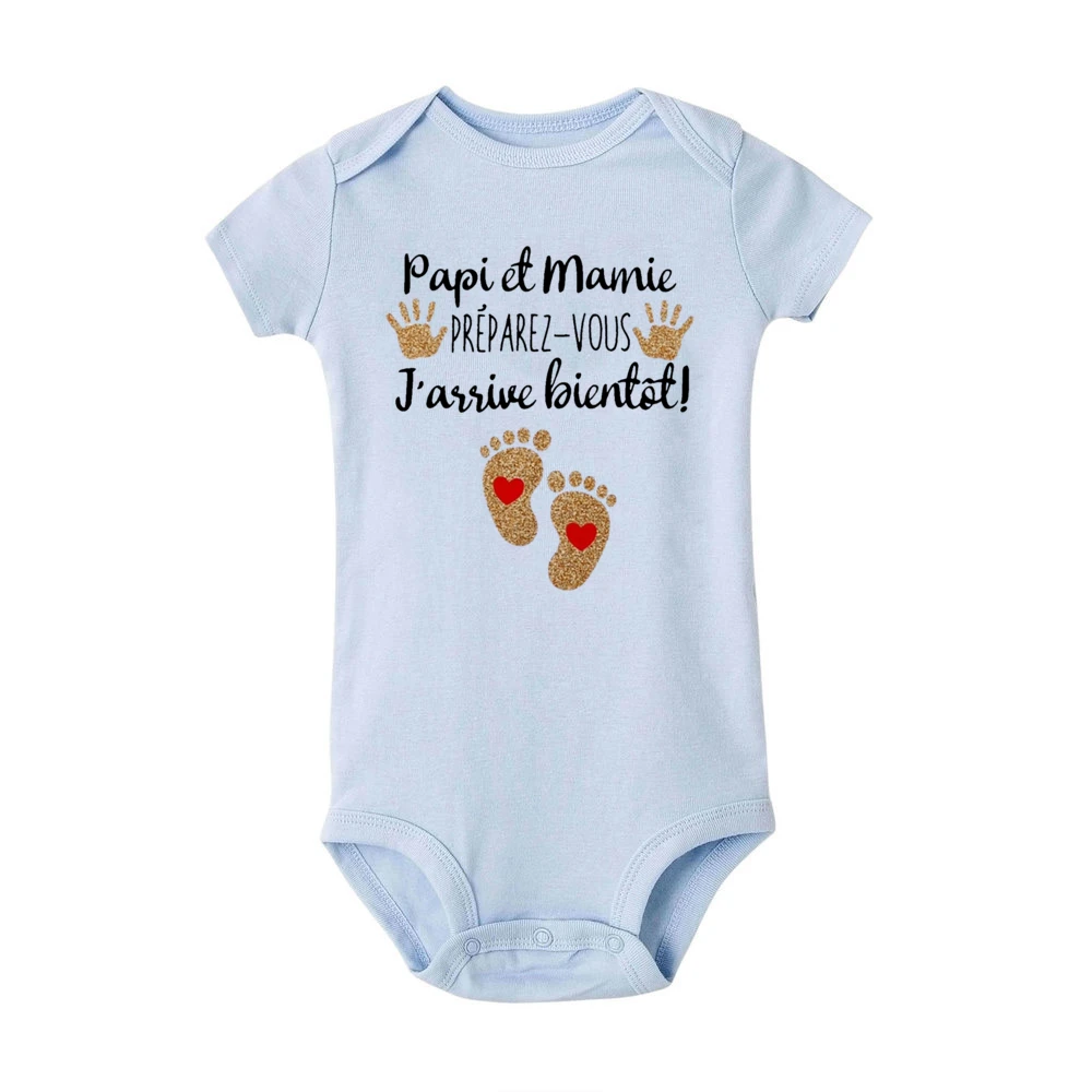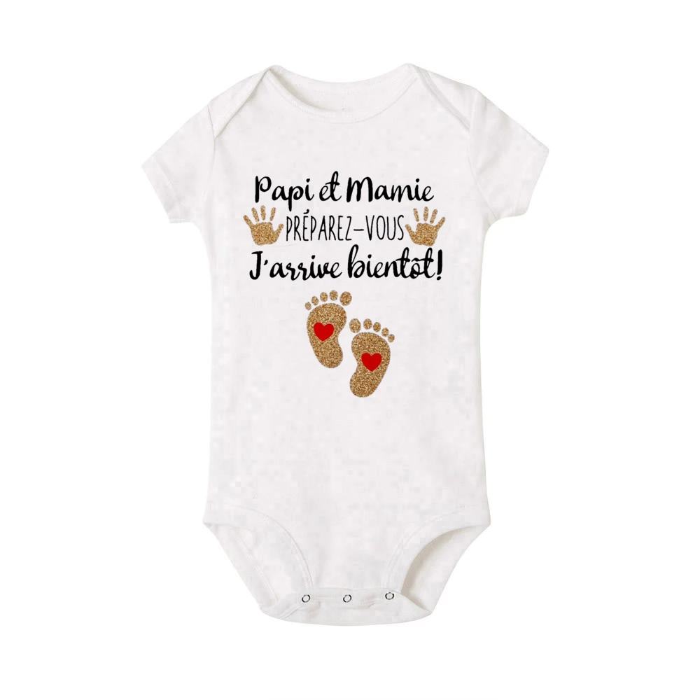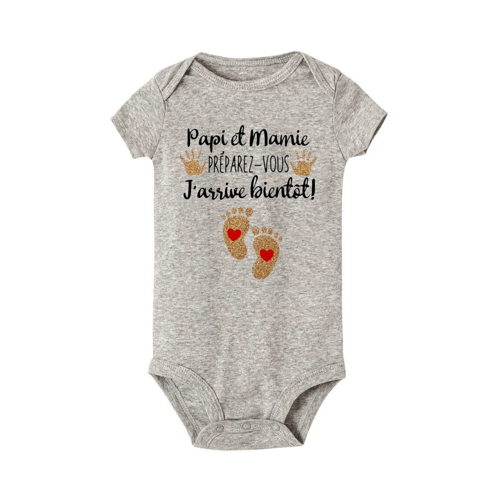 Prepárate para abuelo y abuela Estaré aquí pronto estampado mameluco para bebé anuncio de embarazo mono infantil traje mono para recién nacido