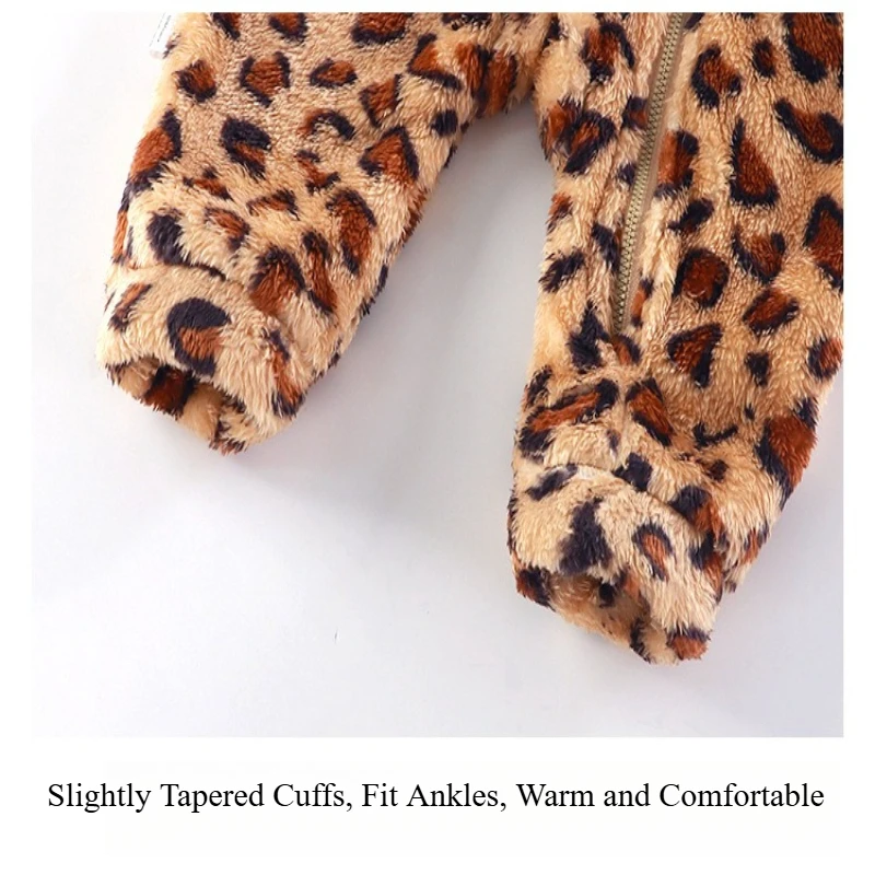 Mameluco con capucha con estampado de leopardo de invierno para bebé con lindas orejas peludas Mono con cremallera oblicua para bebé acogedor y cálido para salidas navideñas