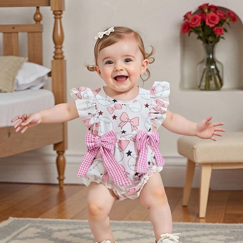 Mameluco para niña, mono sin mangas de verano con cuello redondo y estampado de béisbol con lazo, mono para recién nacido