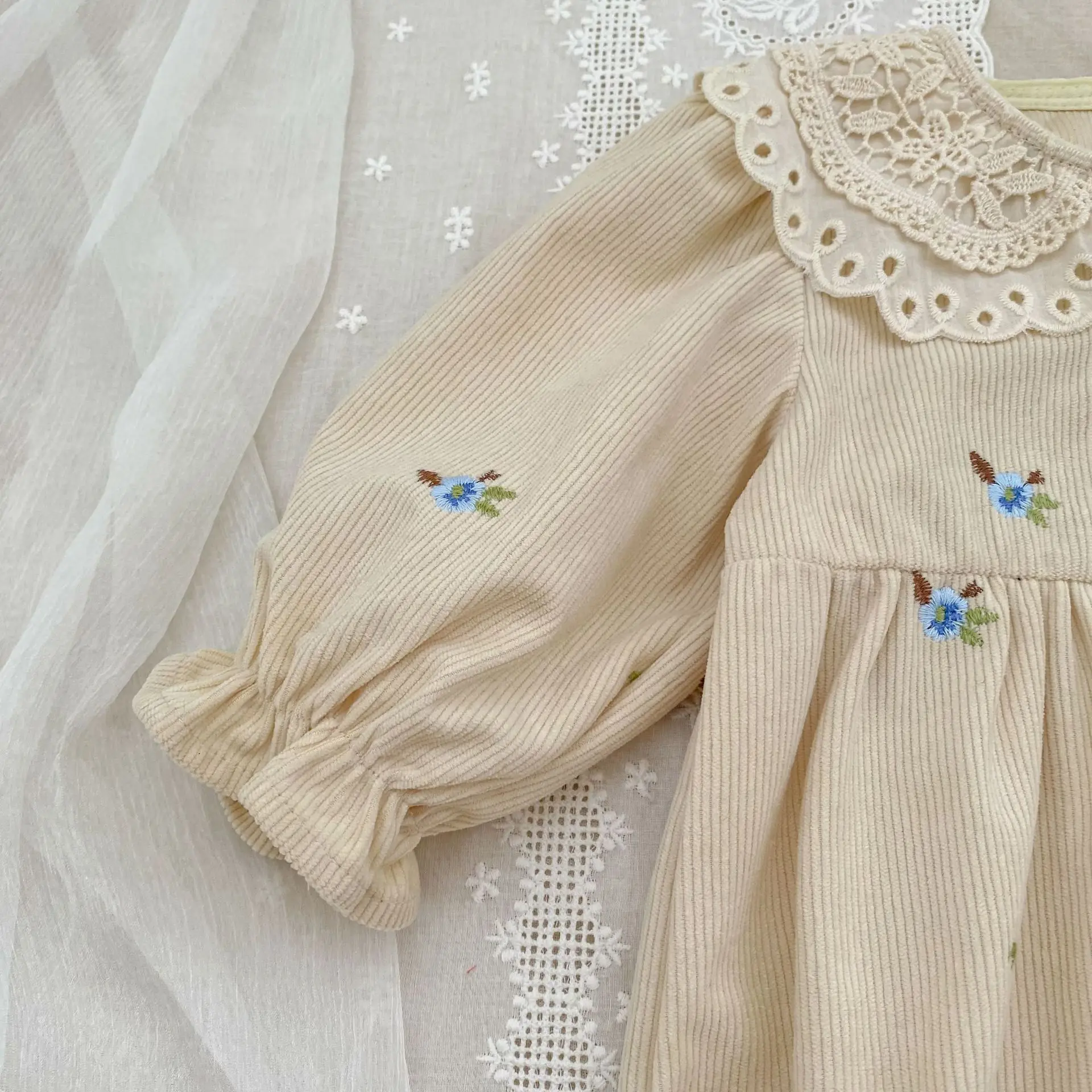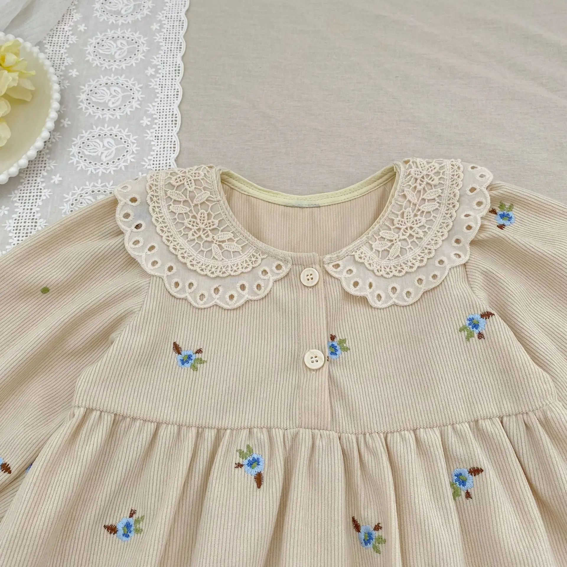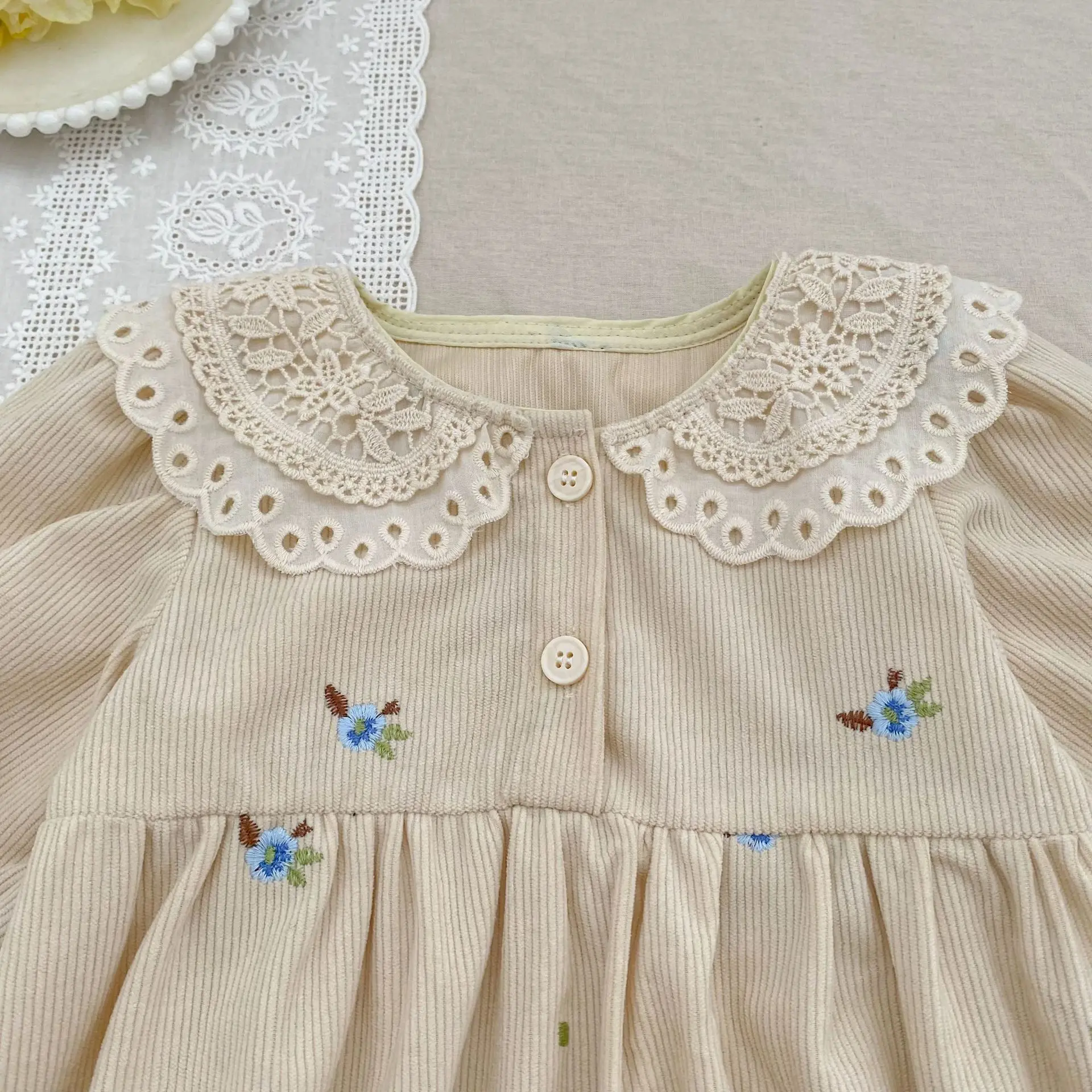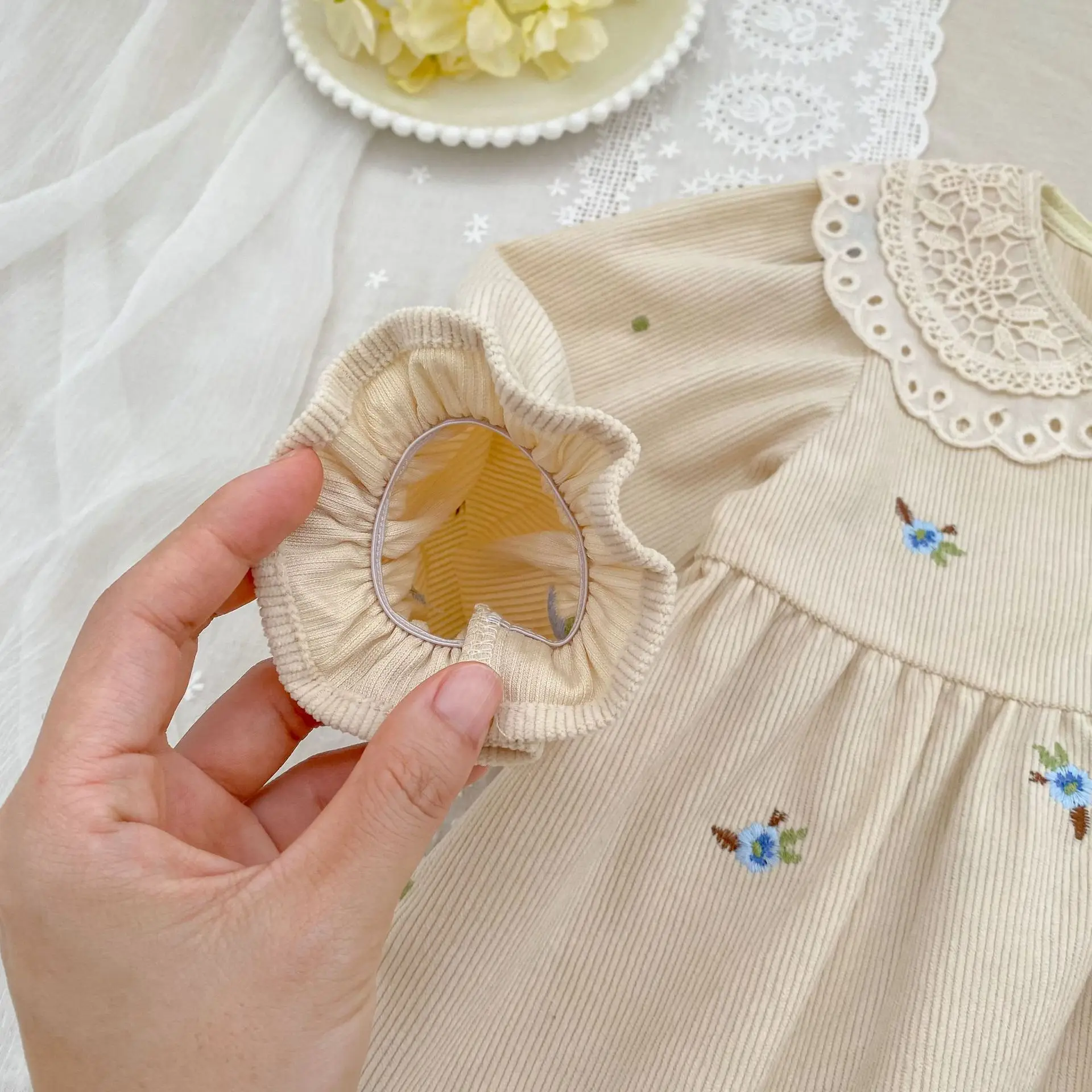Mameluco de princesa de primavera y otoño para niñas de estilo coreano: bordado de encaje de manga larga, vestido mono lindo y suave para la piel para niños pequeños.