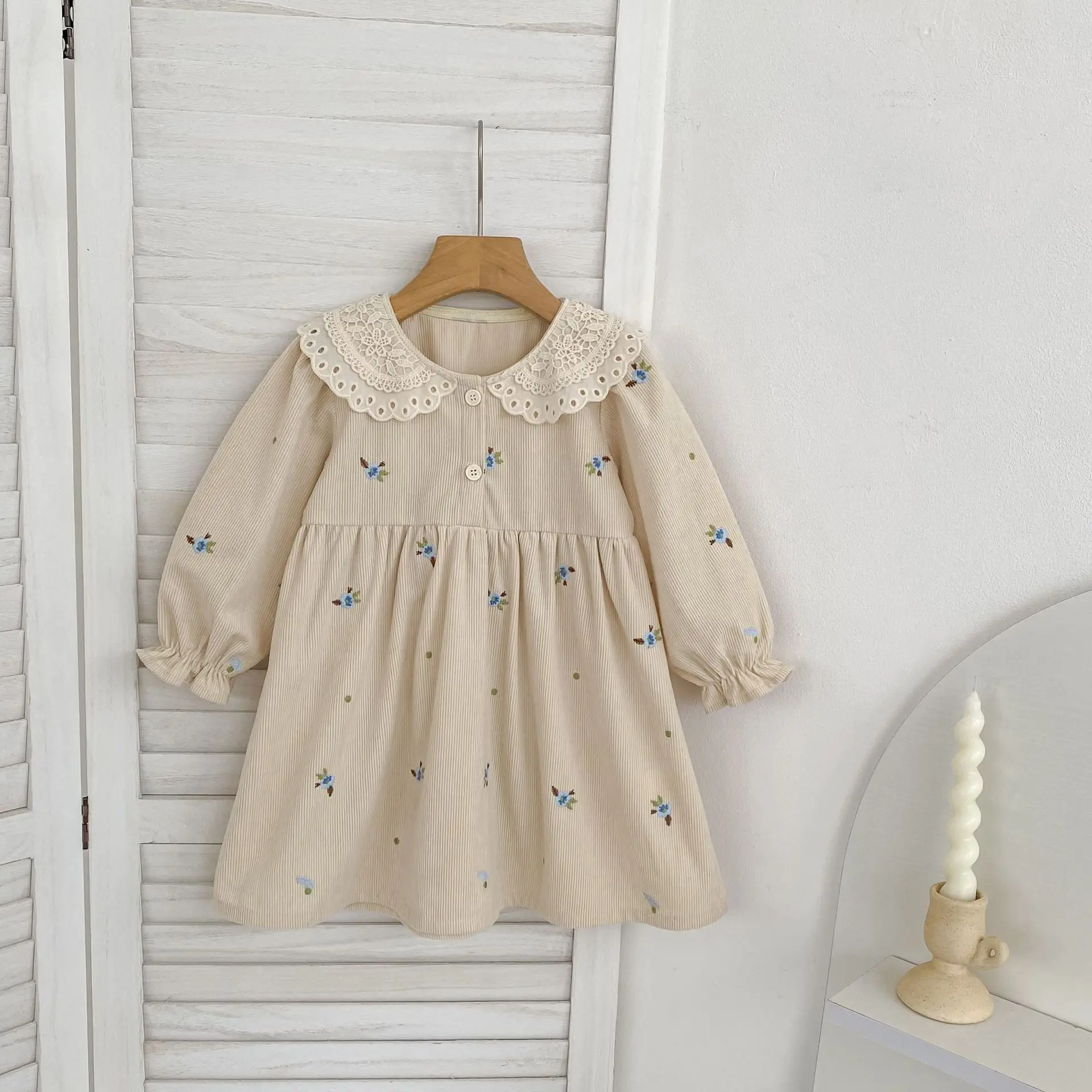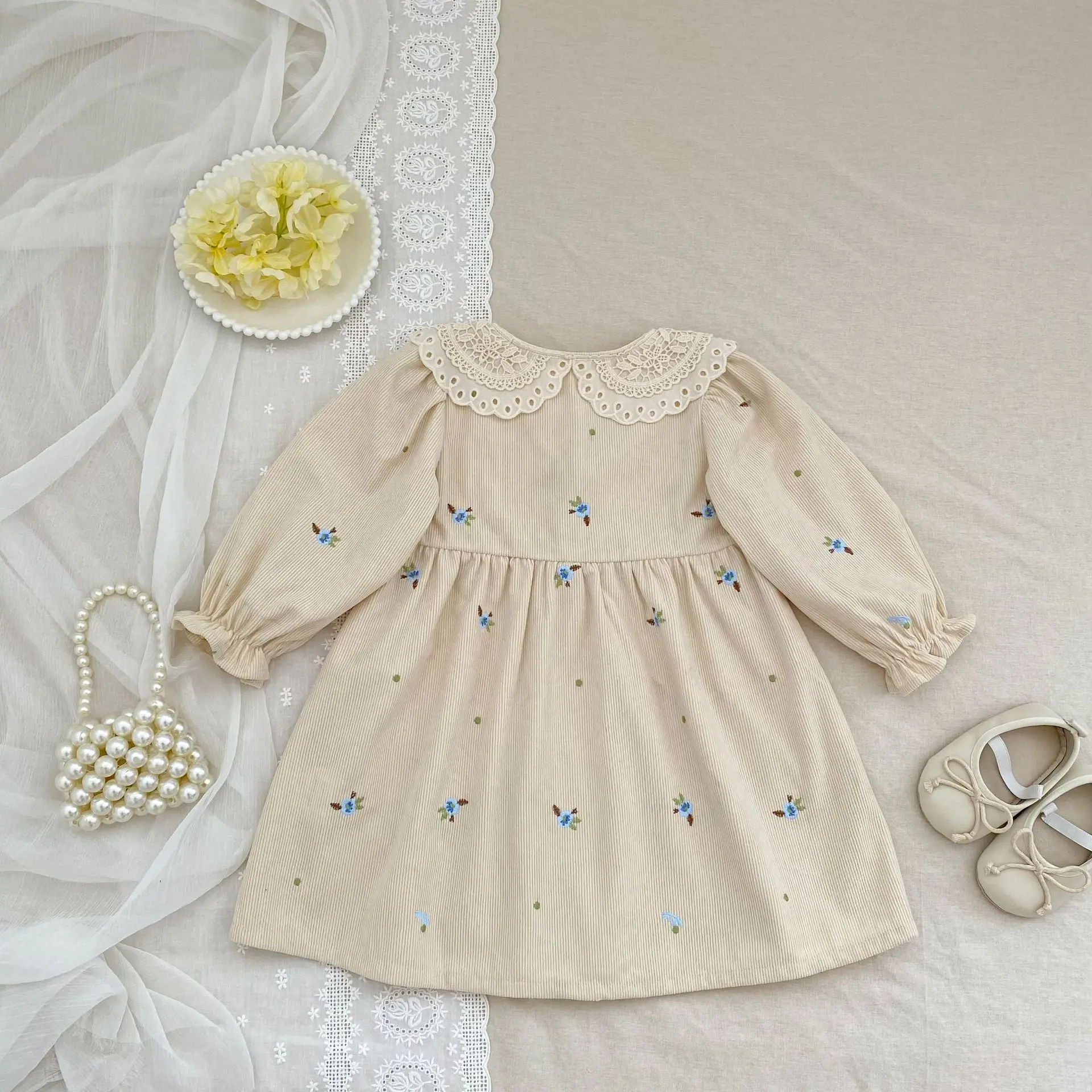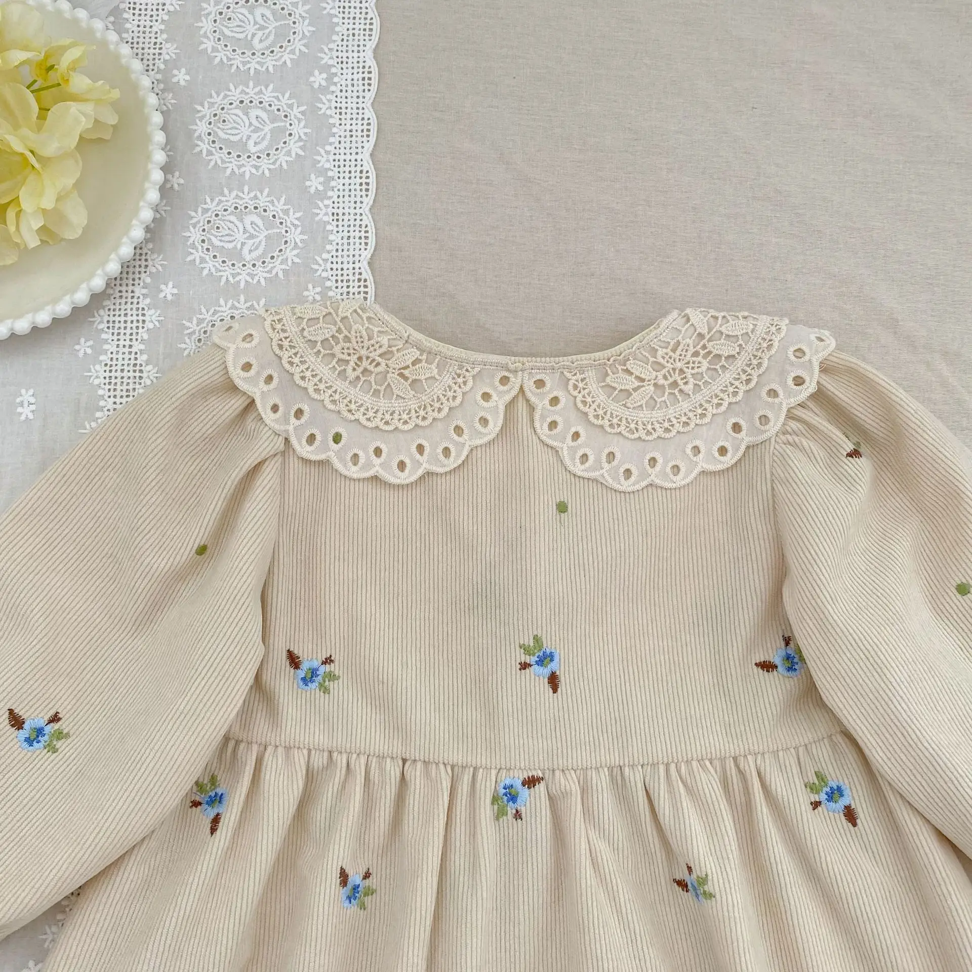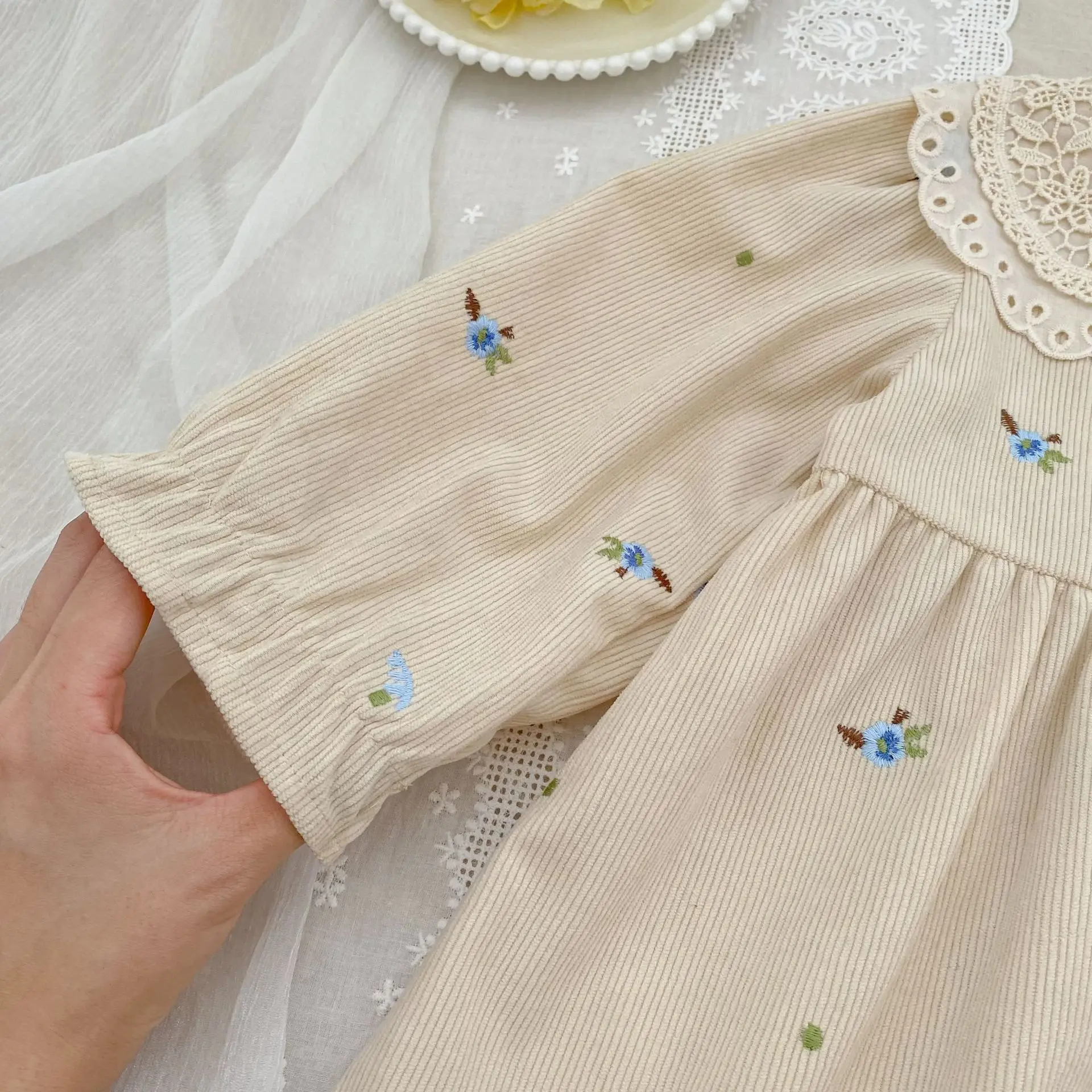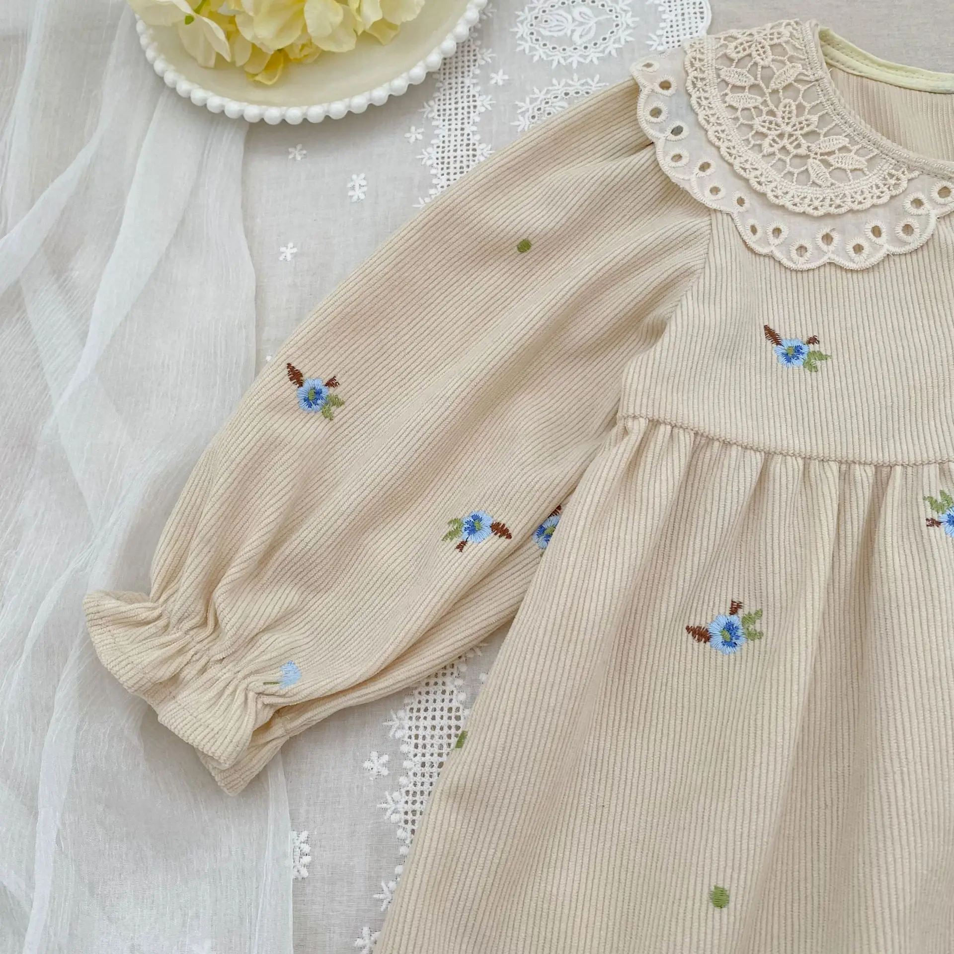 Mameluco de princesa de primavera y otoño para niñas de estilo coreano: bordado de encaje de manga larga, vestido mono lindo y suave para la piel para niños pequeños.