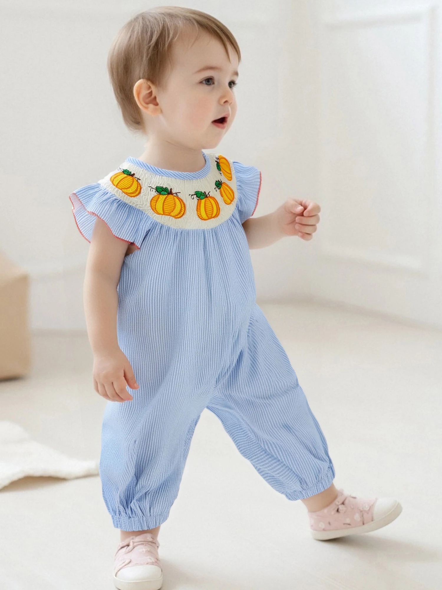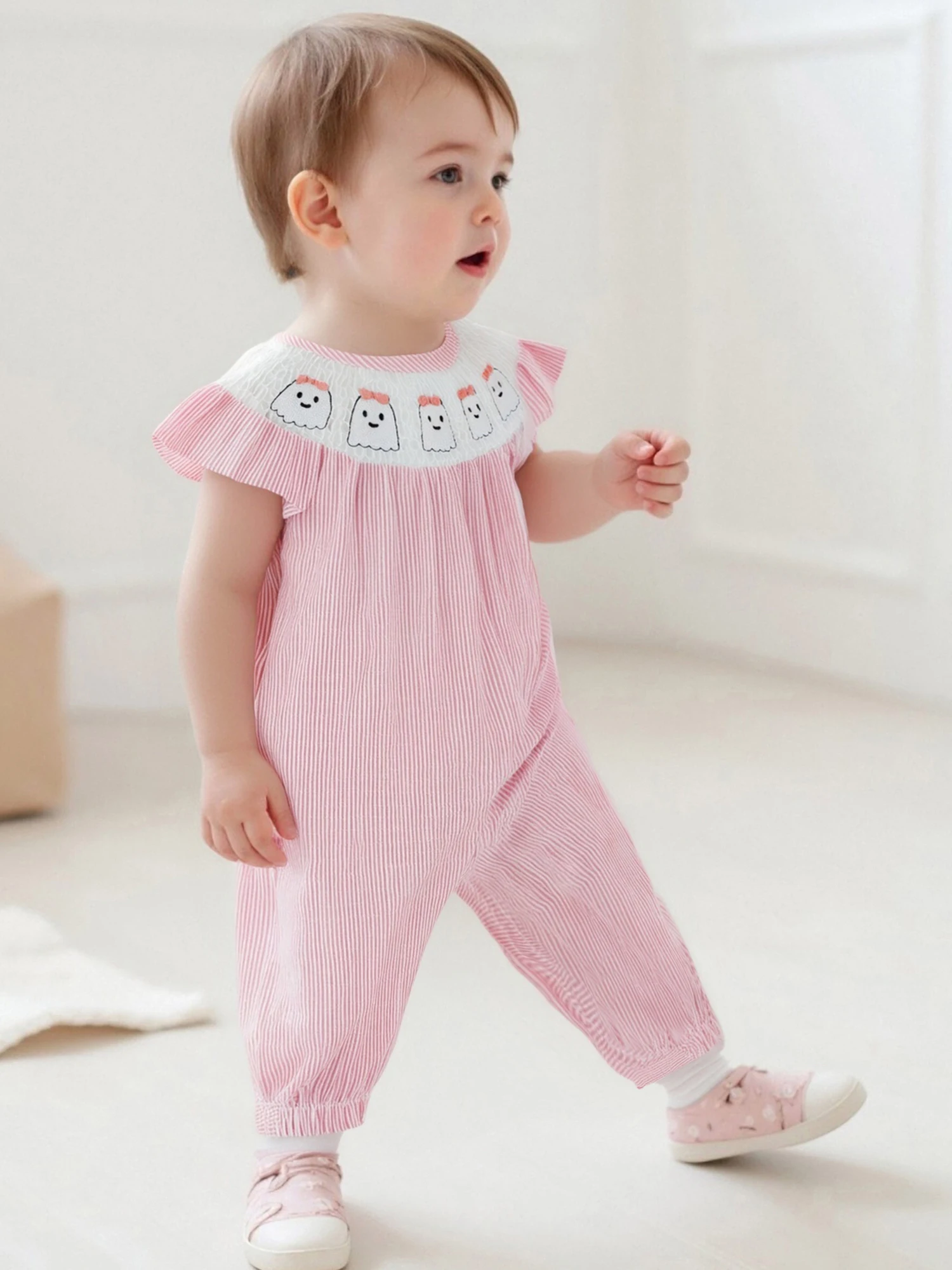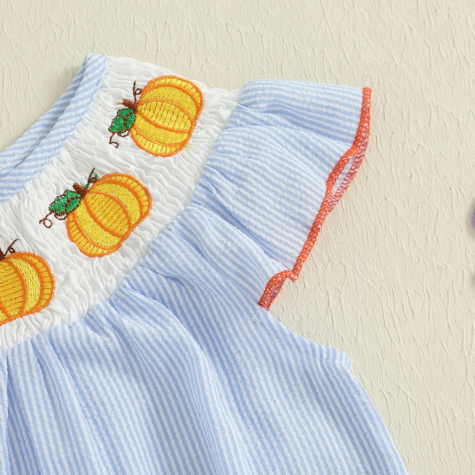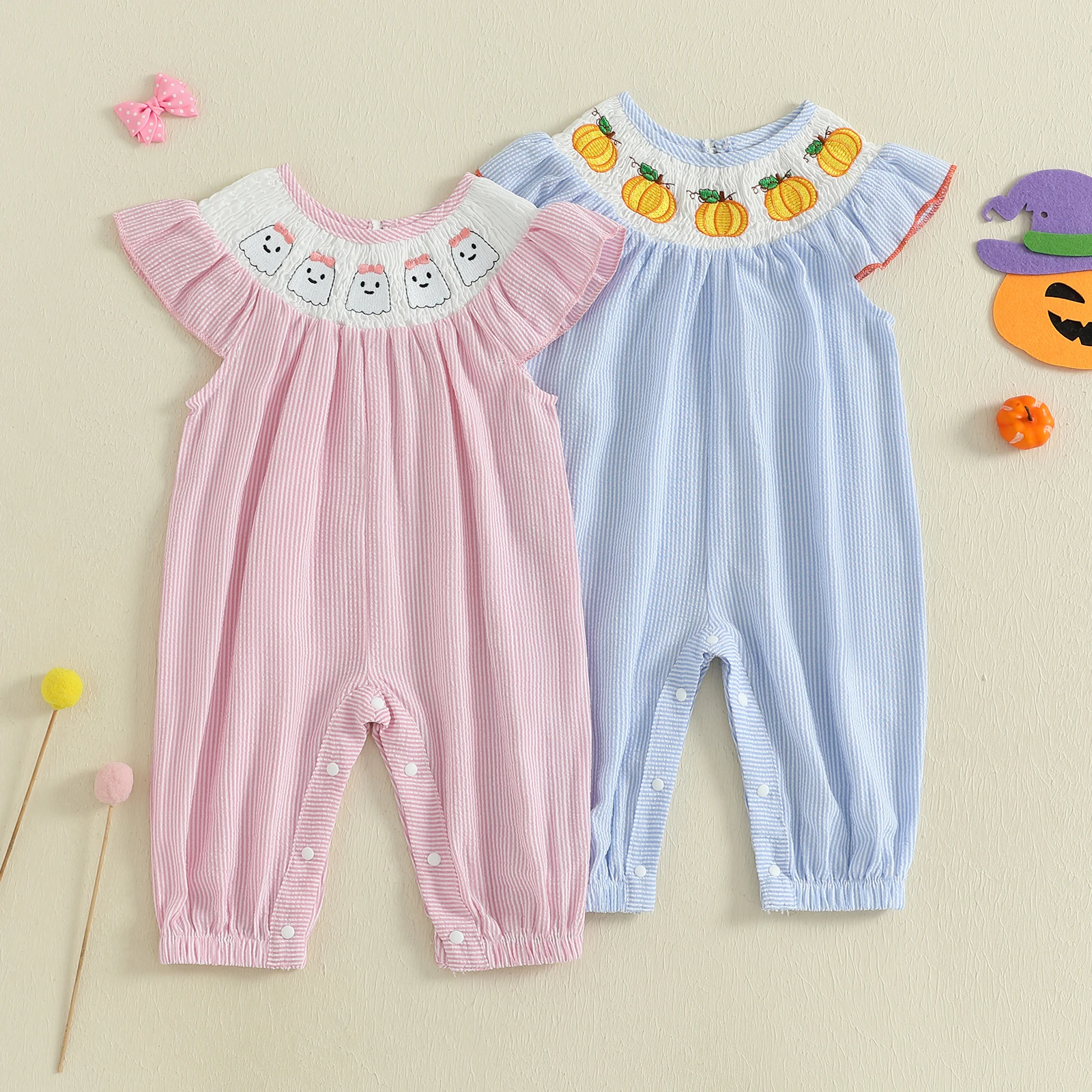 Especificaciones: Material: 95% algodón y 5% poliéster Tamaño: 0-3 meses/3-6 meses/6-12 meses/12-18 meses Color: rosa, azul Patrón: bordado de calabaza fantasma, rayado. Manga: Manga voladora Cuello: cuello redondo Género: niña