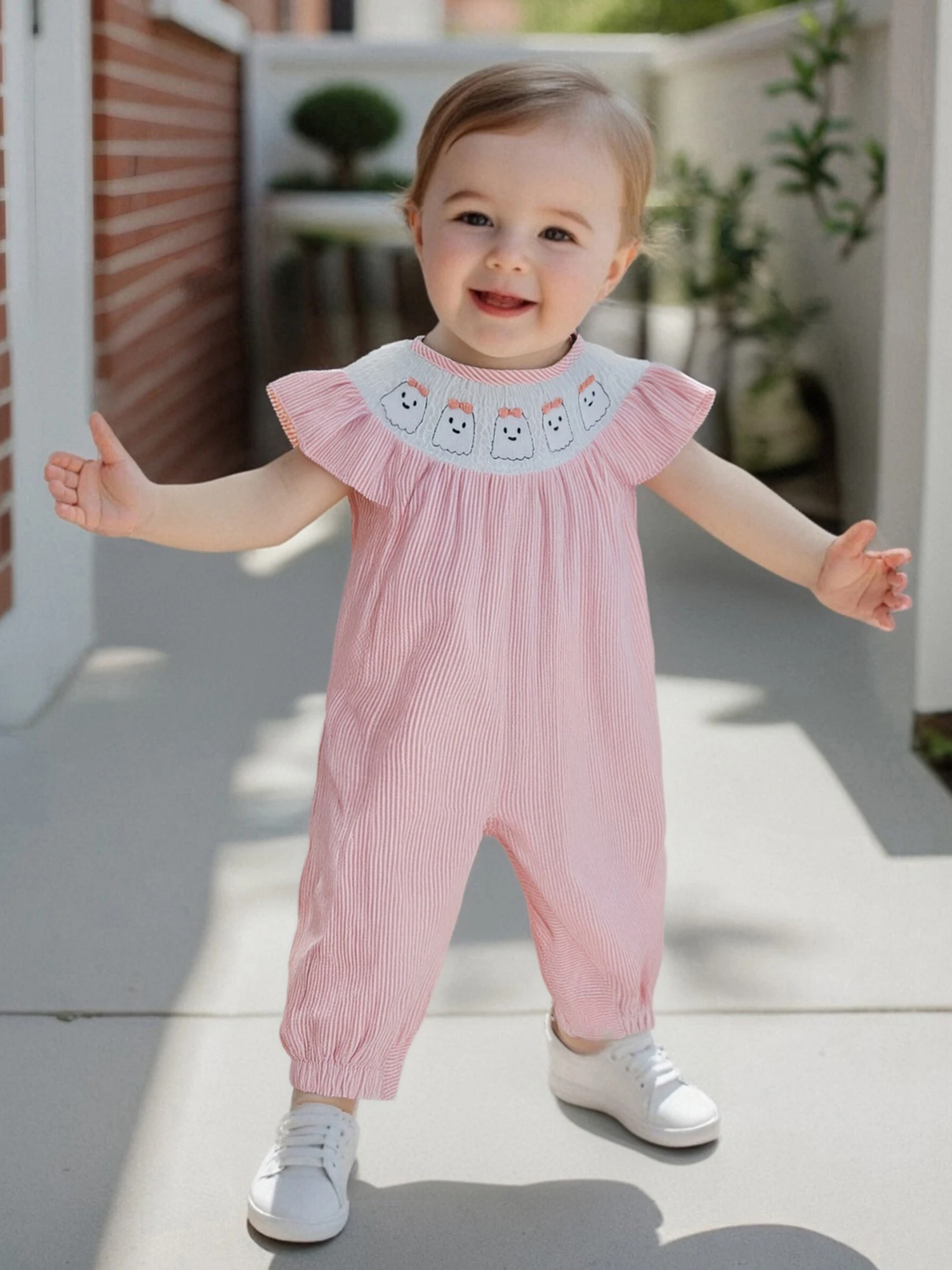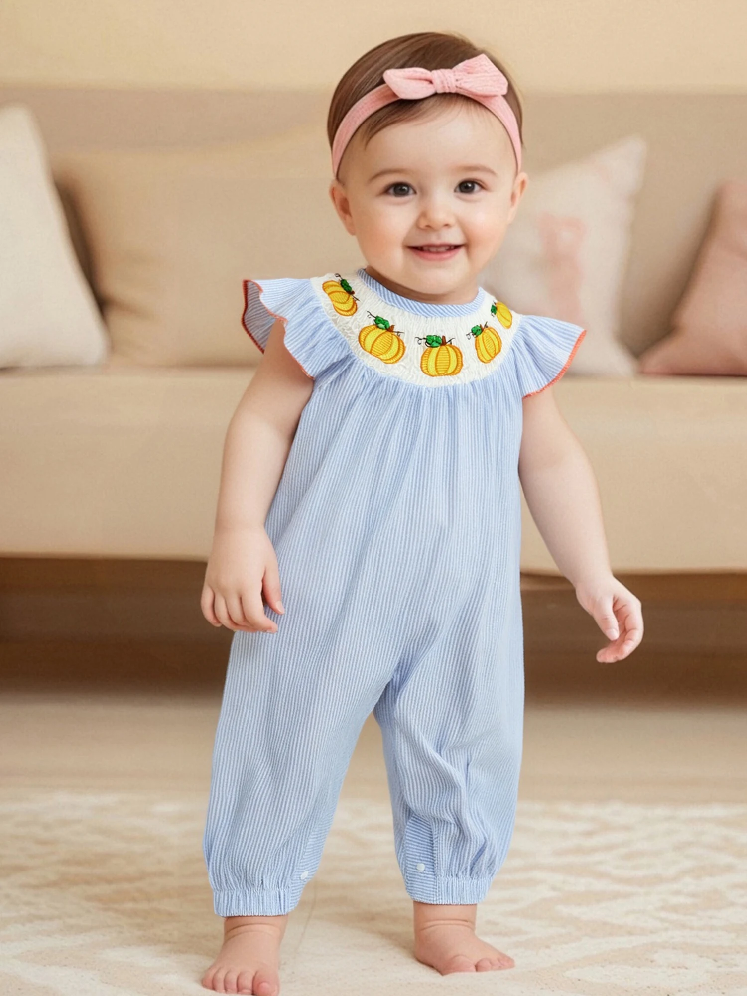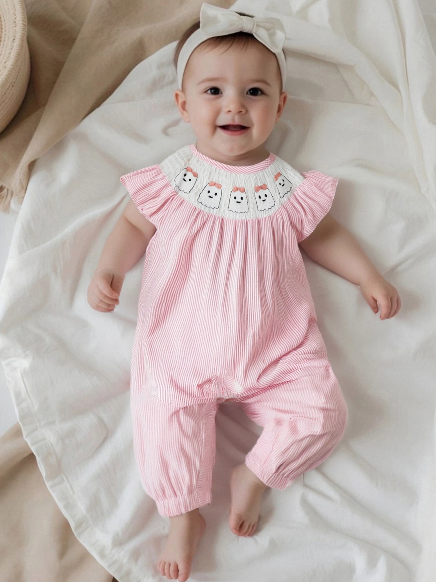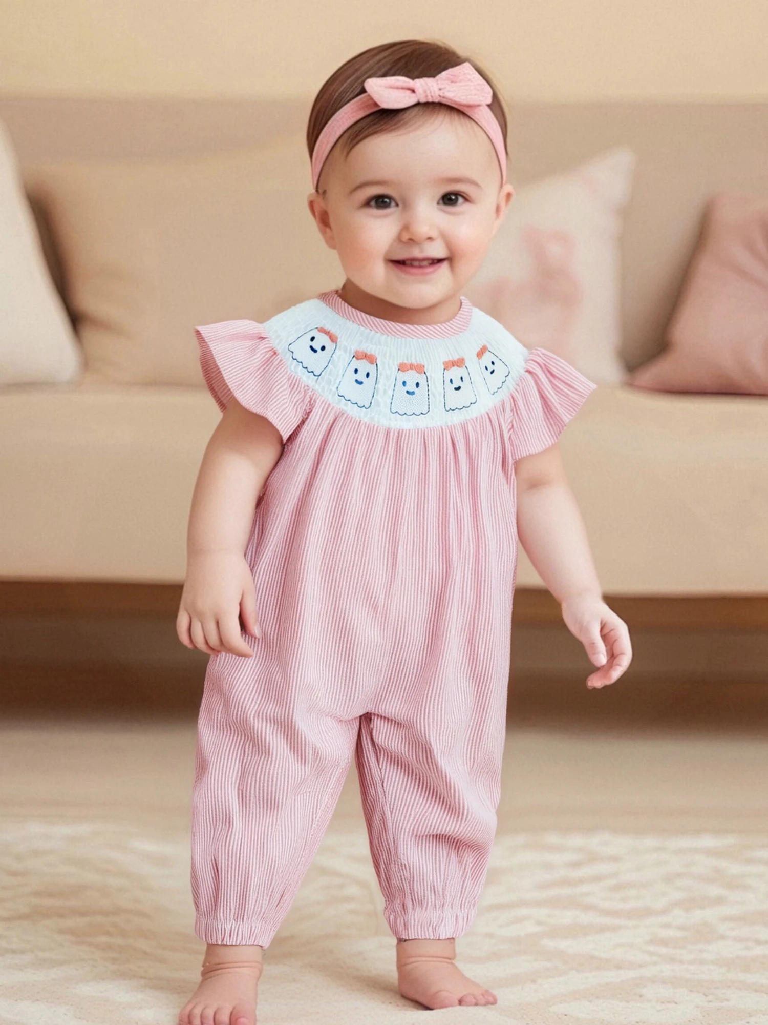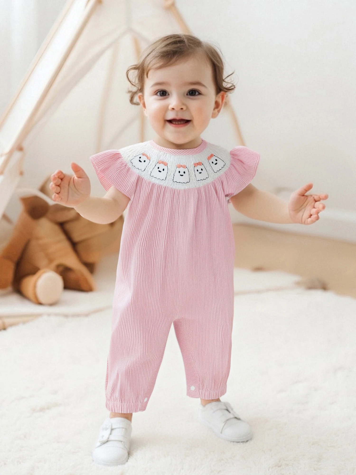 Especificaciones: Material: 95% algodón y 5% poliéster Tamaño: 0-3 meses/3-6 meses/6-12 meses/12-18 meses Color: rosa, azul Patrón: bordado de calabaza fantasma, rayado. Manga: Manga voladora Cuello: cuello redondo Género: niña