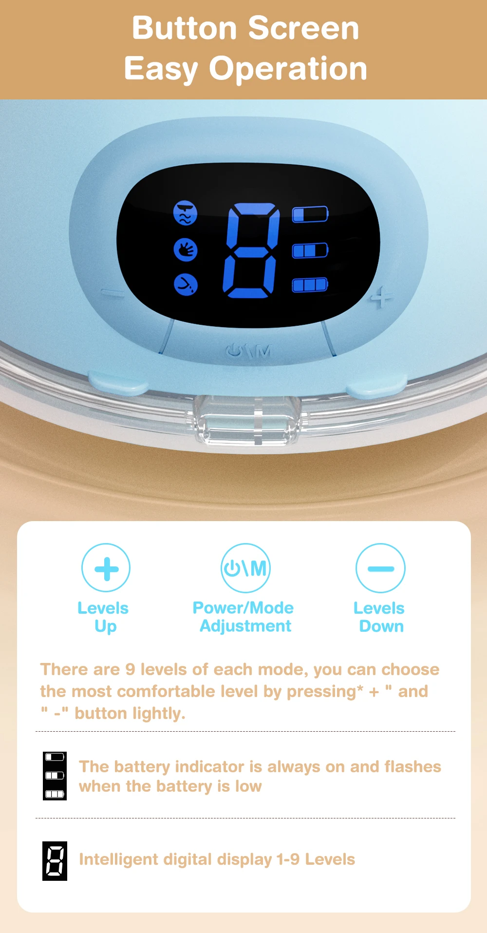 Puede presionar el botón "M" para seleccionar el modo: masaje/modo de lactancia/modo de bombeo.