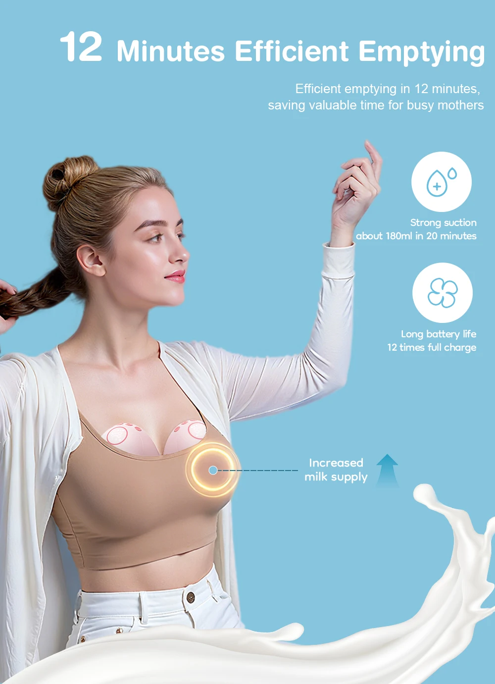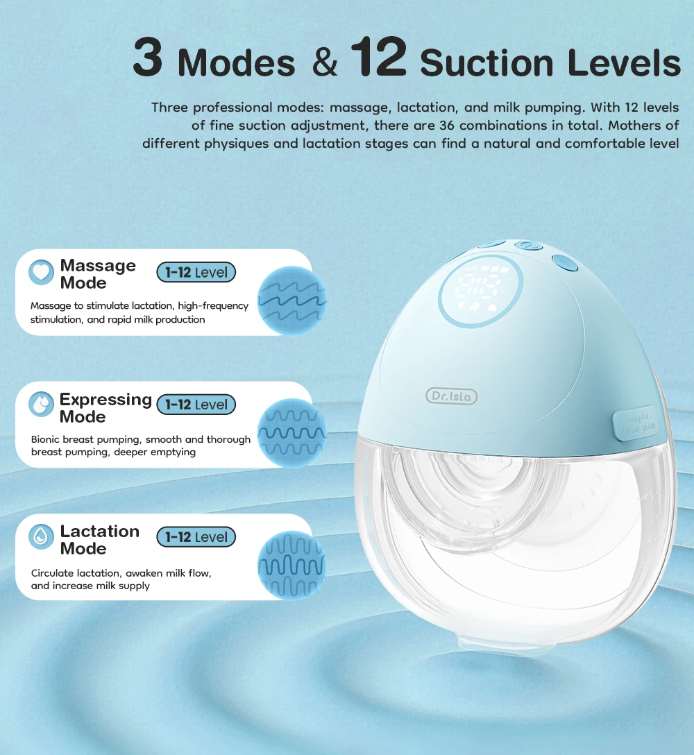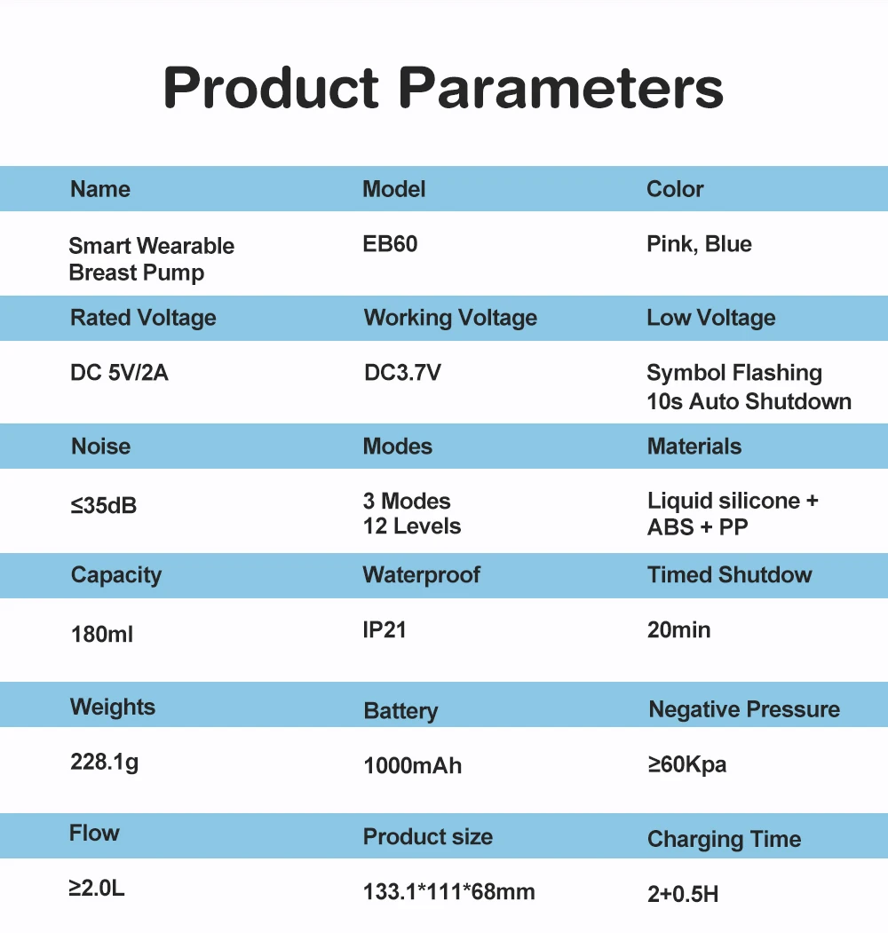 Succión ajustable de 12 niveles (satisface diferentes necesidades de lactancia); Bombas ~180ml en 20 minutos (suficientes para alimentación individual).La carga completa admite 12 usos, además de la carga rápida tipo C.