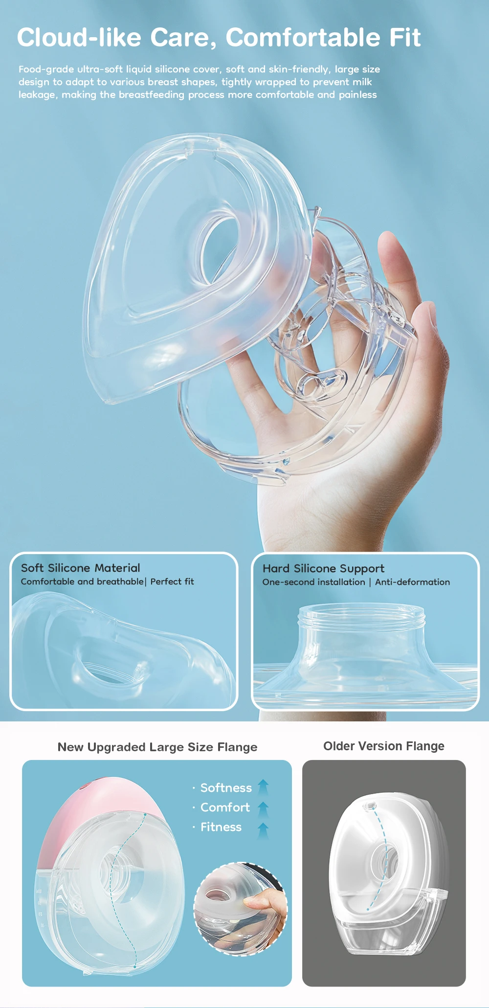 Tan tierno como los labios de un bebé, envuelve completamente la areola para reducir la fricción.Se adapta a todas las formas de senos, sin enrojecimiento ni molestias incluso después de 30 minutos de uso.