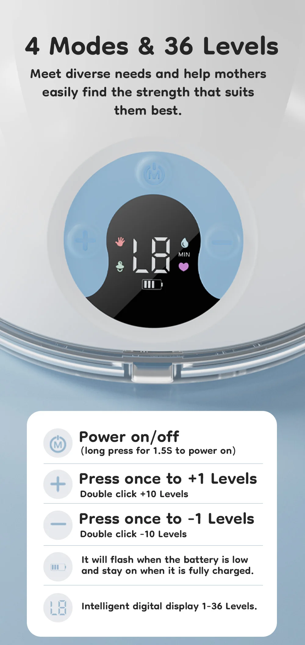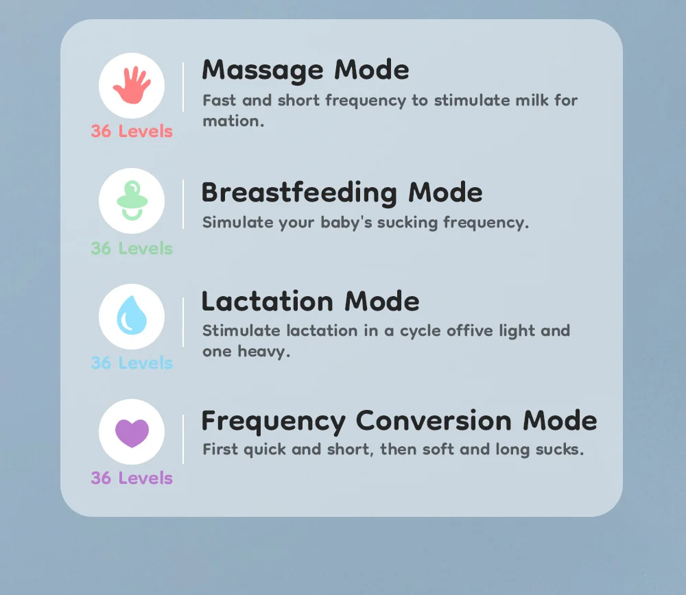 1.Modo: cuatro modos (modo de lactancia, modo de succión, modo de conversión de frecuencia, modo de succión normal)