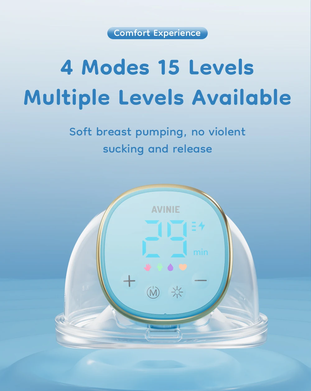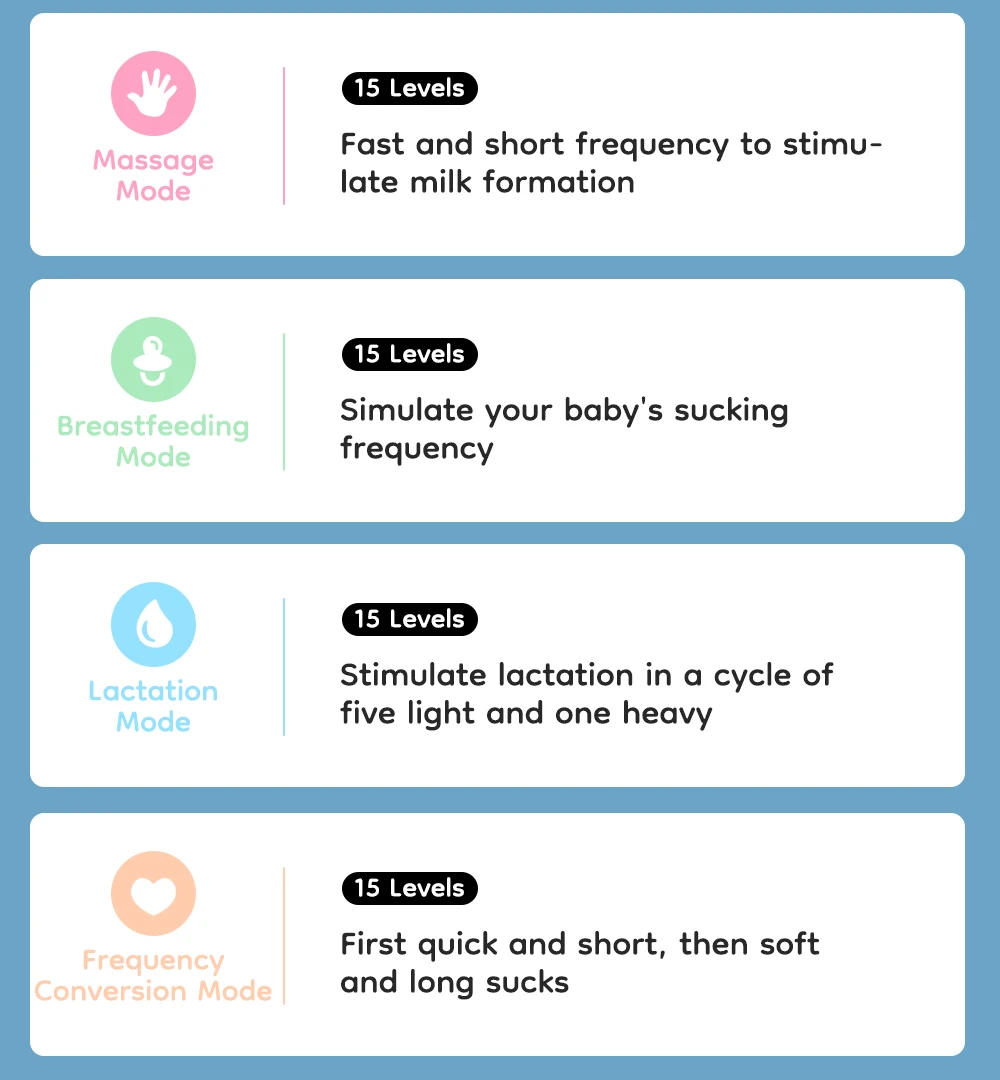 Equipado con 4 modos profesionales: masaje, lactancia, lactancia y conversión de frecuencia, para satisfacer todas sus necesidades de lactancia materna.El modo de masaje estimula la liberación de la leche con vibraciones de alta frecuencia, aumentando el suministro de leche.El modo de lactancia imita el ritmo natural de succión del bebé para un vaciado completo, mientras que el modo de lactancia utiliza un ciclo de 5 luces-1 fuertes para mejorar la lactancia.El modo de conversión de frecuencia, con succión rápida y superficial, es perfecto para una extracción eficiente de la leche, ideal para mamás ocupadas.Cada modo ofrece 15 niveles ajustables, lo que le permite personalizar su zona de confort.
