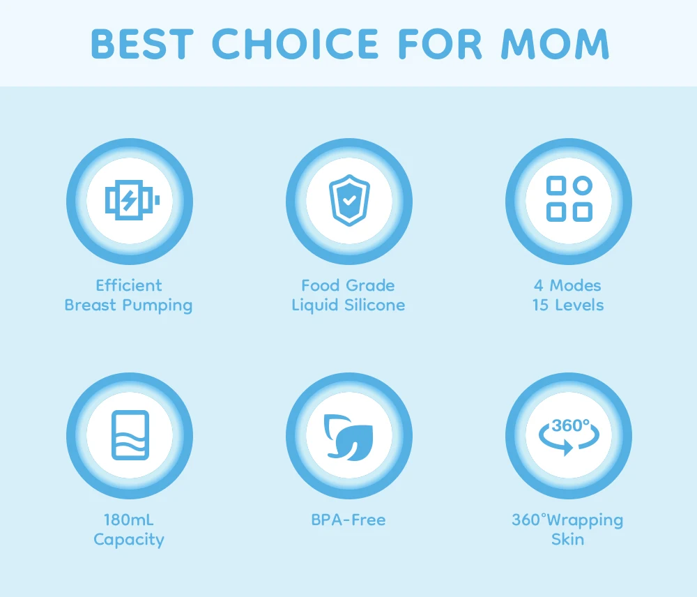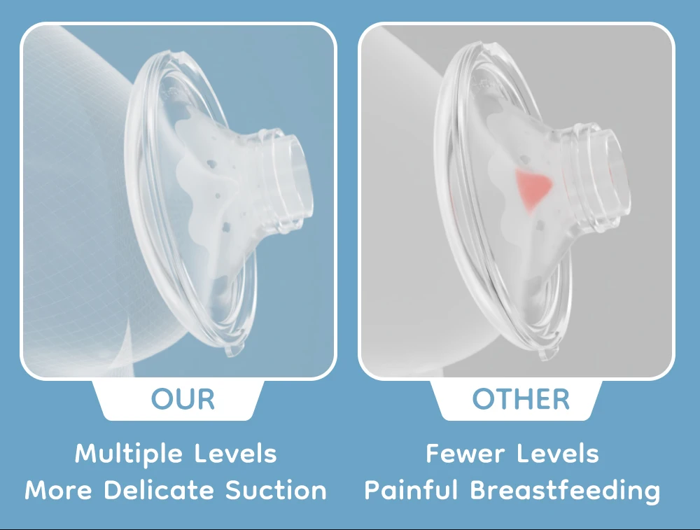 Hecho de silicona de calidad alimentaria y materiales libres de BPA, es seguro tanto para la mamá como para el bebé. El potente motor mejora la succión (hasta 33 Kpa) y la frecuencia, estimulando eficazmente la producción de leche y mejorando la lactancia. También ayuda con los pezones planos o invertidos, favoreciendo una lactancia materna exitosa. Con 4 modos × 15 niveles=48 configuraciones precisas, se adapta a diferentes (fásicos) y etapas de lactancia, asegurando una experiencia natural y confortable.