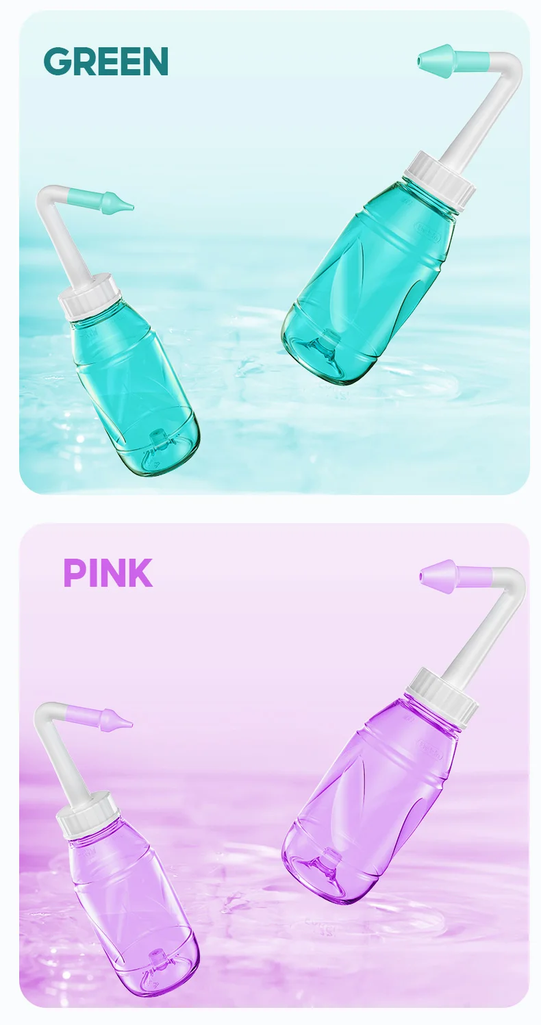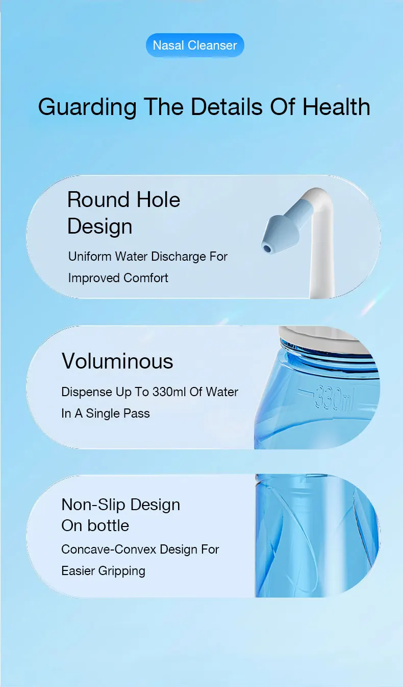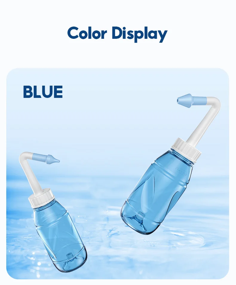 5.Enjuague la cavidad nasal estrictamente de acuerdo con la postura correcta descritida en el manual de instrucciones del producto.Si se producen tos, vómitos, estornudos y otras molestias durante el lavado, deténgase inmediatamente.Lave bien el lavado nasal antes y después de cada uso.