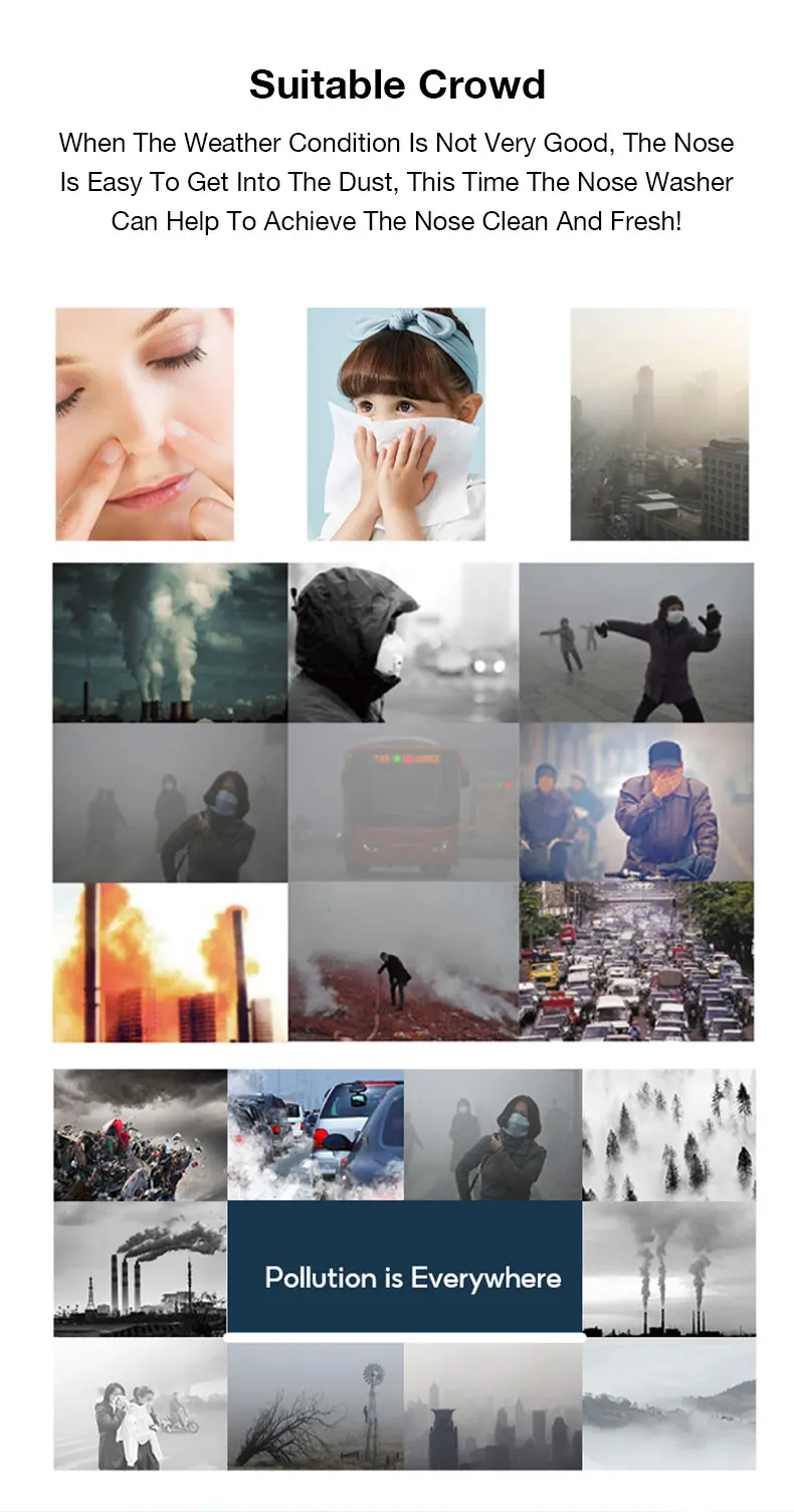 Este producto es adecuado para el lavado de la cavidad nasal, la limpieza diaria de la cavidad nasal y el cuidado de la salud para la inhalación laboral de polvo.
