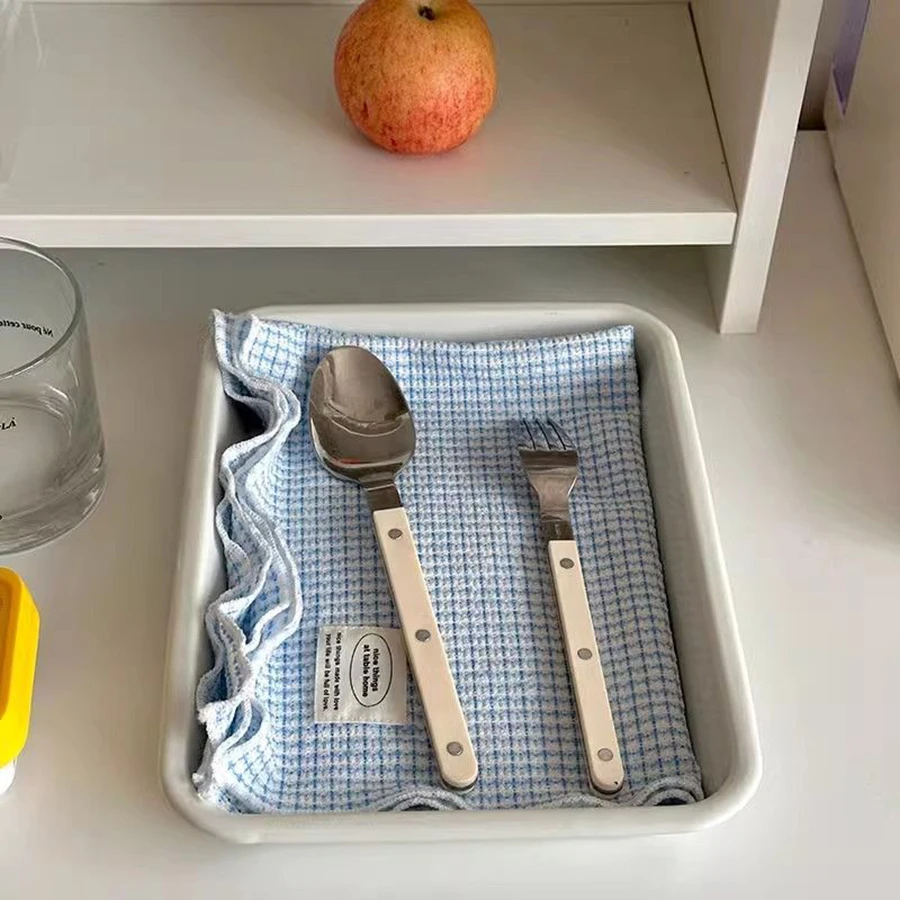 El color es claro. No es rígido, pero tiene una textura suave y fluida. Se ve muy bien cuando se usa como funda para una tostadora o una olla arrocera.