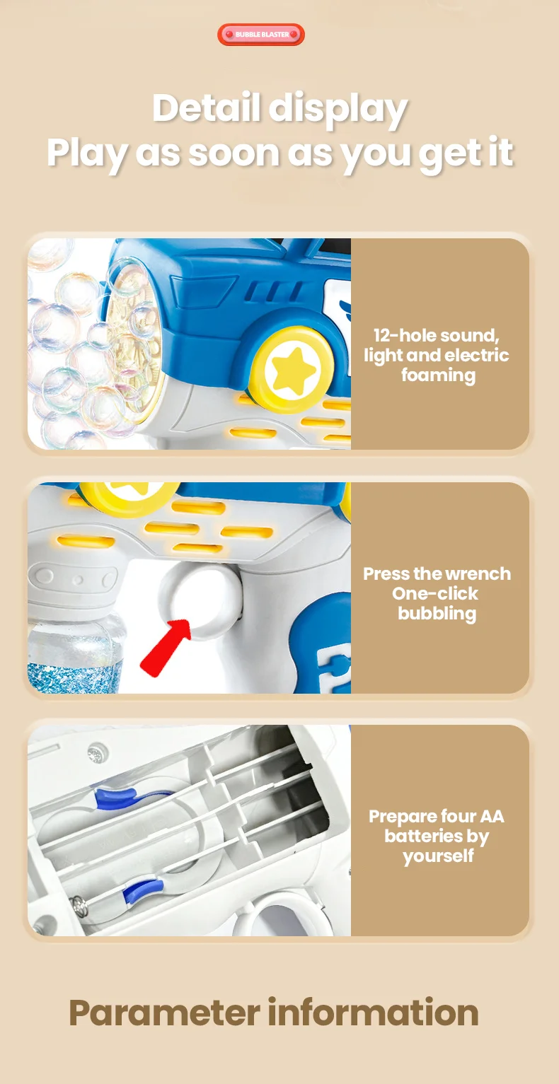 【Juguetes con máquina de burbujas de rendimiento increíble】 Nuestra máquina de burbujas tiene una moto potente, más burbujas más divertidas para los niños, los lindos juguetes de burbujas tienen 12 agujeros para soplar.