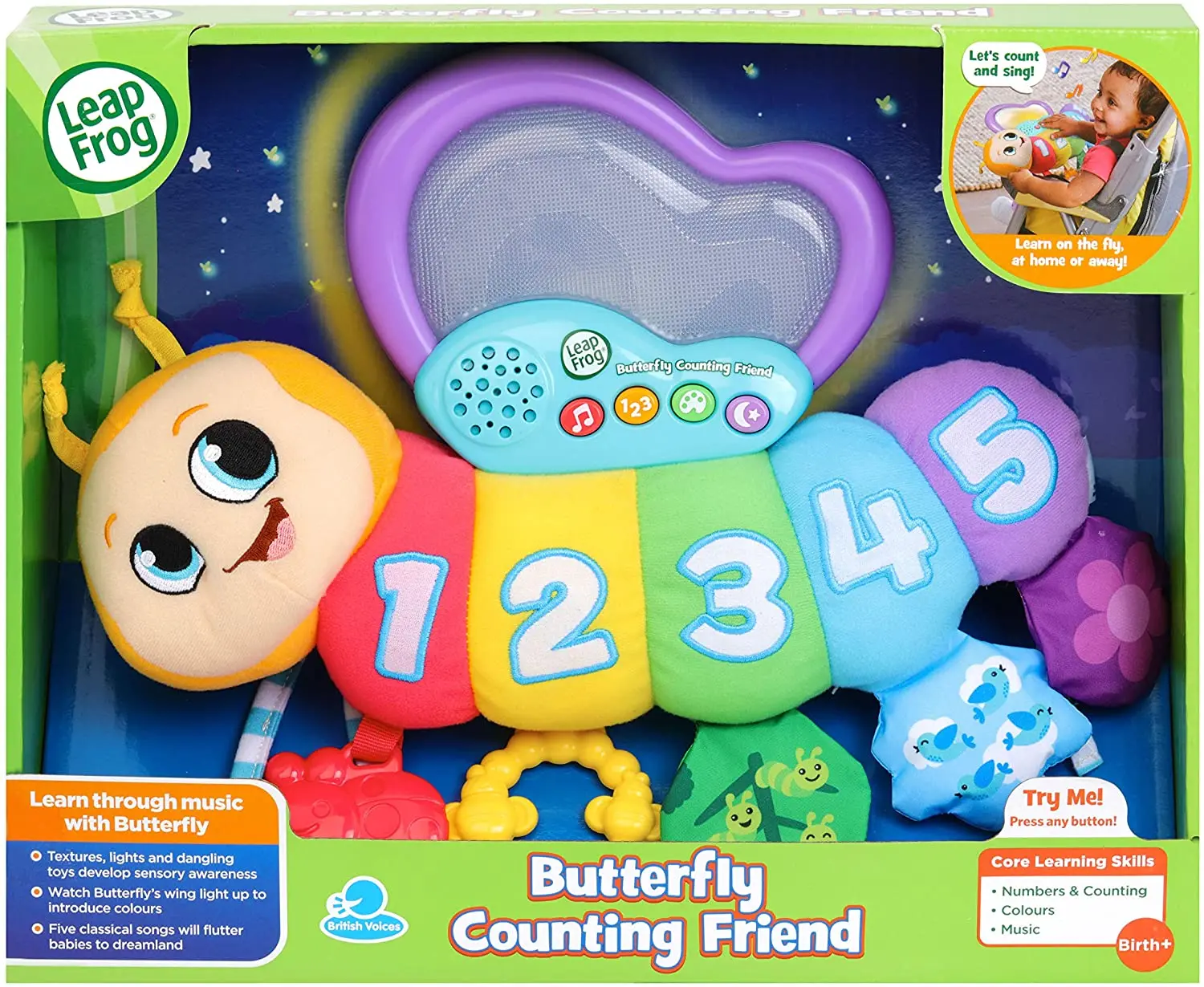 La mariposa 123 se ha diseñado para ayudar a familiarizarse con el aprendizaje de los números a través de frases musicales, sonidos y palabras