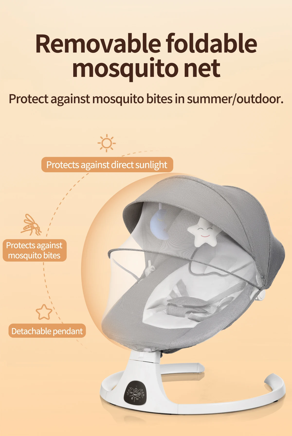 DEAREST tiene muchas características atractivas, incluyendo música incorporada para la cuna, + USB Bluetooth inalámbrico, tela Oxford y terciopelo de cuero melocotón, ajuste de bloqueo de balanceo de un botón, mosquitera extraíble y capacidad de control remoto. Un cinturón de seguridad ajustable y un cojín en forma de U brindan protección adicional para los bebés, y una bandeja extraíble hace que sea fácil comer. La capacidad de peso es de 12 kg, y tres modos de ajuste del respaldo le ayudan a ajustar el columpio para obtener la máxima comodidad para su pequeño.