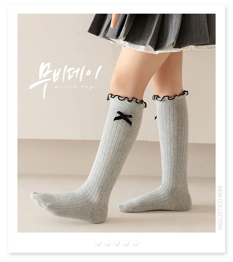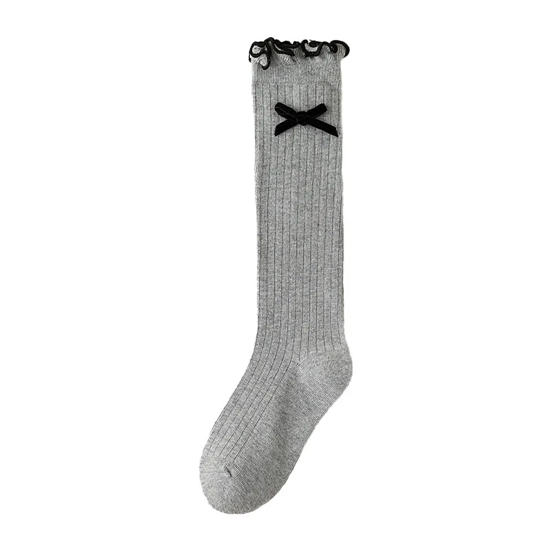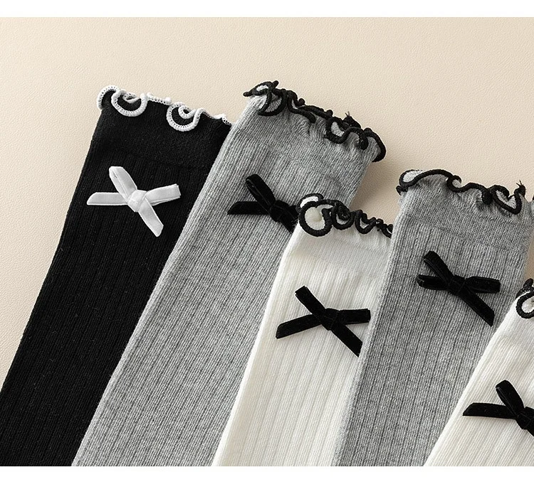 Medias de algodón para niños de otoño, calcetines largos hasta la rodilla con lazo coreano y volantes para niñas, calcetín escolar JK con lazo de Color sólido