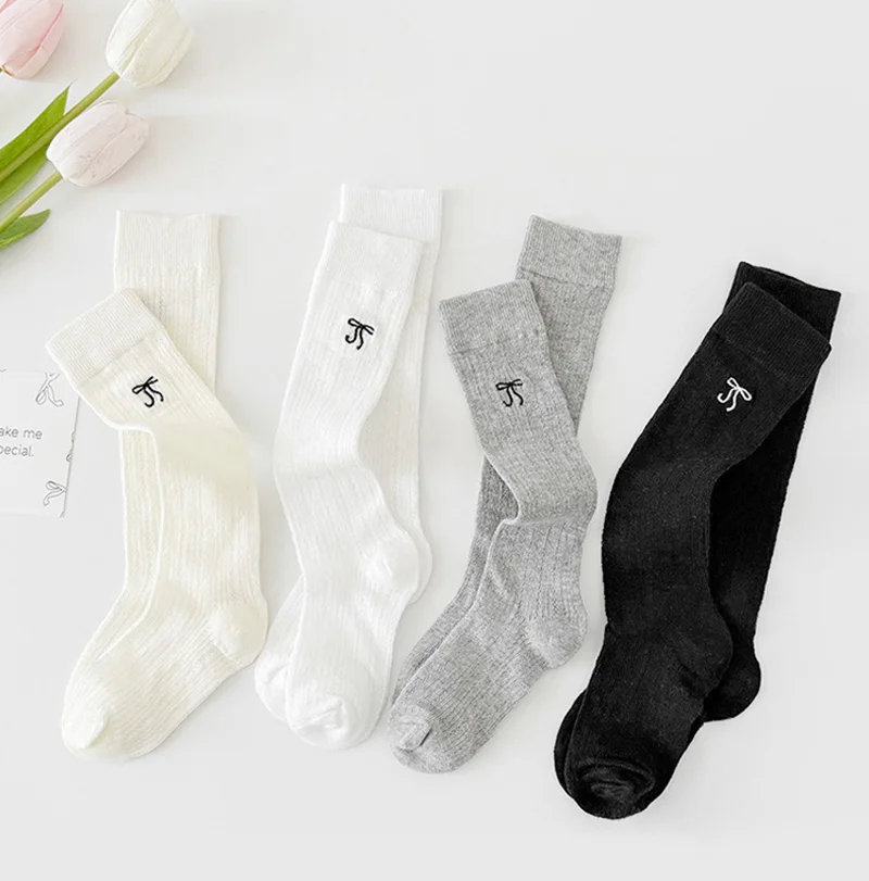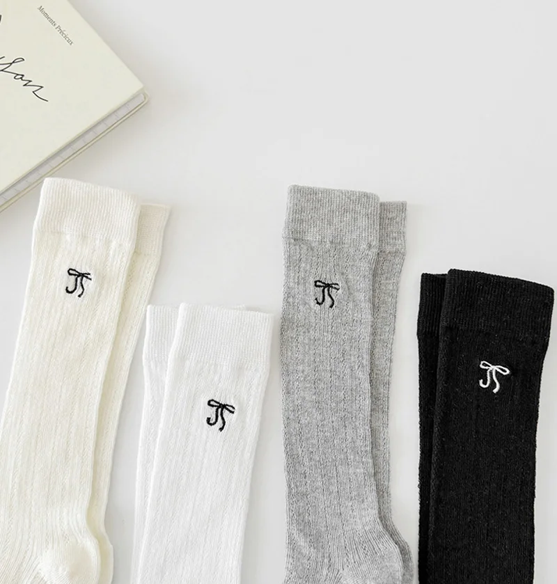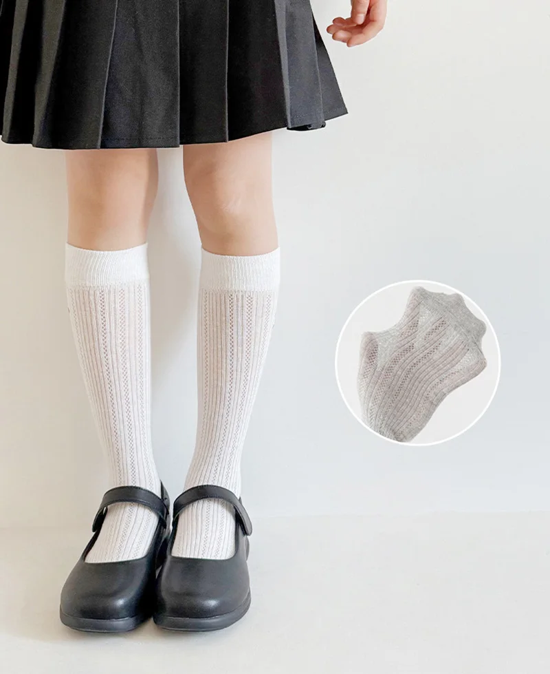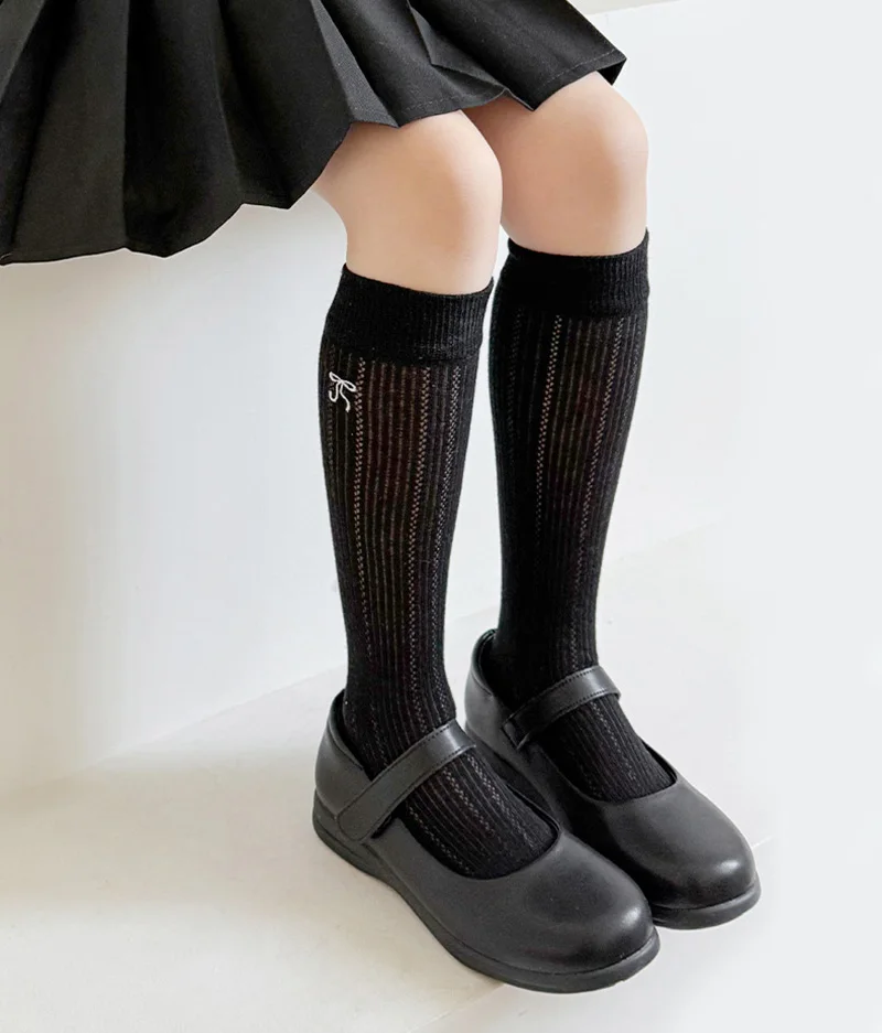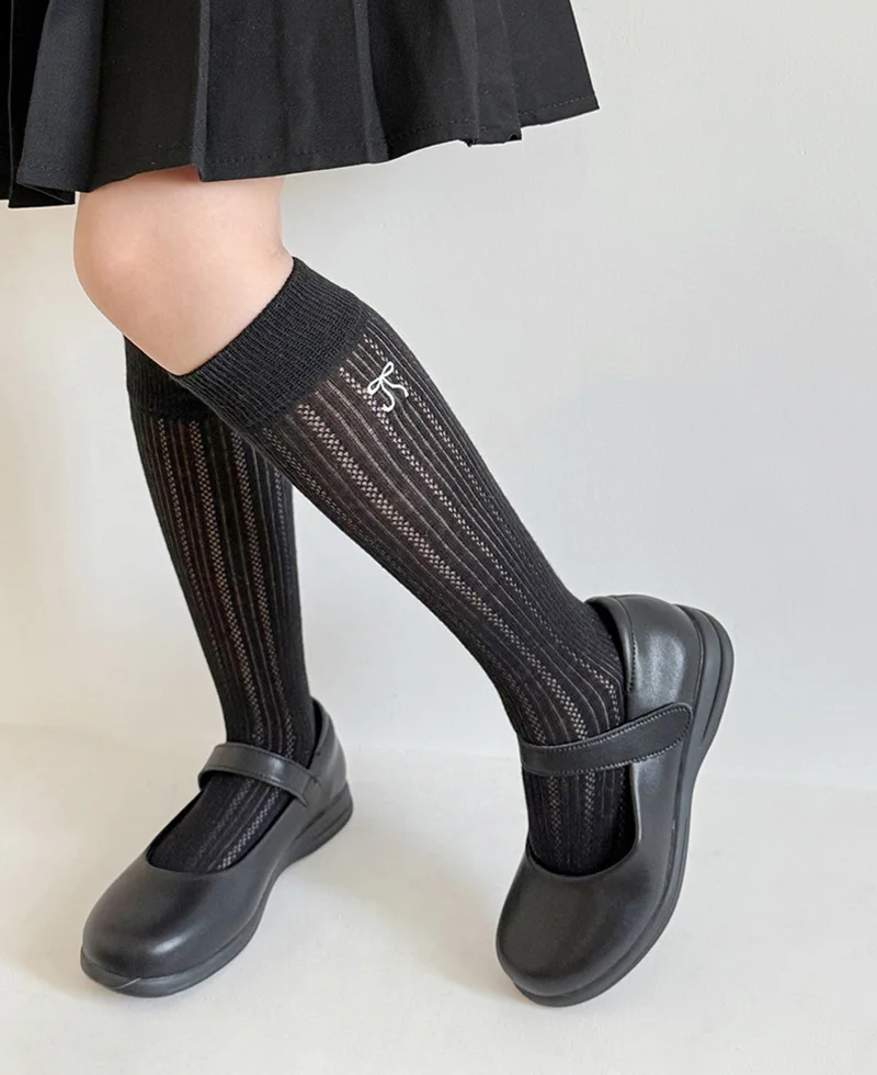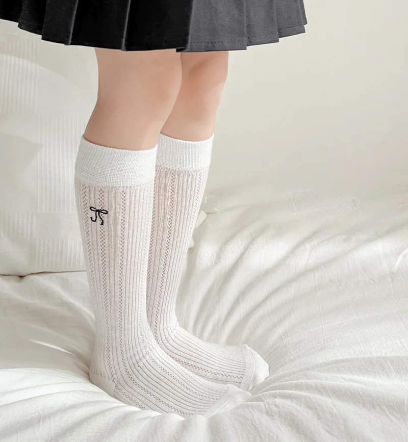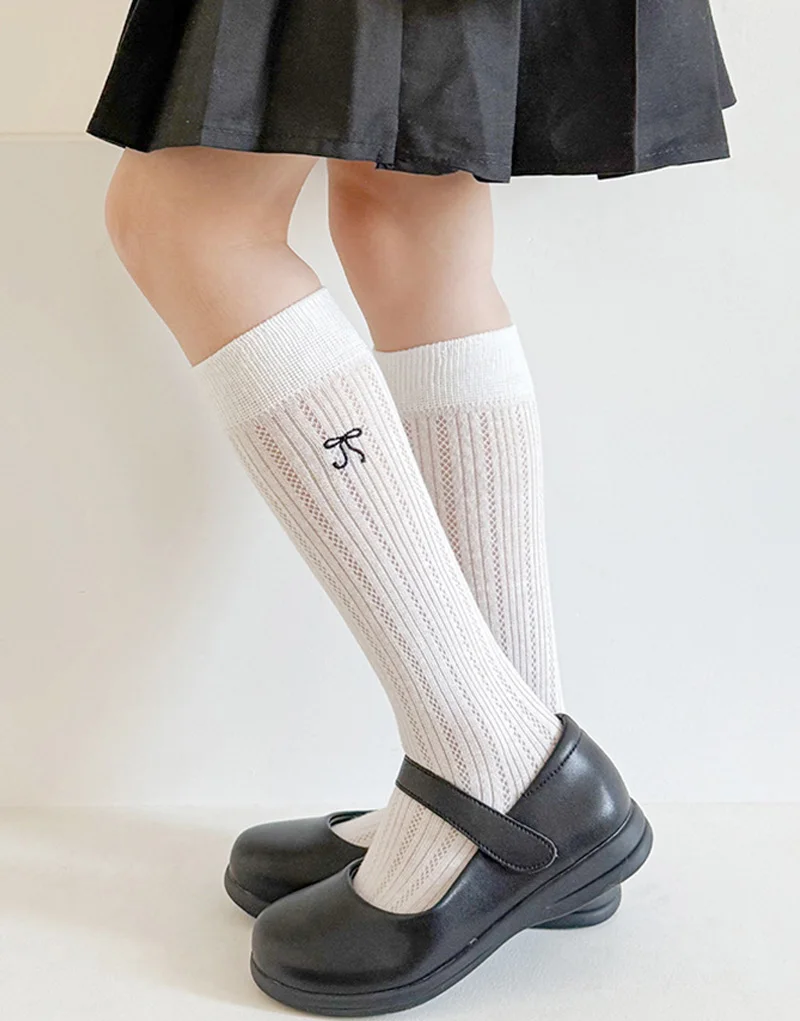 Medias con lazo para niñas, calcetines bordados transpirables de malla de Color sólido, calcetines suaves tejidos con lazo para primavera y verano para niños