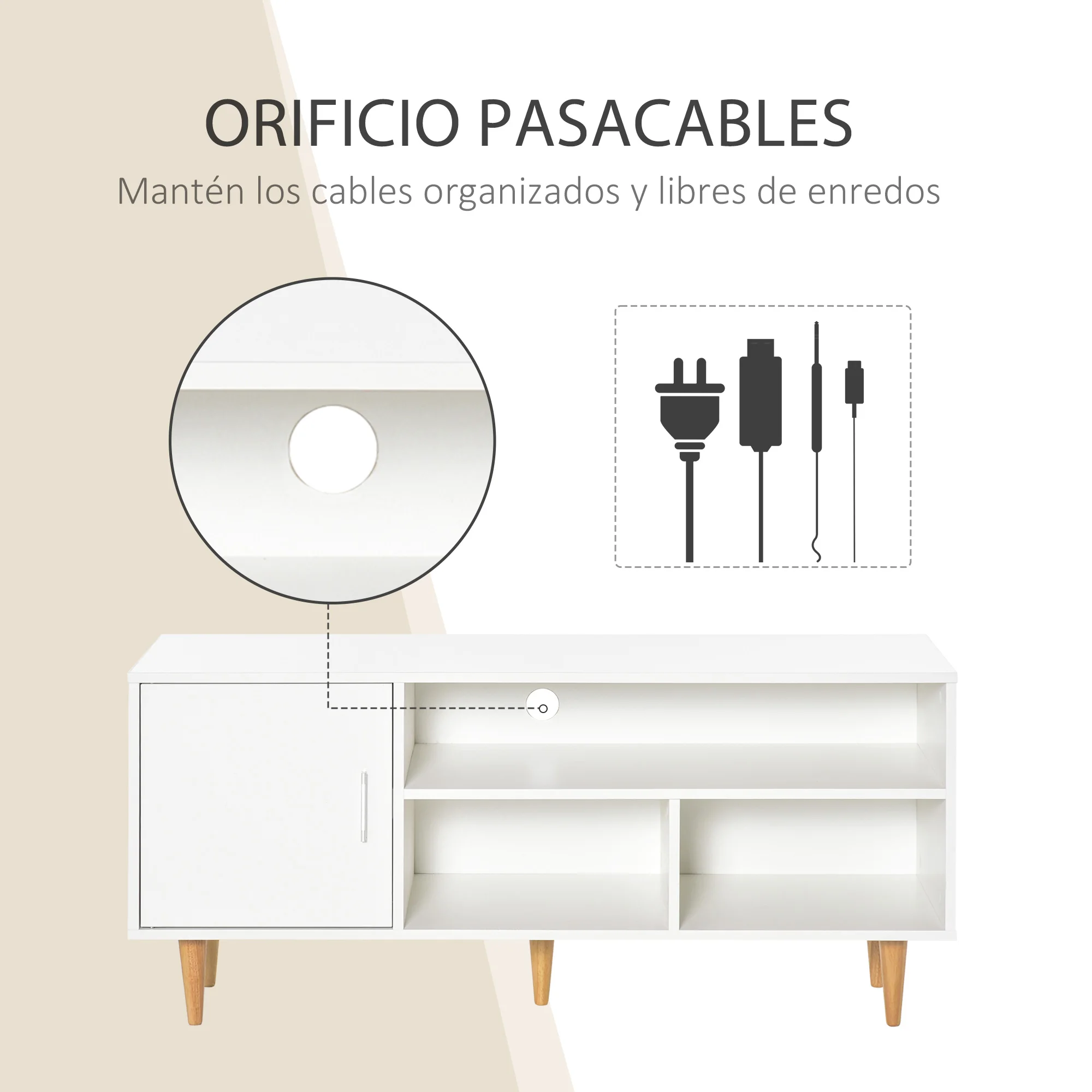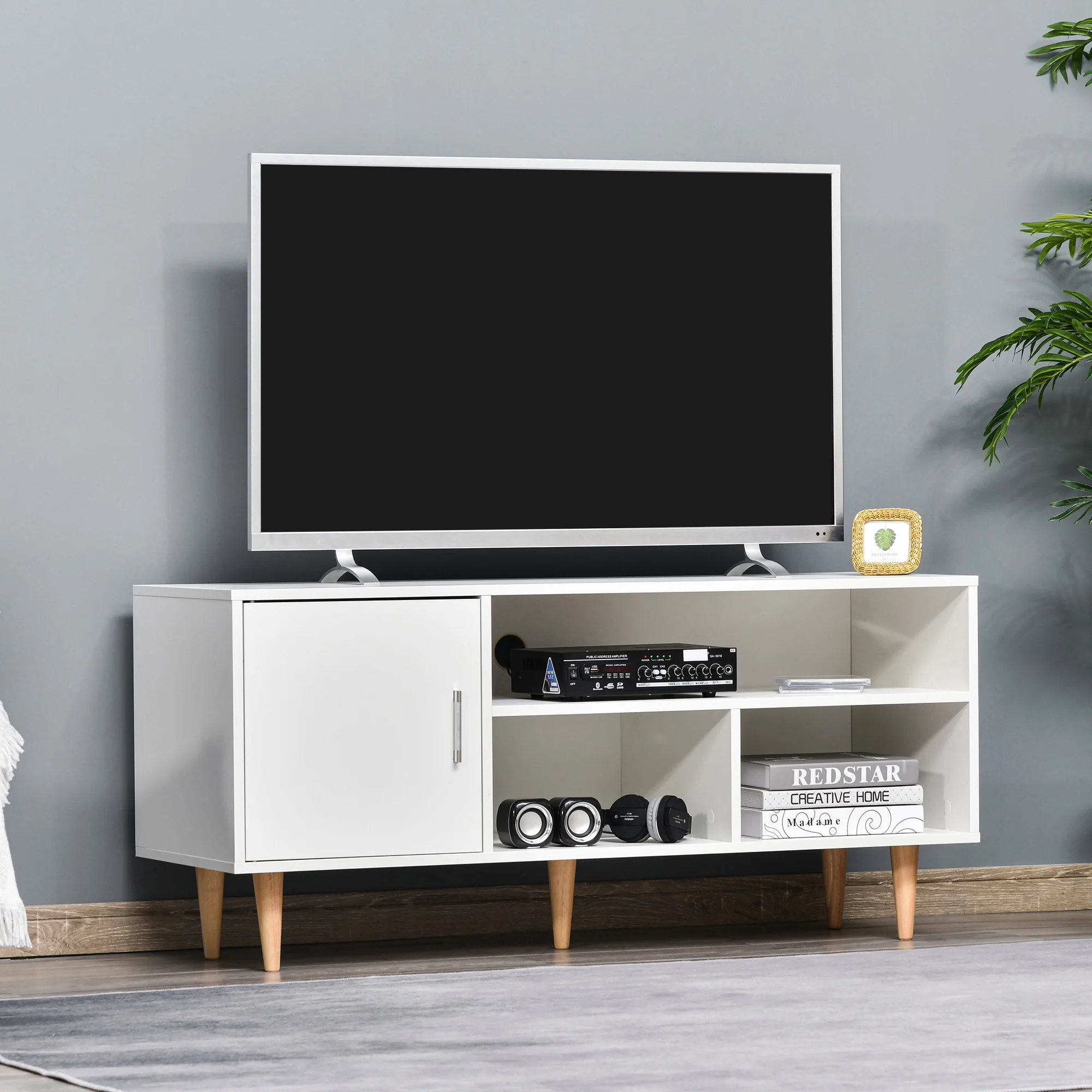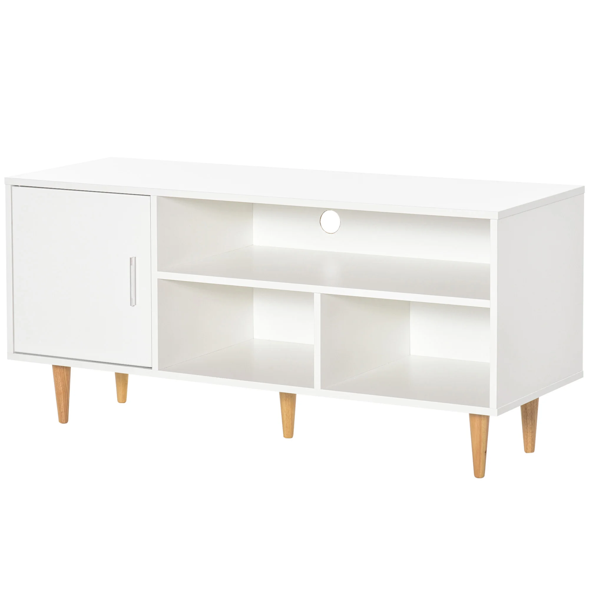 Vous cherchez un meuble TV avec un grand espace de rangement? Alors vous allez adorer ce meuble HOMCOM pour téléviseurs jusqu'à 60 pouces. Il a 3 compartiments ouverts et 1 garde-robe, pour répondre à différents besoins de stockage et en même temps aider votre salon à paraître plus propre. Le trou arrière dans l'un des compartiments facilite la connexion des appareils électriques au courant. Ce meuble est la solution parfaite pour votre téléviseur.