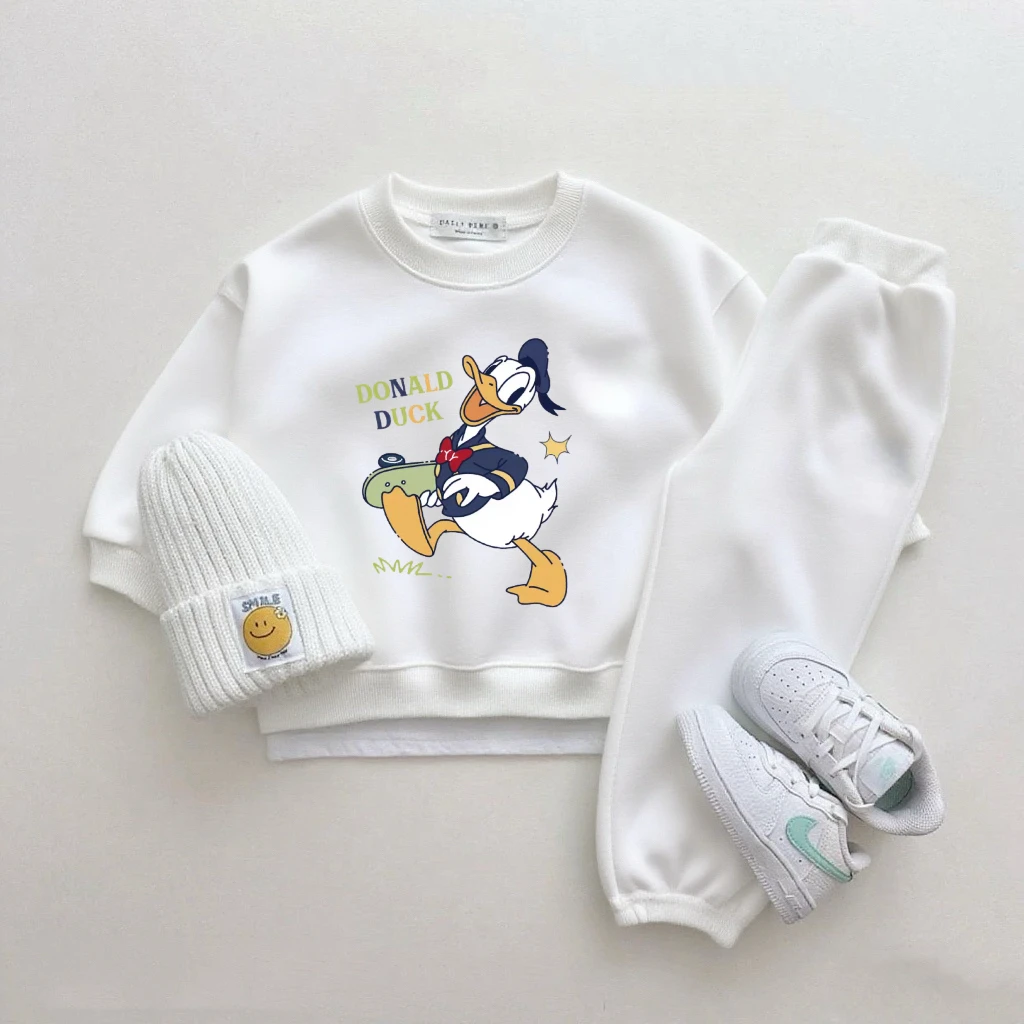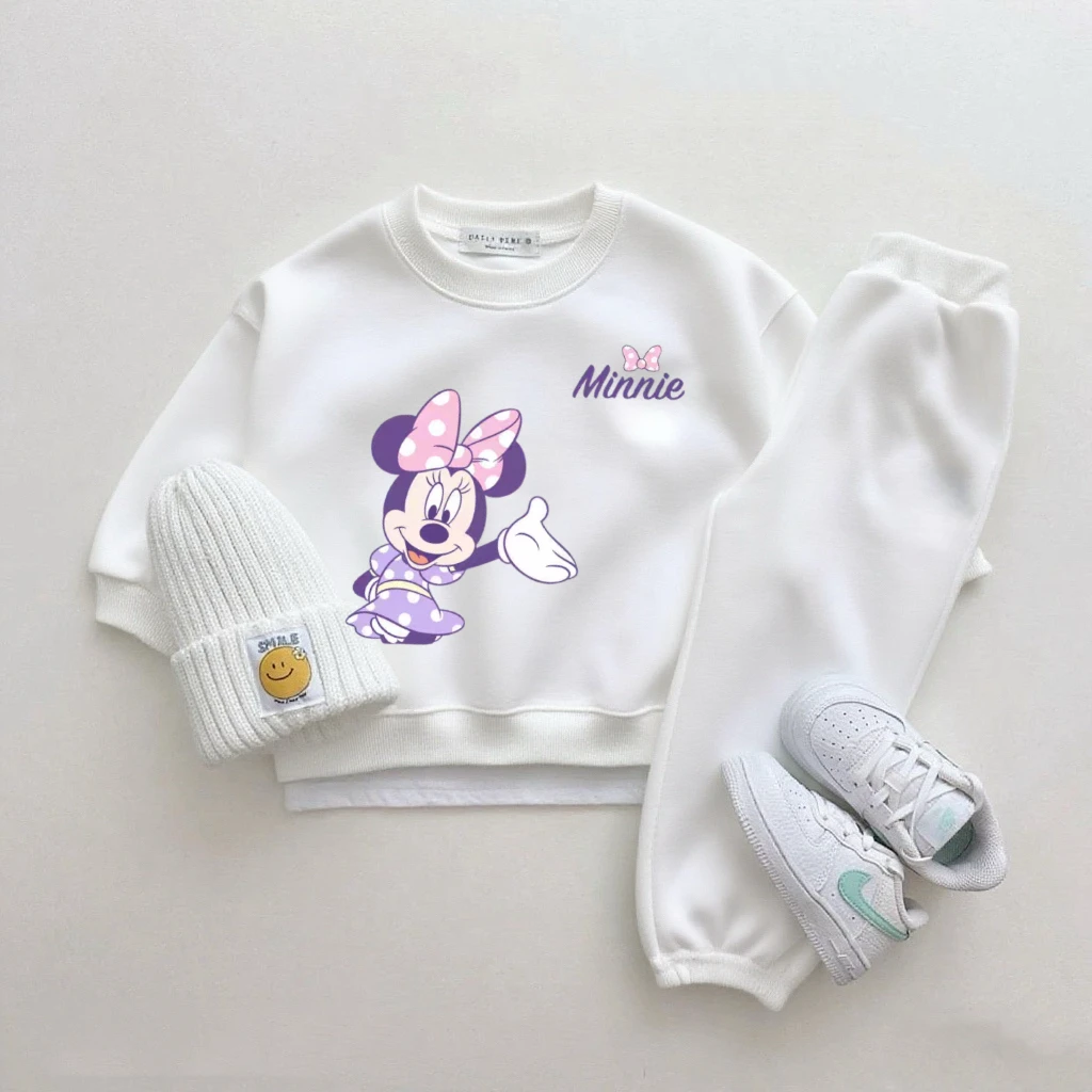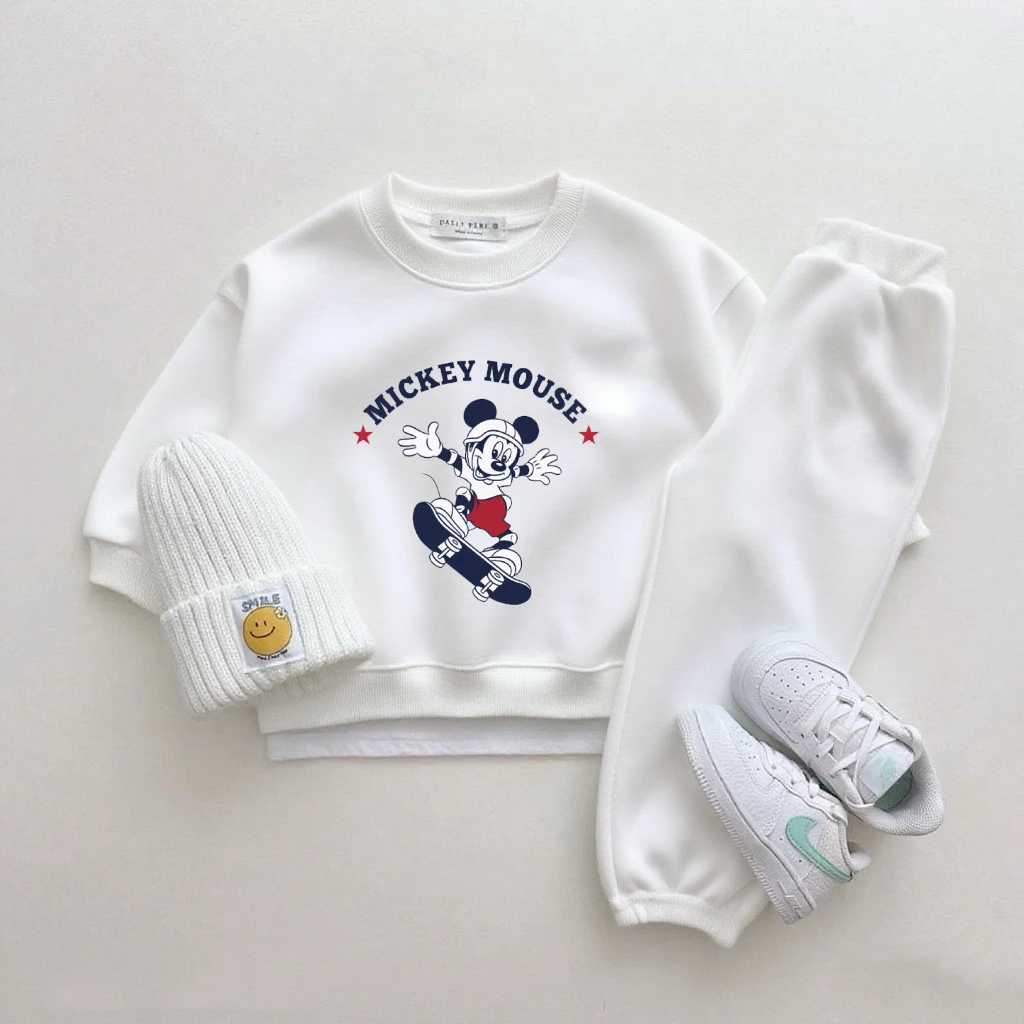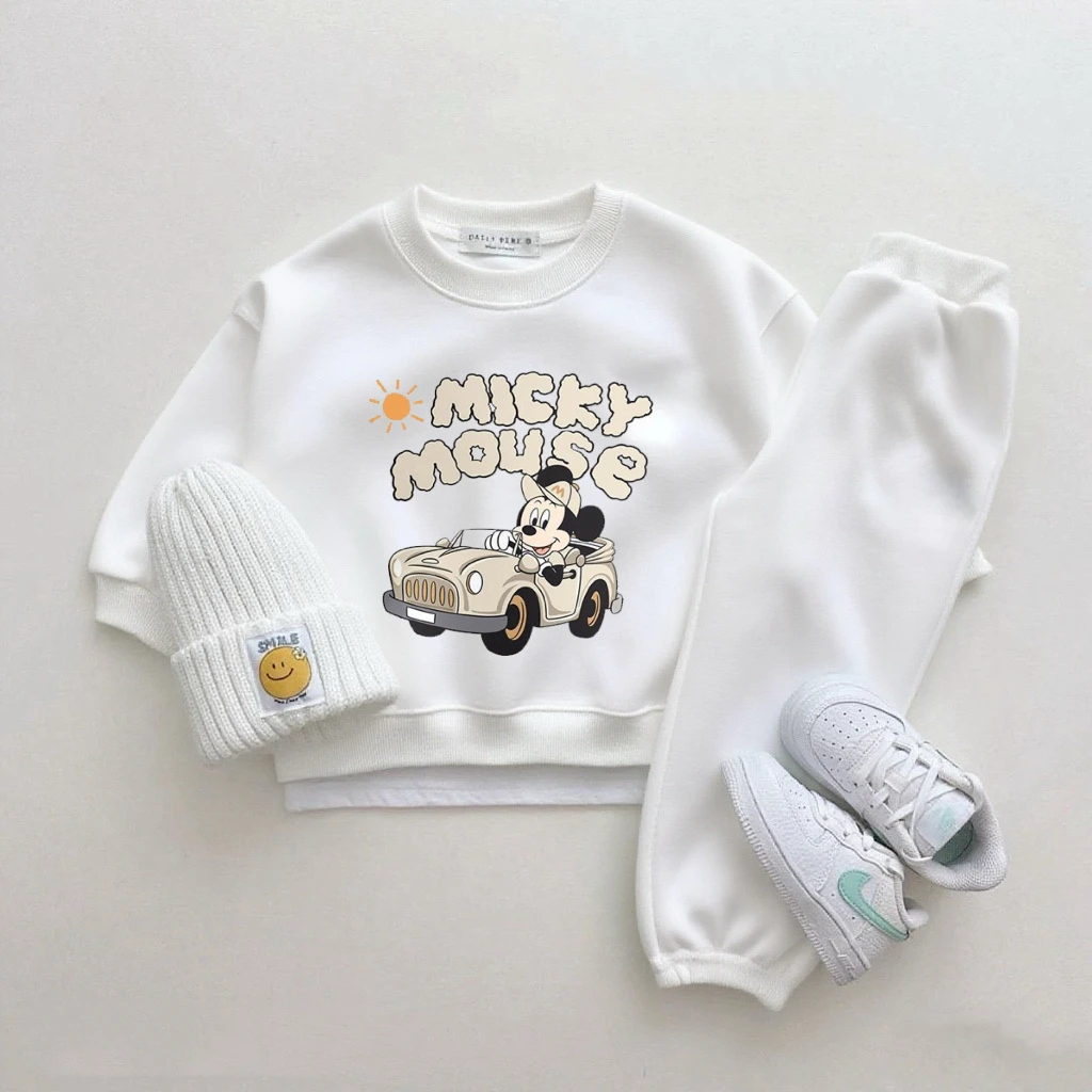 Mickey Tops pantalones de chándal blancos de dos piezas lindo cuello redondo Sudadera con capucha pantalones versátiles nuevos conjuntos estampados de dibujos animados ropa Popular